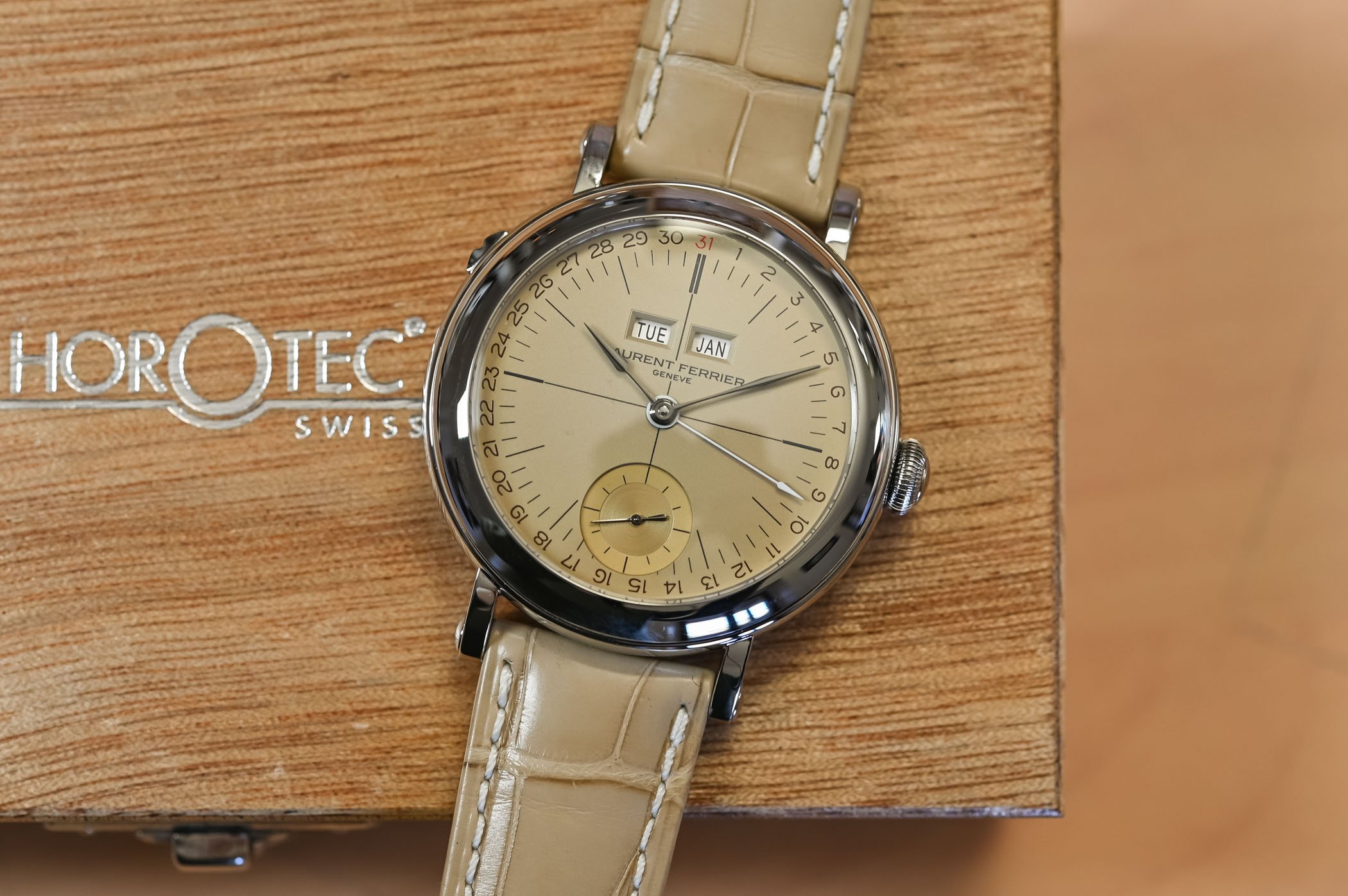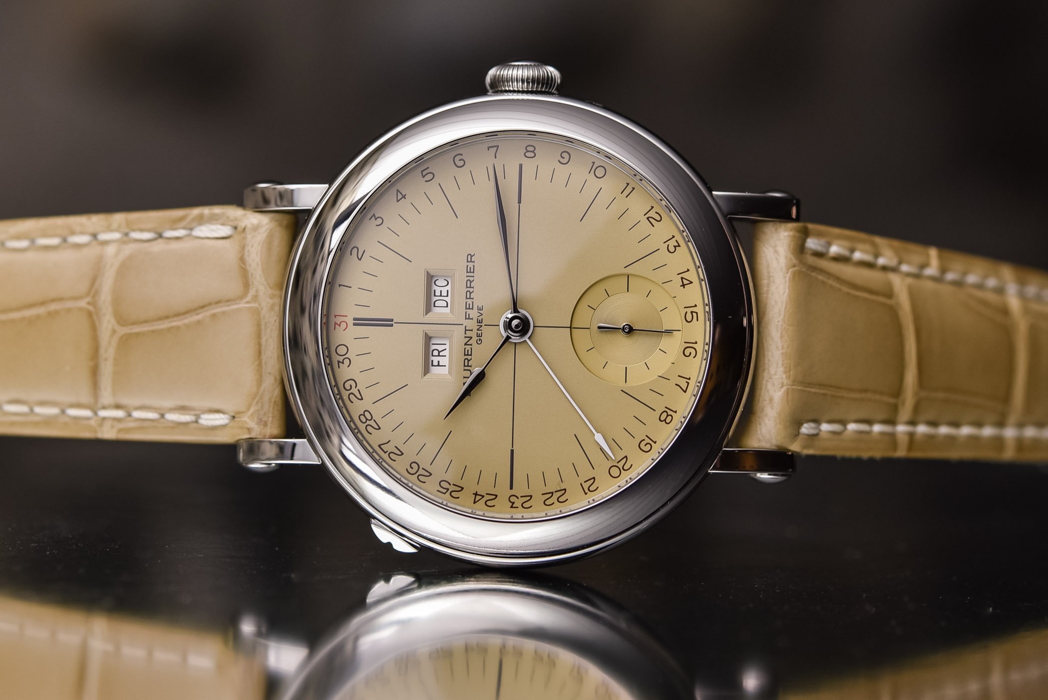 Celebrating the vintage vibe of the Laurent Ferrier Galet Annual Calendar with champagne.