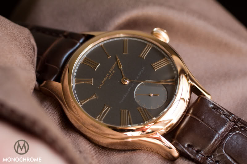 When I visited Laurent Ferrier in his atelier in Geneva recently, he showed me a prototype with a silver dial with vertical satin-brushed finish and red gold hour markers and hands. It looks great, giving the watch an extra classic touch. What do you think?