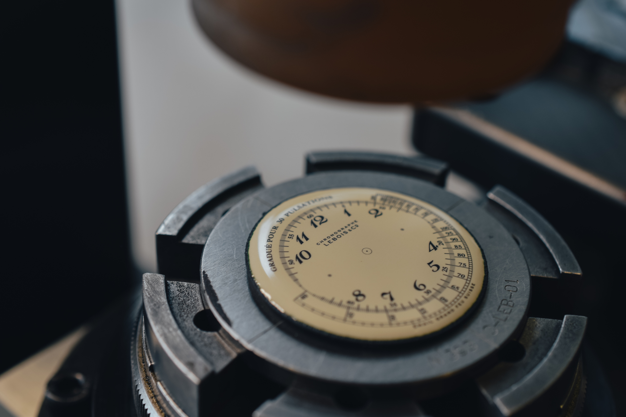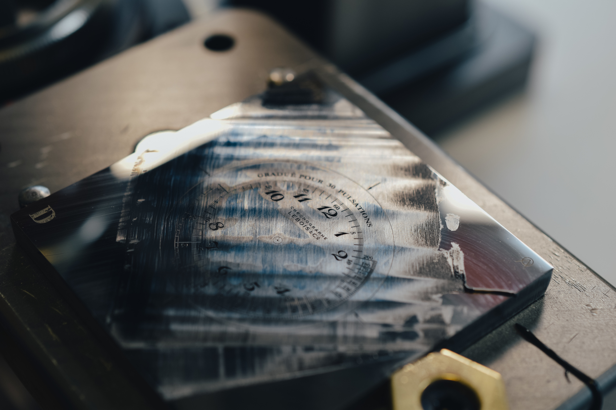 The result is a dial with a warm, slightly antique appeal. Lebois & Co. chose here to use black Breguet numerals and to frame the dial with a pulsation scale, giving it a vintage medical chronograph vibe. Time is indicated by a pair of blackened leaf-shaped hands and the chronograph is a classic bi-compax layout.