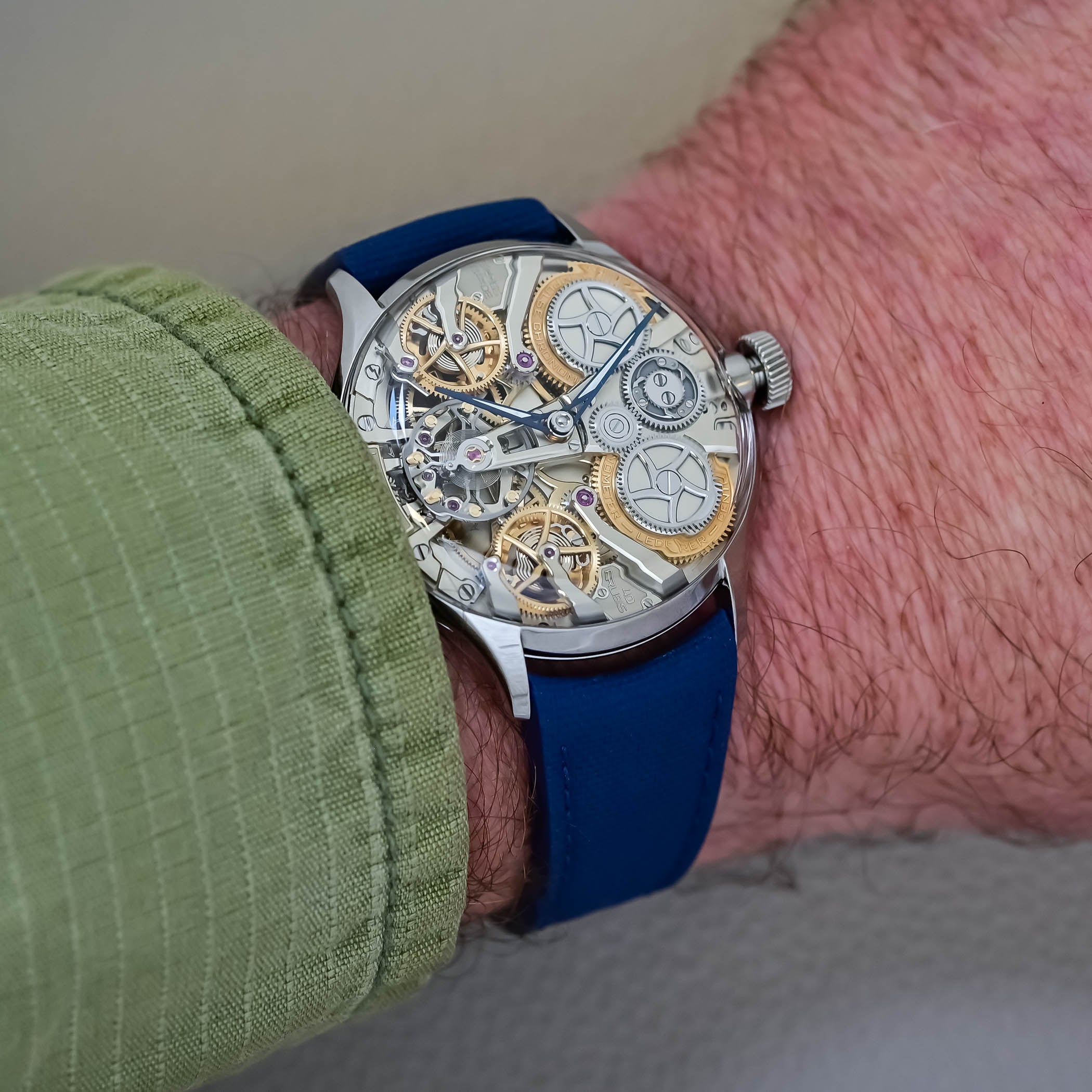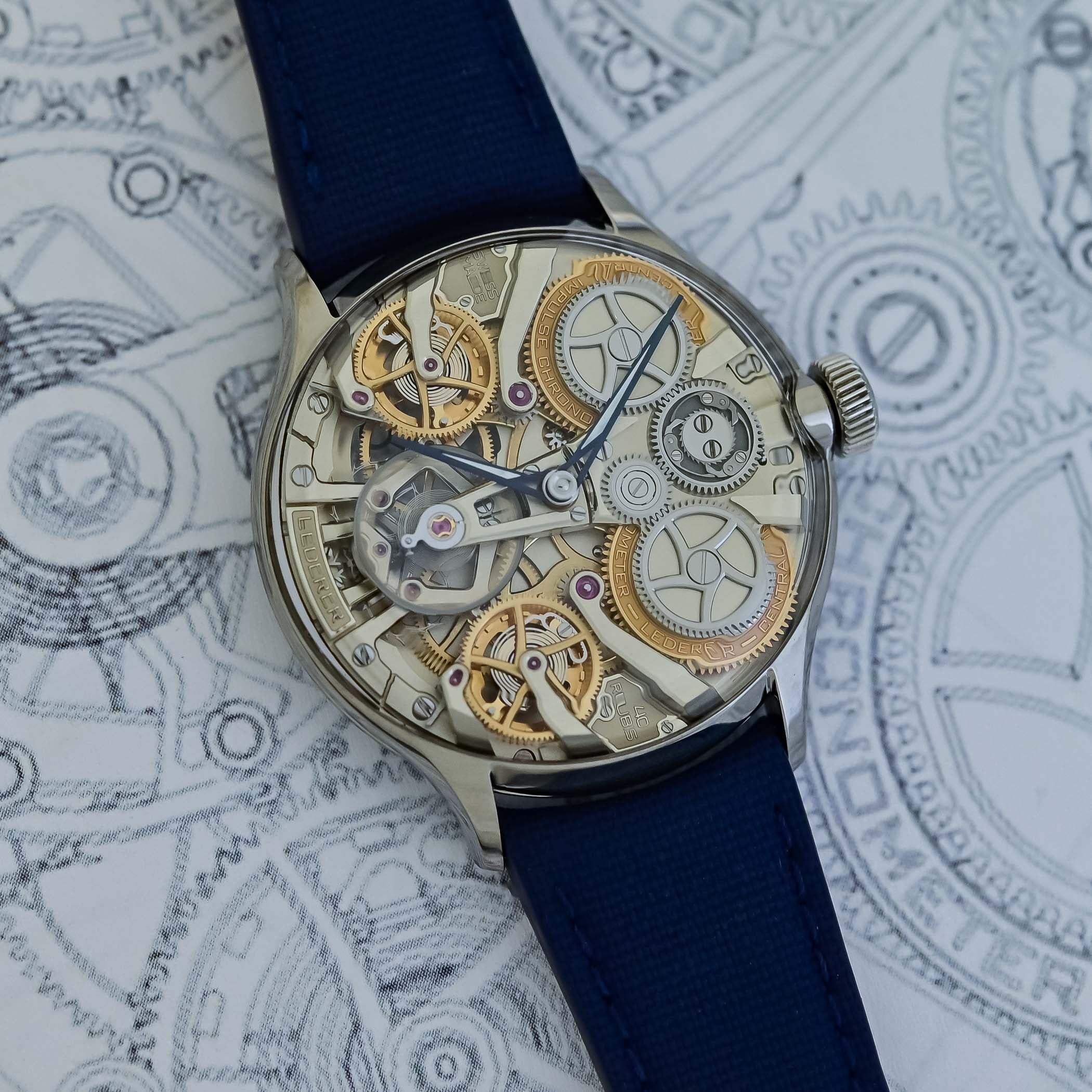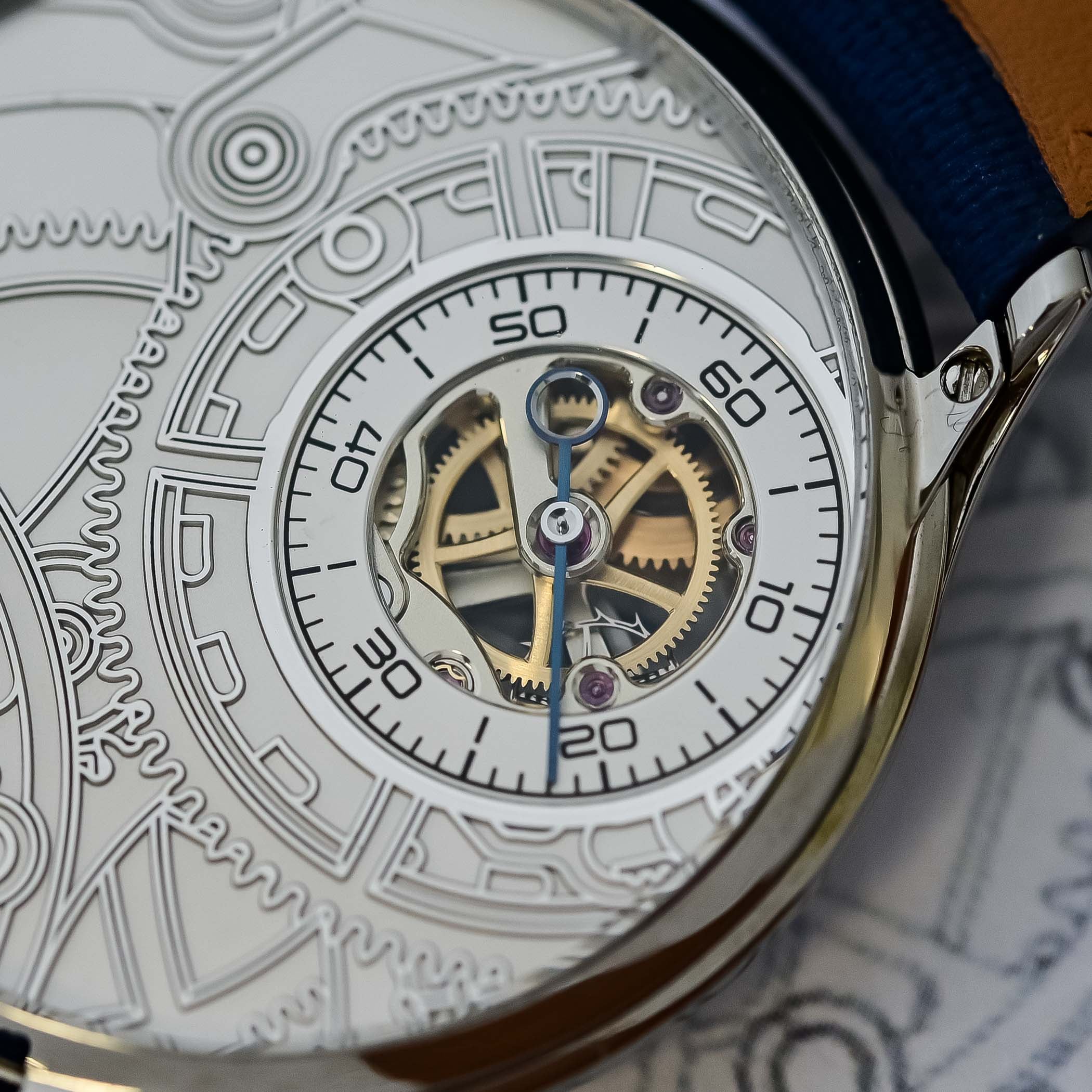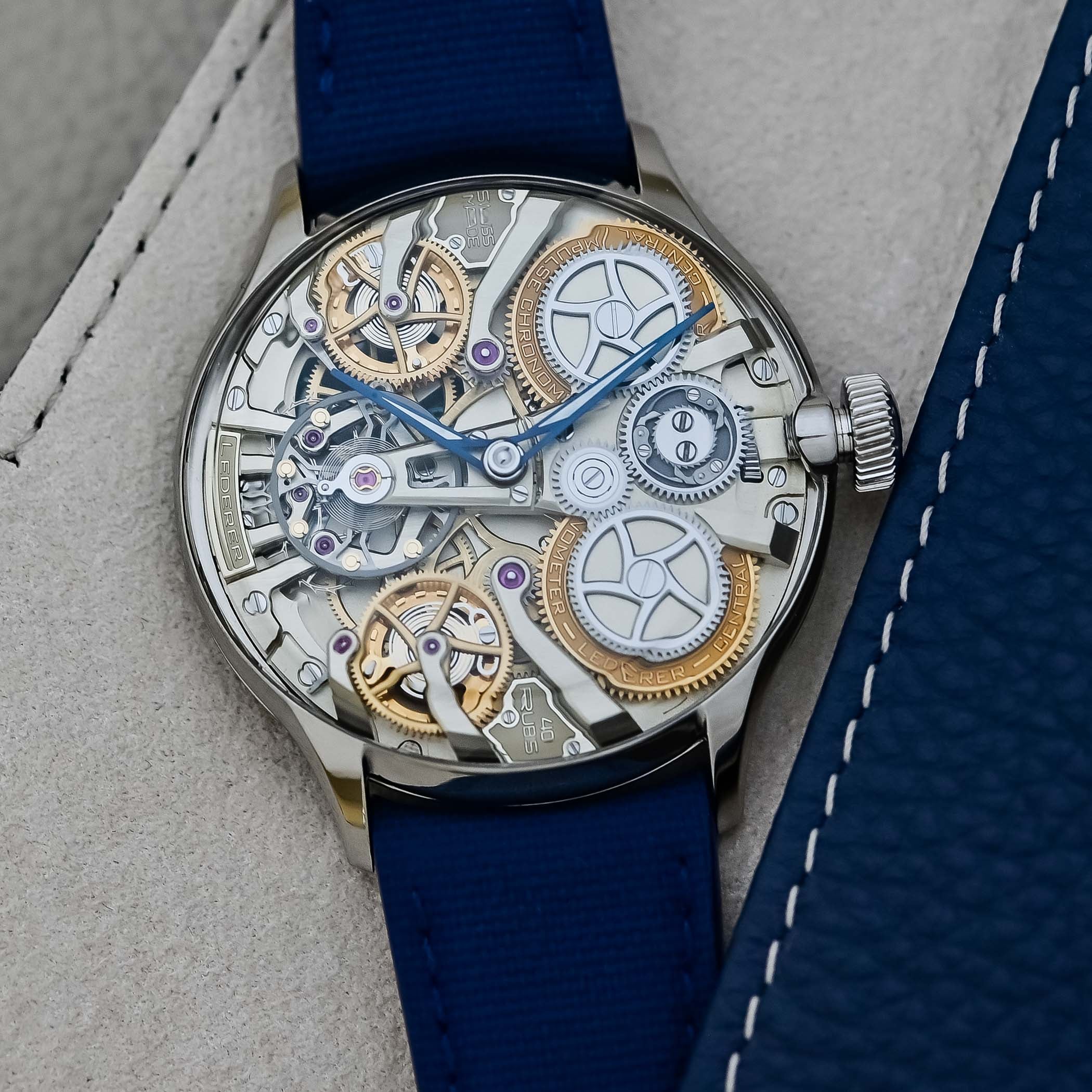 There is no conventional dial as the movement becomes the stage. Every wheel, barrel, and remontoir is visible under the crystal, creating a view that feels very kinetic. Blued skeletonised hour and minute hands float above the exposed gear trains and twin escapements, offering legibility while preserving an unobstructed view of the mechanics. The reverse side is more restrained, featuring an engraved motif inspired by the movement’s blueprint and a small seconds display, whose rhythm mirrors the 15-second cadence of the remontoirs.