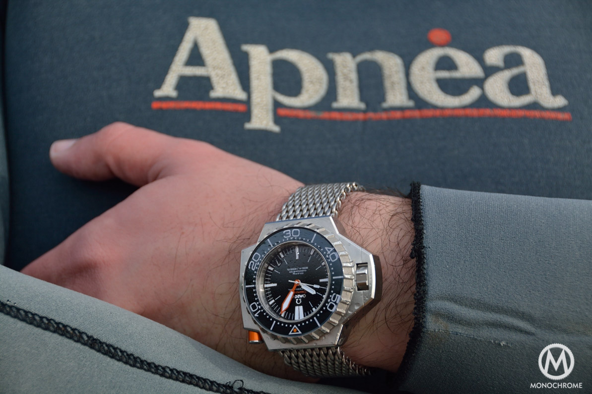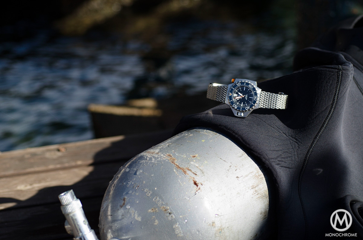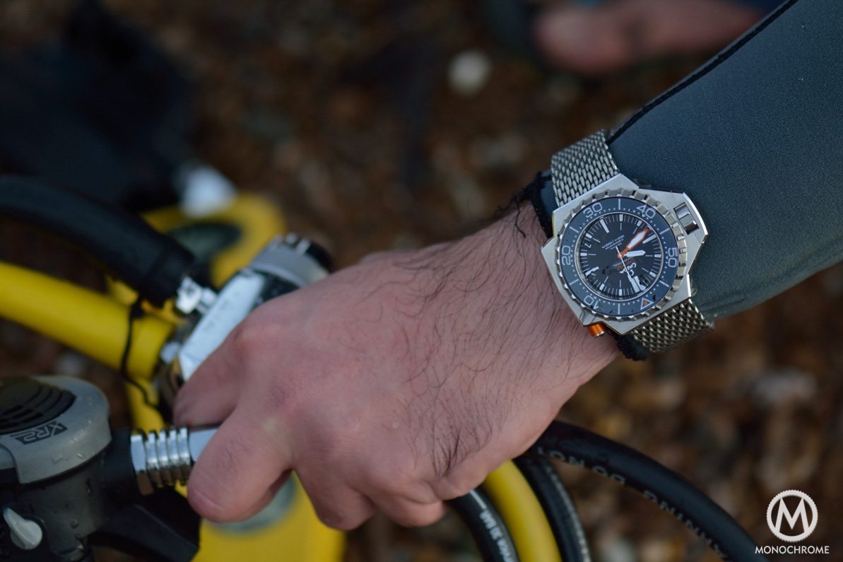 The caliber is hugely important, since it permits the diver to time his descent. The problem here is shock and magnetism. When diving it is very easy to knock the wristwatch on a reef or against a rock since underwater currents are powerful. Impact can cause water ingress due to a ruptured case or a smashed glass, and that’s why the case must be solid, and the glass must be extremely hard (usually sapphire crystal), protected by a thick disc, sealed to the case and secured in place with a locking ring. The force of the knock creates a momentum of its own which continues to act upon the delicate parts inside the watch, even when the outer case has reached a standstill. Violent shocks are the most fatal enemy for a mechanical wristwatch, and the common example of a watch stopping after it falls from our hand or starting to exhibit abnormal timing rate is not rare. A good dive watch must have an extremely well thought-out anti-shock system, and internal shock resistance built into the jewels, which retain the parts of the movement most at risk (Oscillating balance, for example). The ISO standard (we explained it in our review of the Seiko SKX007) for a dive watch covers also the ability of the timepiece to withstand magnetic fields, which can cause components like the gear-train or the hairspring to run poorly. The faraday cage or use of non-metallic hairsprings are ways to deal with this issue.