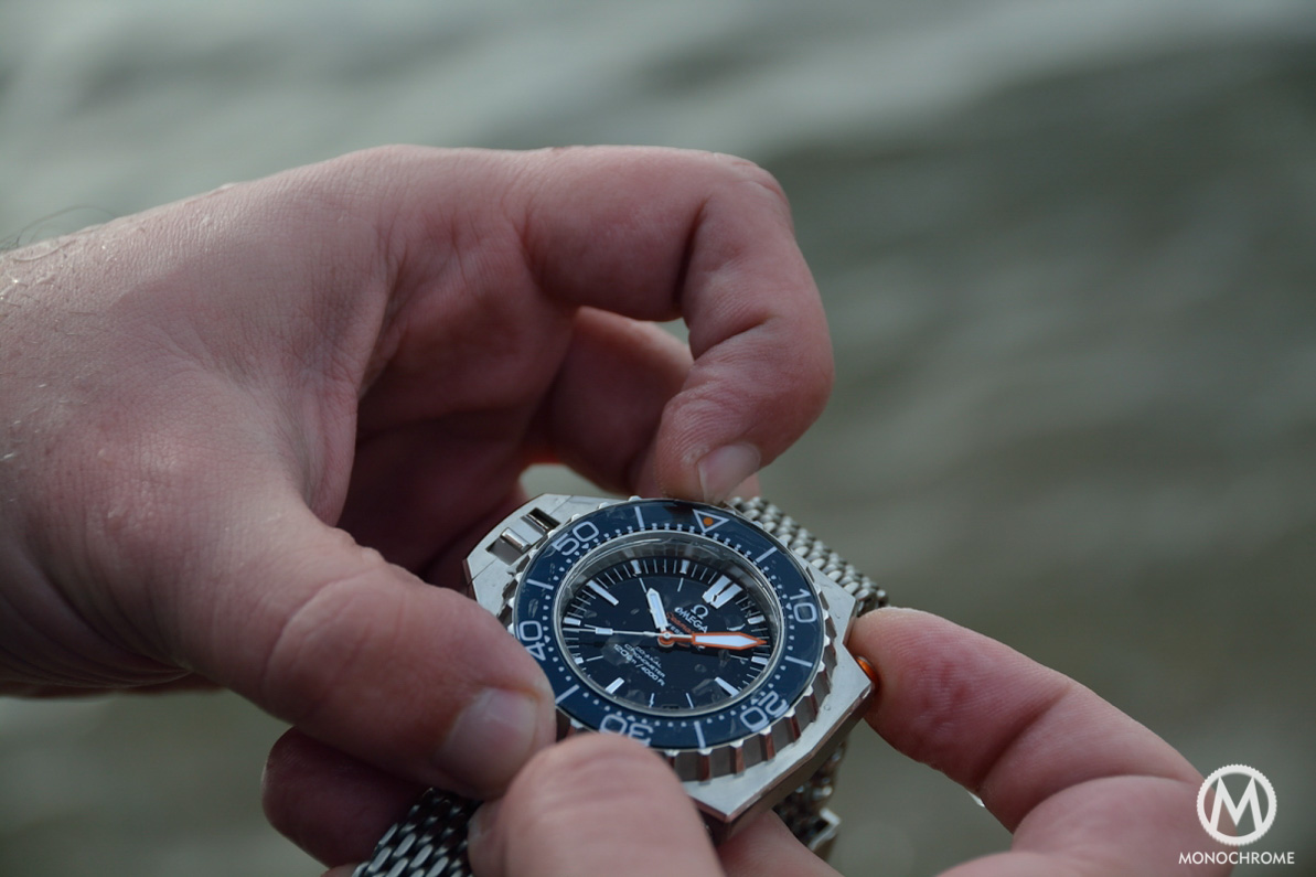 The ability to record time is crucial for all underwater activity. There are a number of different methods of recording the amount of time the diver has spent submerged, including the chronograph functions (see the Omega Seamaster 120m Chronograph Big Blue), the simplest method is the bezel. As many things that are taken for granted nowadays, the rotating bezel in watches has been developed by the armed forces, and was incorporated in dive watches as well with the addition of time marked increments on the ring to allow the elapsed time so as to be easily read. The bezel must be reliable in its use, must have a serrated edge in order to be controlled by the divers usually wearing gloves and also must not be easily knocked off from the position the diver set before the dive.