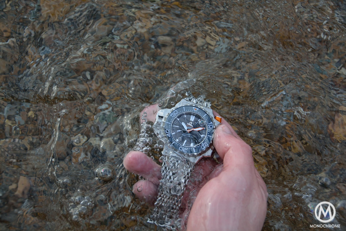 The crown protecting mechanism is essentially the same as the original, you have to unscrew the crown guard before being able to wind the watch and set the time and date. The difference is that the crown guard of the current Ploprof 1200m stays in one piece instead of only unscrewing the top of the crown guard. The dial is another key difference: while it retains the character of its ancestor it oozes quality. There is an applied Omega logo, all the markers are applied as well, something that seems to give the dial a greater sense of depth. Super-luminova that emits a blue colour is generously applied to the dial, hands and the bezel as well. The hands are perfectly finished and the big orange hand is a joy to look at.