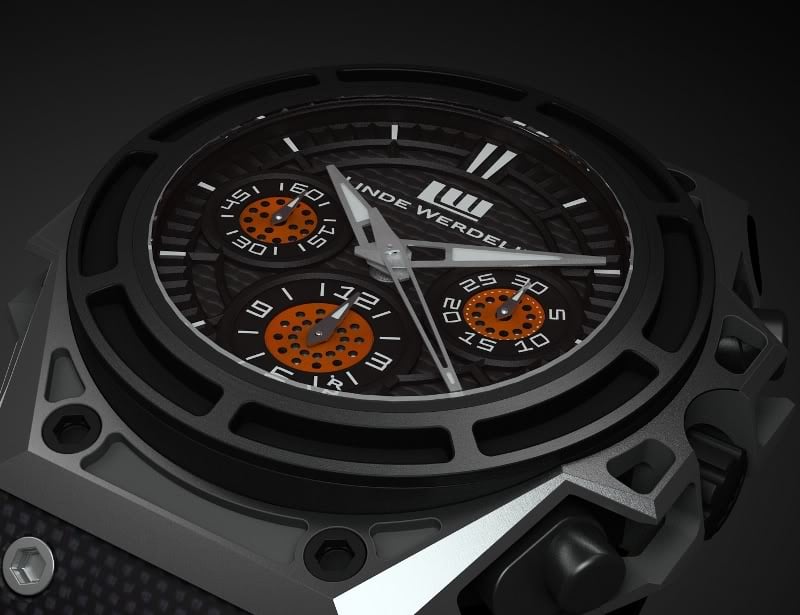 For now we have to settle for these computerrenderings, but they give quite a good idea of what the new SpidoSpeed Black/Orange will look like. The centre part of the case, the crown, chronograph pushers and several other parts have been DLC black coated. The outer case, in which the centre parts is incorporated, remains uncoated, which gives a great visual effect of depth.