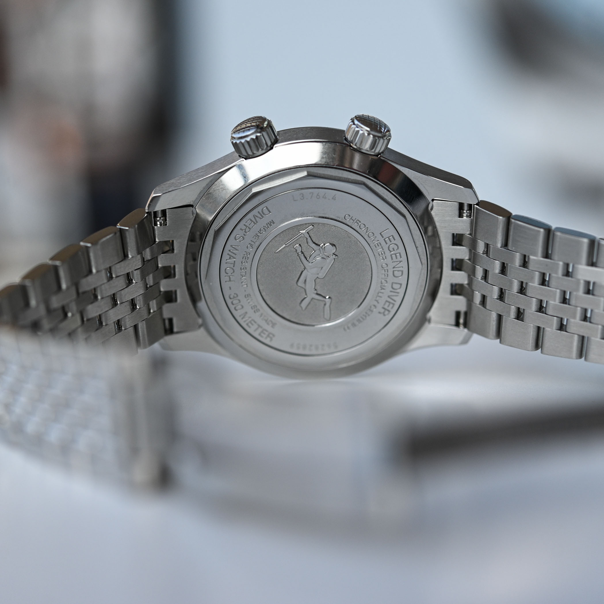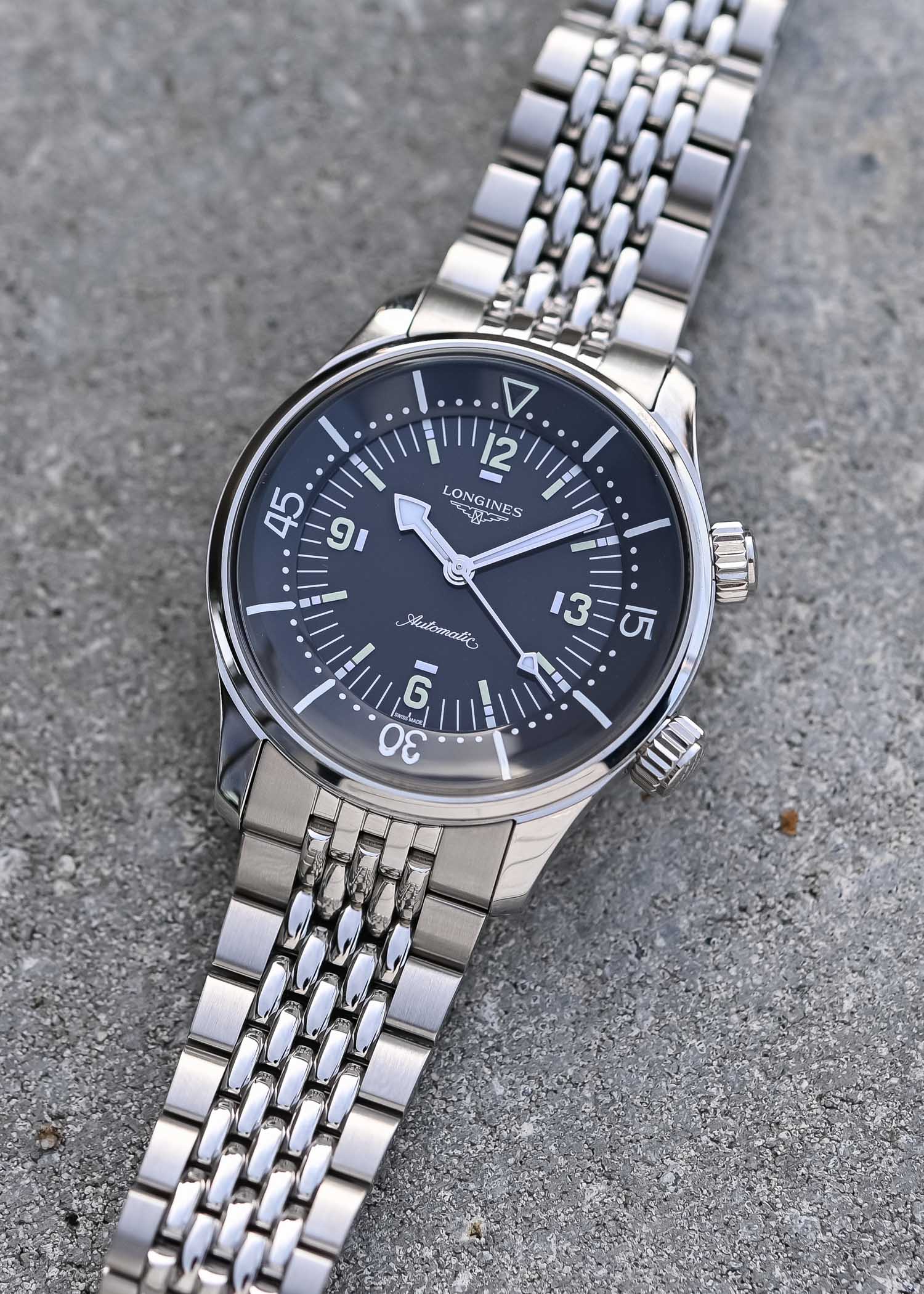 Powering the 39mm Legend Diver is the COSC-certified L888.6 automatic. It has 21 jewels, beats at 25,200vph (3.5Hz) and comes with a 72-hour power reserve (up from 60 hours with the 42mm time/date model and calibre L888.5). It features a silicon balance spring for magnetic resistance (ISO 764) and functions are limited to central hours, minutes and hacking seconds. It’s based on the ETA A31.L11 and is exclusive to Longines.