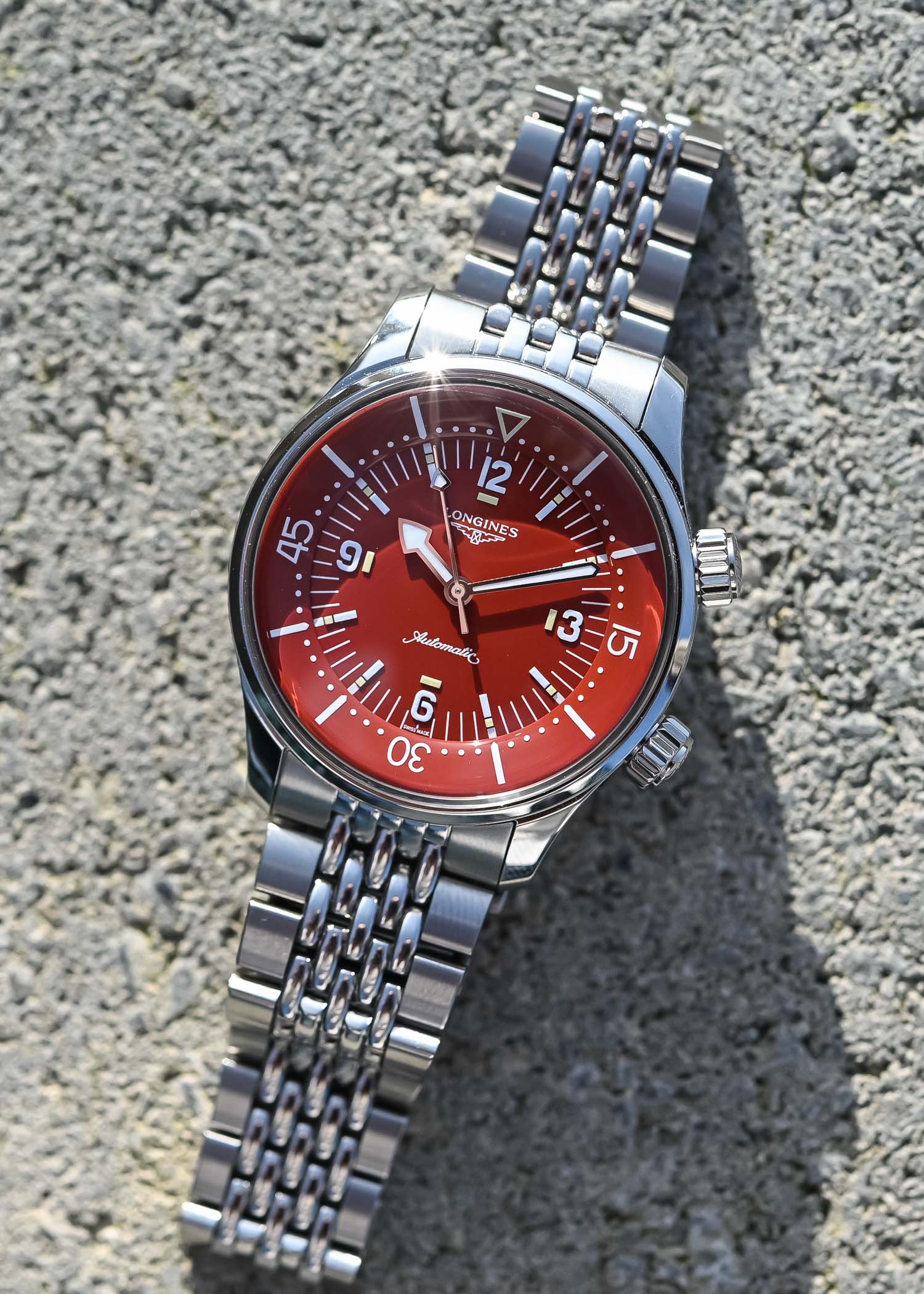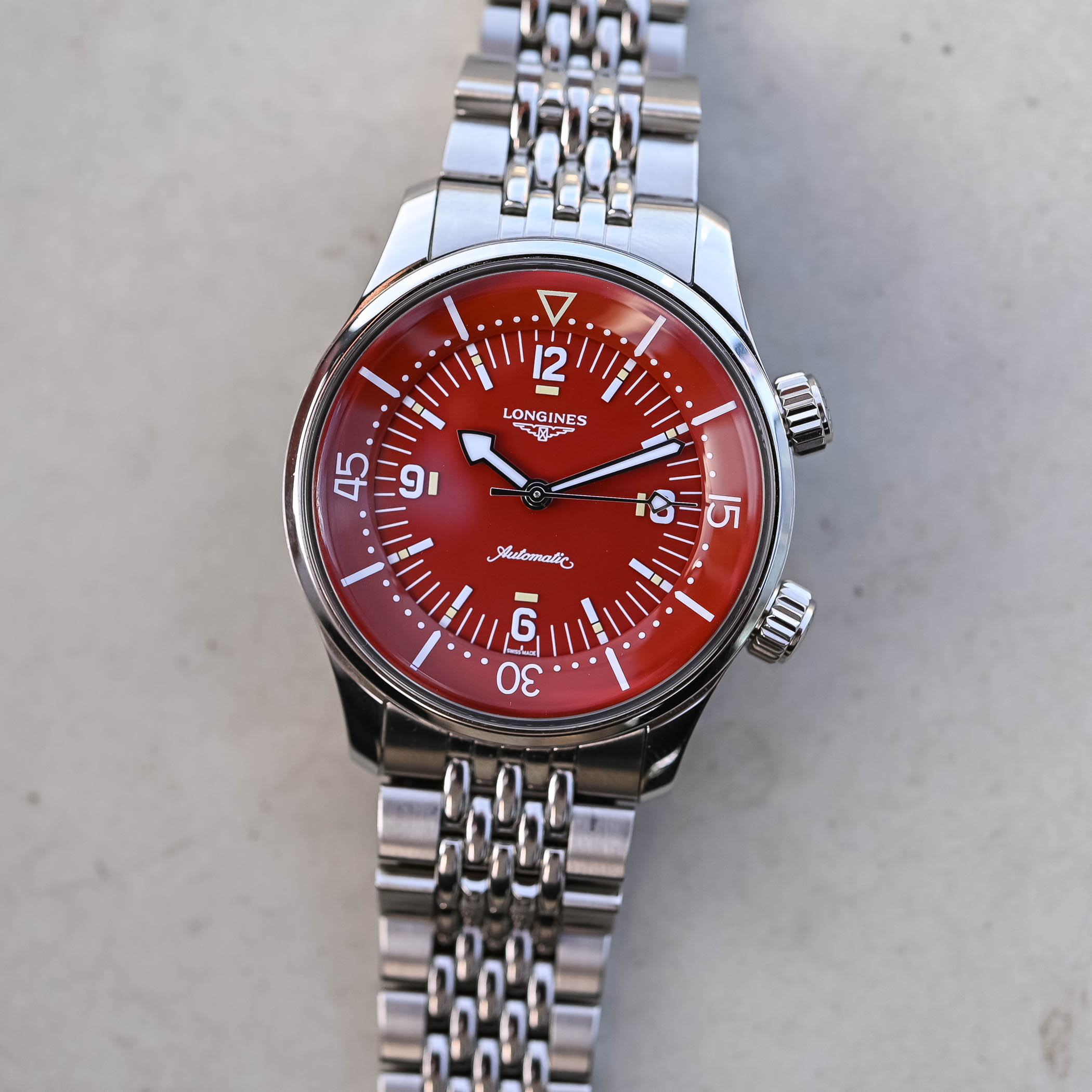 New on the Longines Legend Diver 39mm are three new polished lacquered dials in green, terracotta and anthracite grey, increasing the dial options to a total of five (with black and blue from 2023). Raised Arabic numerals at 12, 3, 6 and 9 o’clock are coated with Super-LumiNova, along with segmented indices every five minutes. The rhodium-plated arrow hour and minute hands also have Super-LumiNova inserts, while the seconds hand has a lume aperture that traditionally confirms that the watch is running during low light dives. The bidirectional internal rotating bezel has a 60-minute scale and matches the dial colour. As mentioned, the dial lacks a date window.