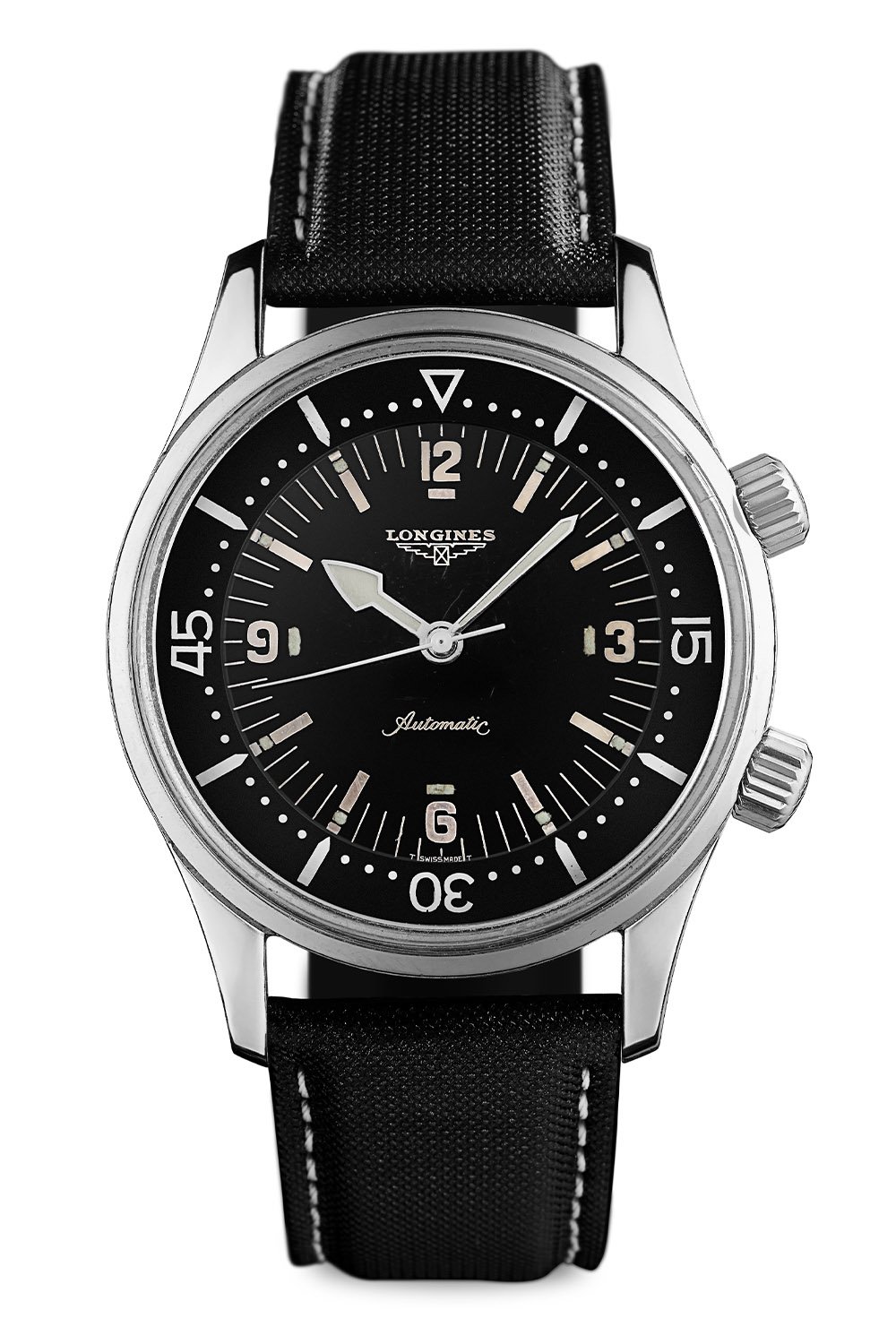 The modern Legend Diver is a faithful recreation of a very desirable dive watch created by Longines in the early 1960s, the Ref. 7042. This watch featured an oversized compressor case – with twin crowns and an internal rotating bezel – as well as a highly recognisable, rather elegant black dial with painted, luminous Arabic numerals and elongated minute markers.