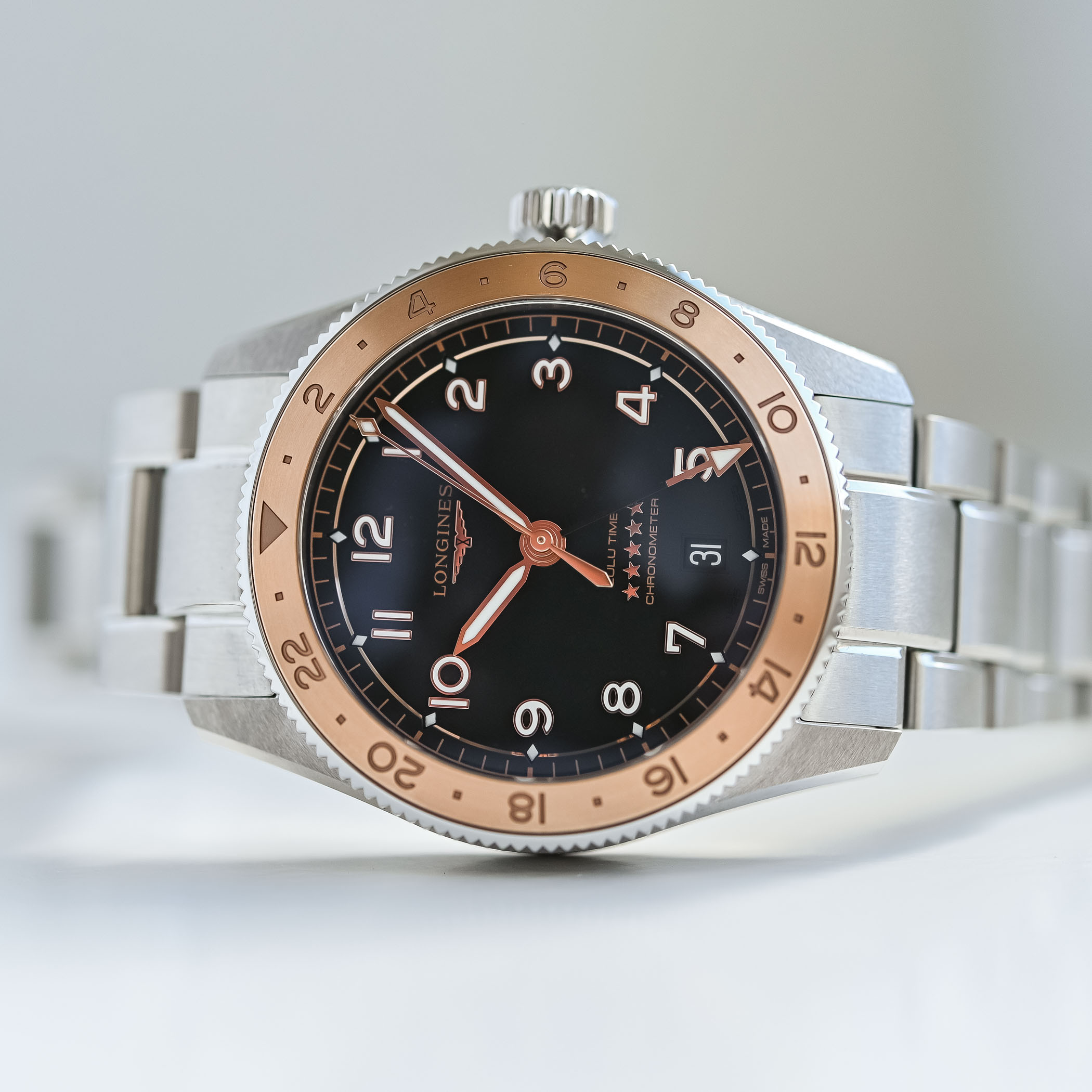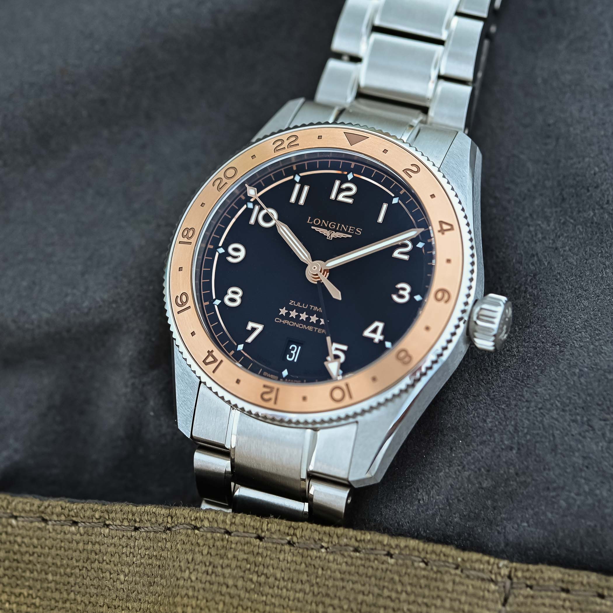 The Longines Spirit Zulu Time collection was introduced in 2022 and has since become a very popular choice for enthusiasts and collectors. The solidly built watches come in multiple sizes, materials and colour combinations, which now expands once more with the Spirit Zulu 1925. It uses the more compact 39mm stainless steel case we’re already familiar with from previous editions. Fitted with a bidirectional rotating bezel, it tops out at 13.25mm in height. The bezel itself has an 18k rose gold capped insert with a 24-hour scale engraved into it.