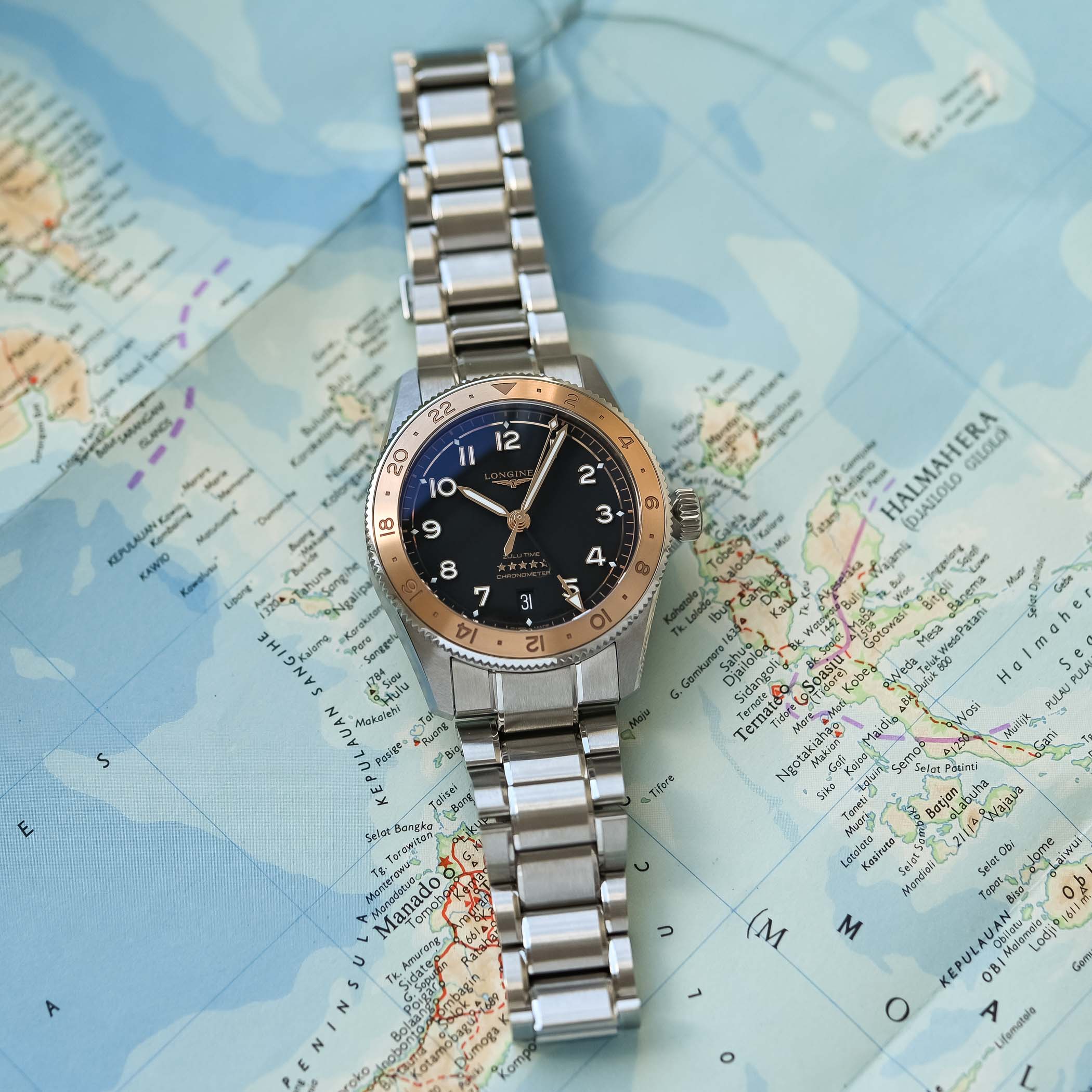 One watch, however, means more to the present-day Spirit Zulu collection than all of these, and that is the 1925 Zulu Time (see below). This was the first wristwatch to display both local time and a second timezone on one dial. Named after the time format as used in military aviation, the Zulu Time had a square case, a double scale dial and a fourth central hand for the second time zone. The little flag you can see below the Longines name refers to Zulu Time, which is the time at the prime meridian, otherwise known as Greenwich Mean Time, GMT, or Coordinated Universal Time, UTC in short. That very watch also served as the inspiration for the current Spirit Zulu Time collection, at least by name. Coming full circle, the new Longines Spirit Zulu Time 1925 celebrates that milestone watch from 1925. And, a century onward, the use of a GMT watch is still very much alive, as it’s perfect for frequent travellers crossing multiple time zones in their adventures!