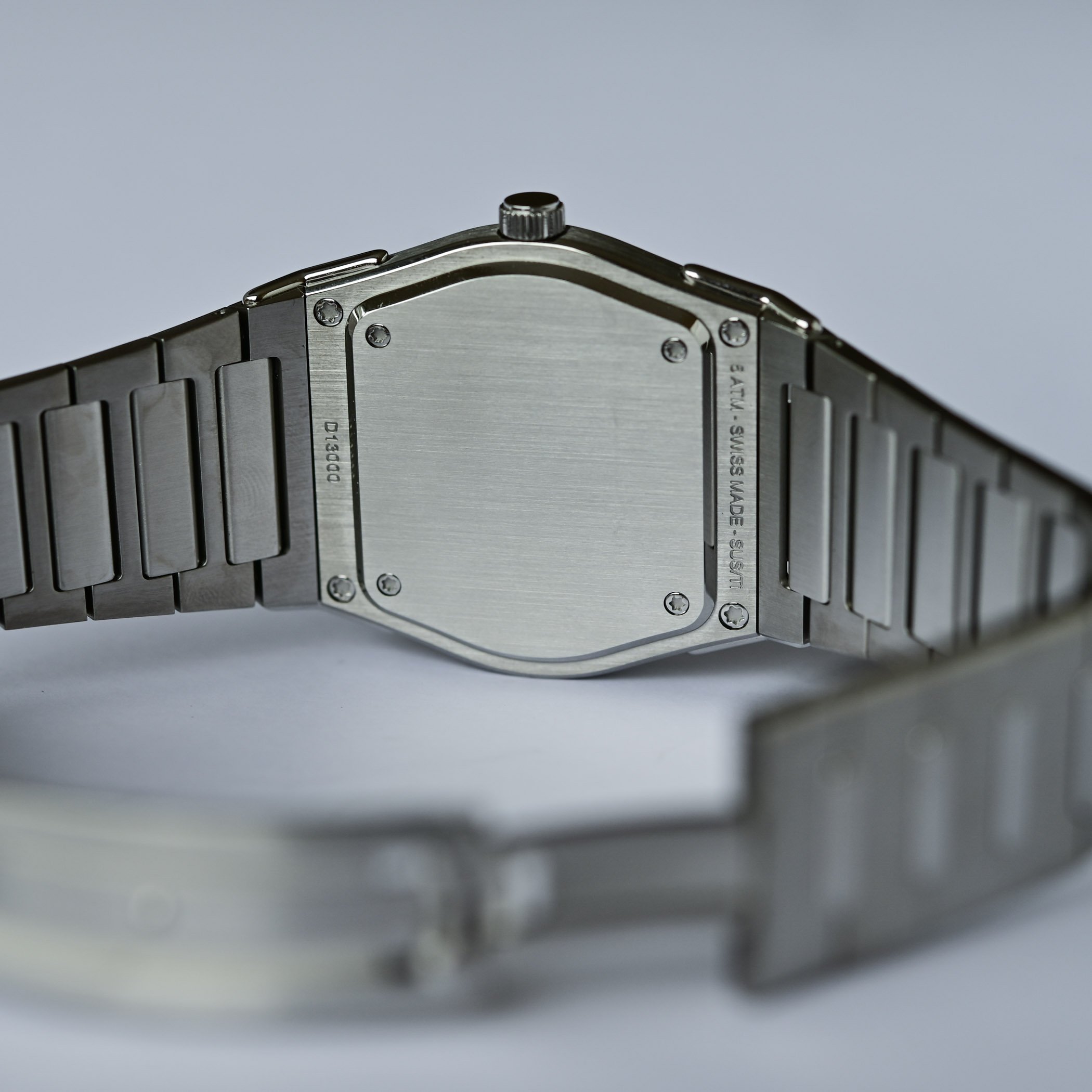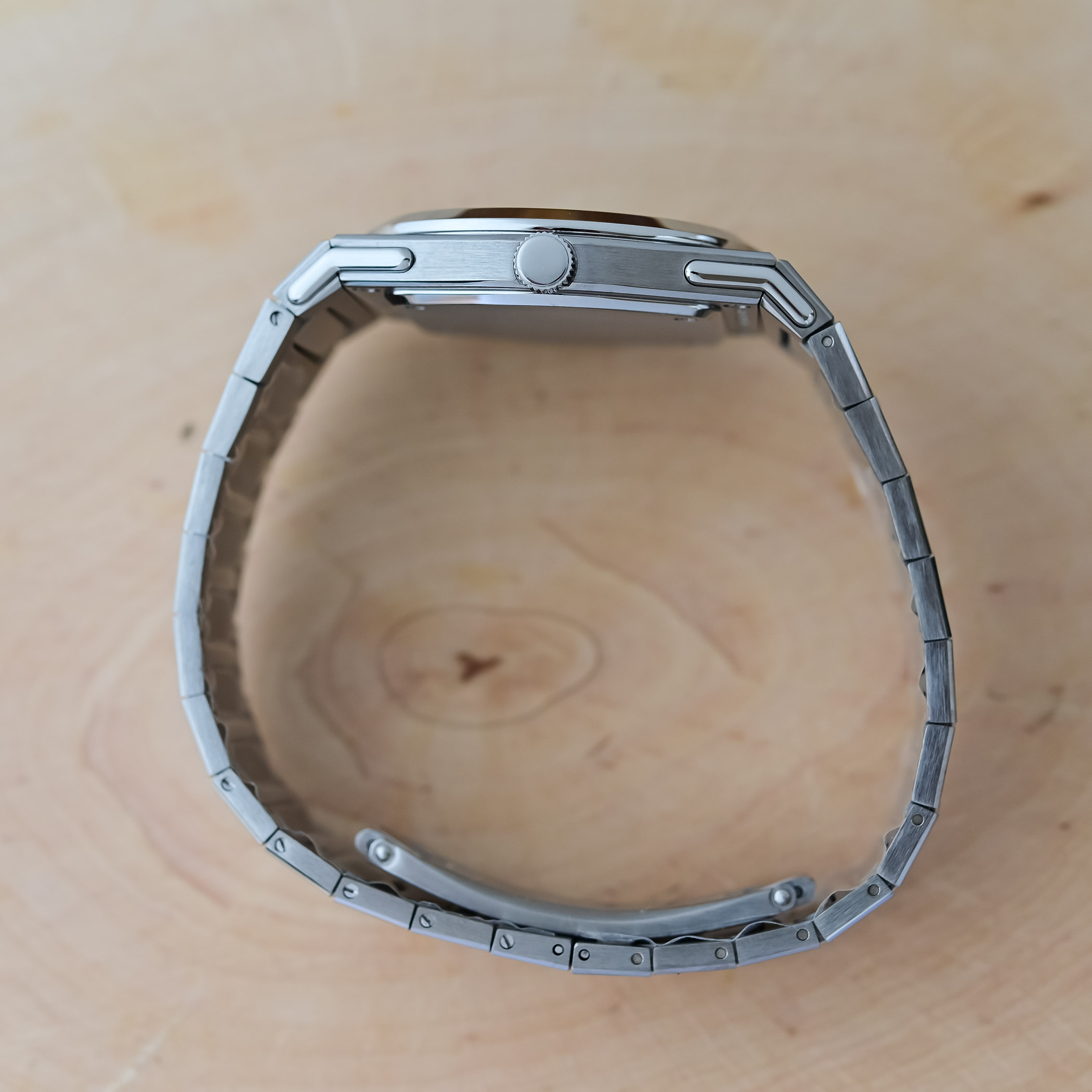 Using a mix of titanium and steel, the 40mm flat cushion-shaped case has a slender profile of 8.95mm and a raised bezel. To confer lightness, the case middle is made from titanium, while the lugs, bezel, crown and caseback are made from steel. True to the genre’s mandates, the case middle is vertically brushed, and the steel elements are polished. An original detail is the four polished steel “gadroons” on the corners of the case, which bend slightly and extend to the first fixed, non-articulated link of the bracelet. Whether they are merely decorative or designed to support the union of the case and bracelet remains to be seen, but their rounded shape is echoed in the oblong polished middle link of the bracelet.