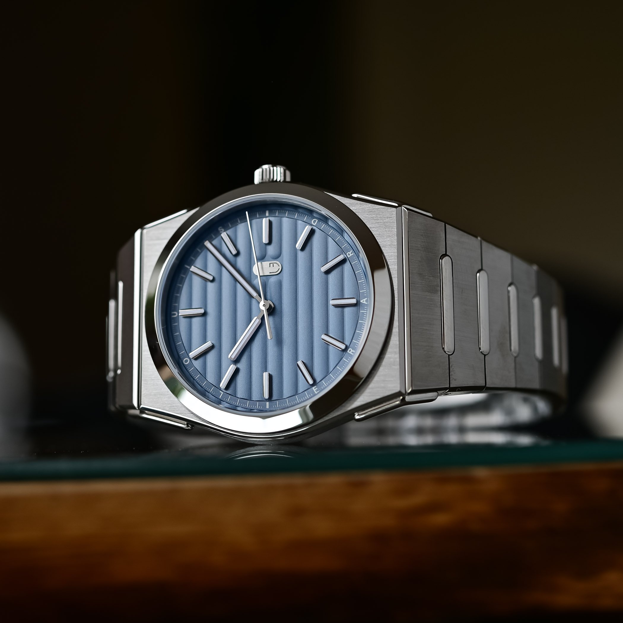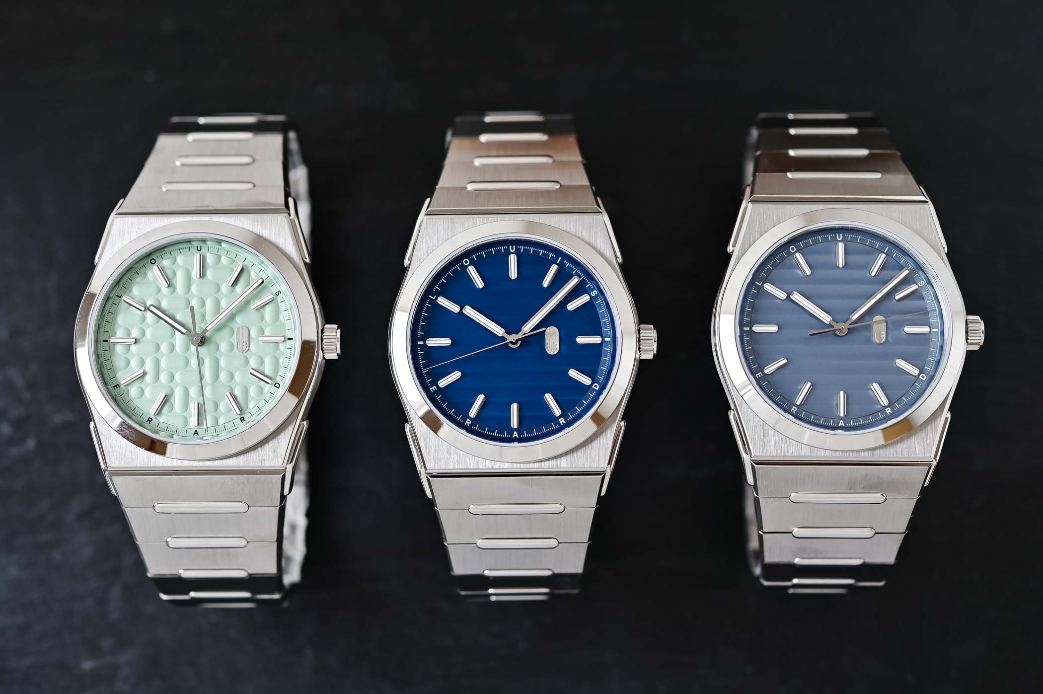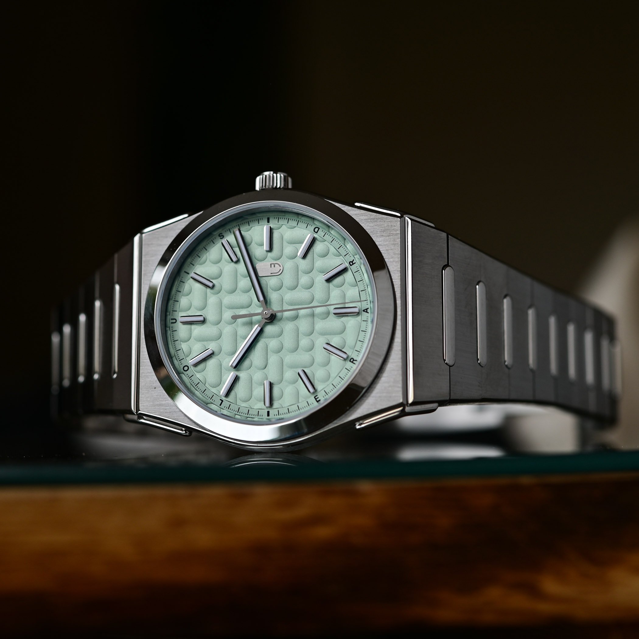 The textured dials come in three colours, Mint Green, Slate Blue and Deep Blue. The Mint Green dial caught our eye with its groovy pattern of raised oblongs, echoing the middle links of the bracelet. The blue dials, on the other hand, feature wide horizontal gadroons. The diamond-cut hour markers and baton hands feature rounded tips to match the oblong link and are treated with blue-emission Super-LumiNova. A feature that will please many is the absence of a date window. Another fun touch is the minutes track, which replaces numerals with the letters of Louis Erard.