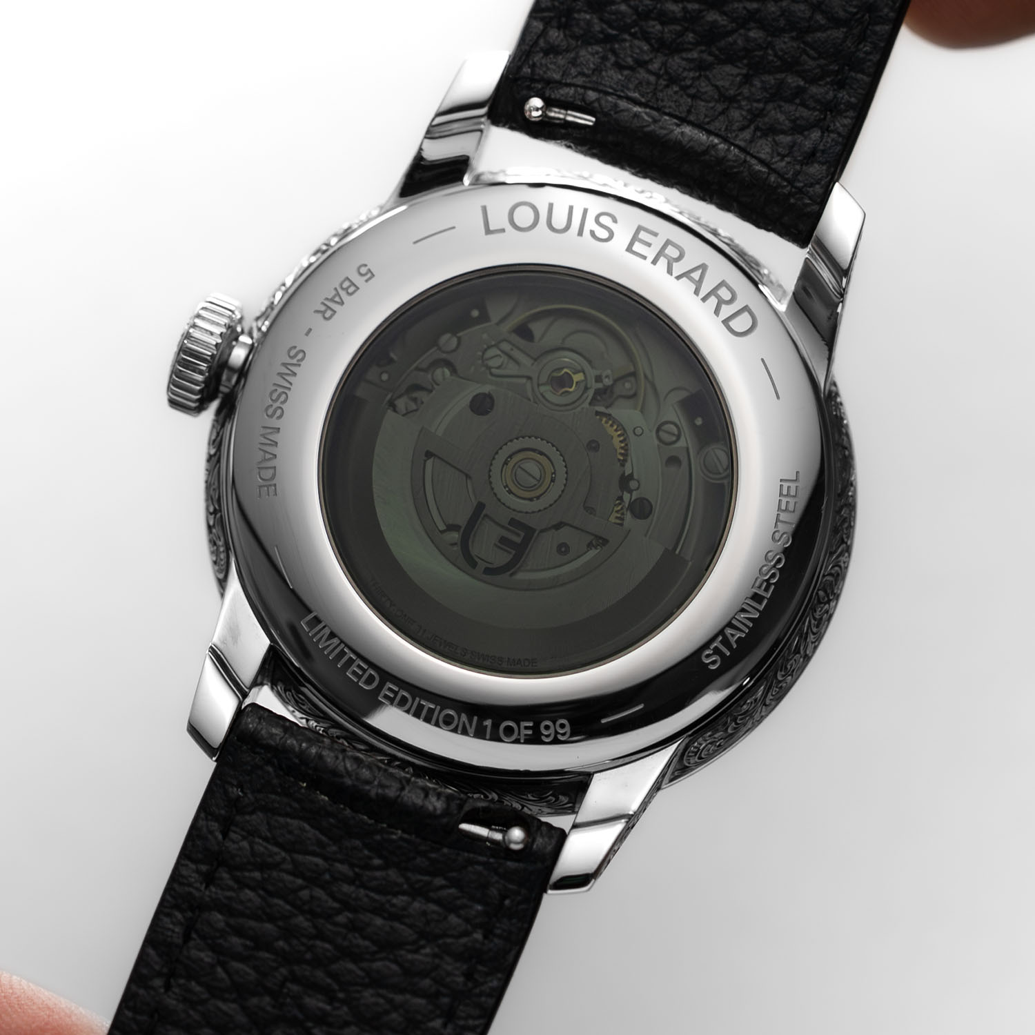 The watch is powered by the Sellita SW261-1, an automatic movement running at 28,800 vibrations/hour with a 38-hour power reserve. The elaboré-grade finishing includes a special openworked oscillating weight with a black lacquered Louis Erard symbol, visible through the sapphire caseback.