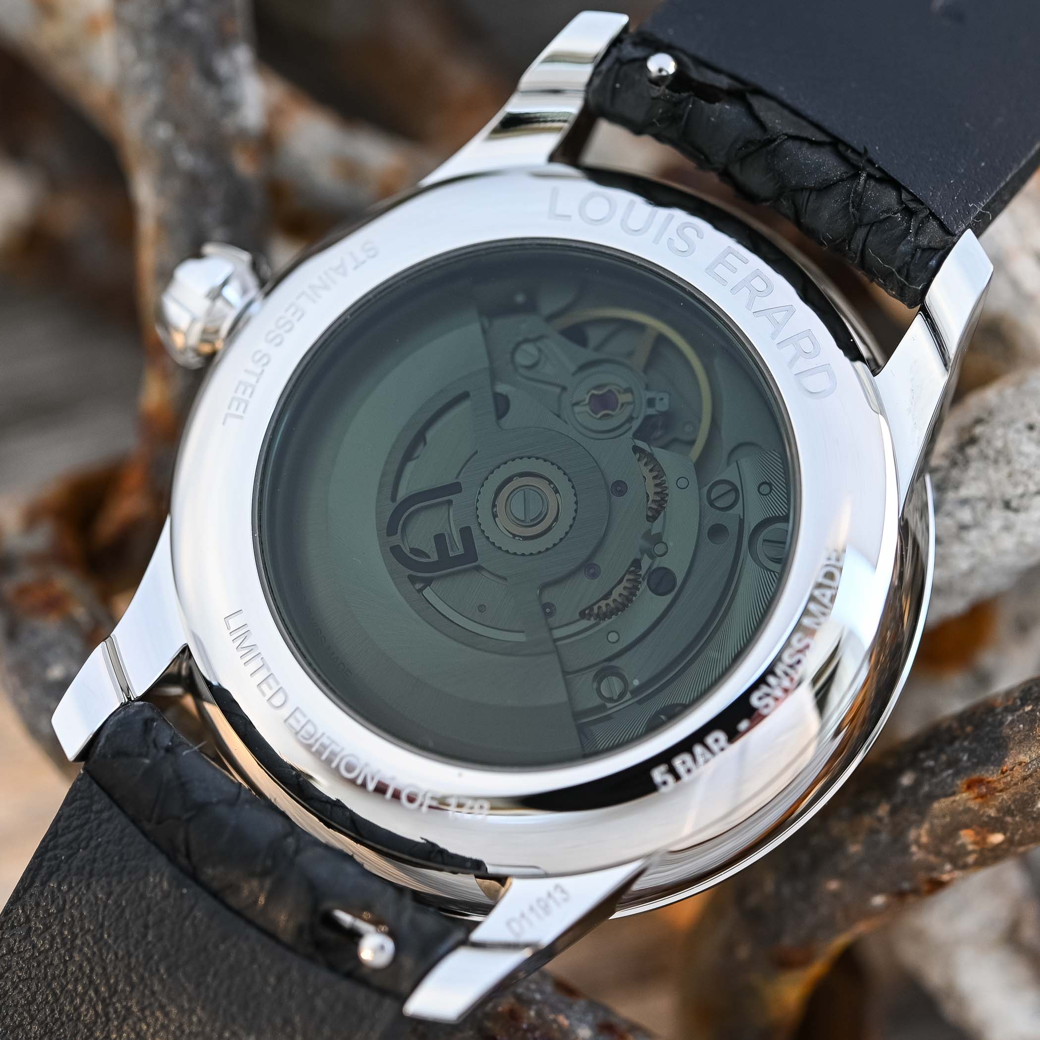 With the rest of this Louis Erard X GoS, you’re in known territory. The watch is housed in the more compact version of the Regulator, meaning a 39mm diameter steel case, with relatively short lugs measuring less than 46mm in total length. The thickness is rather present, at close to 13mm. The 3-part case is entirely polished, features a domed sapphire crystal with anti-reflective treatment on top, a partially black-tinted sapphire caseback and water-resistance is rated at 50 metres.