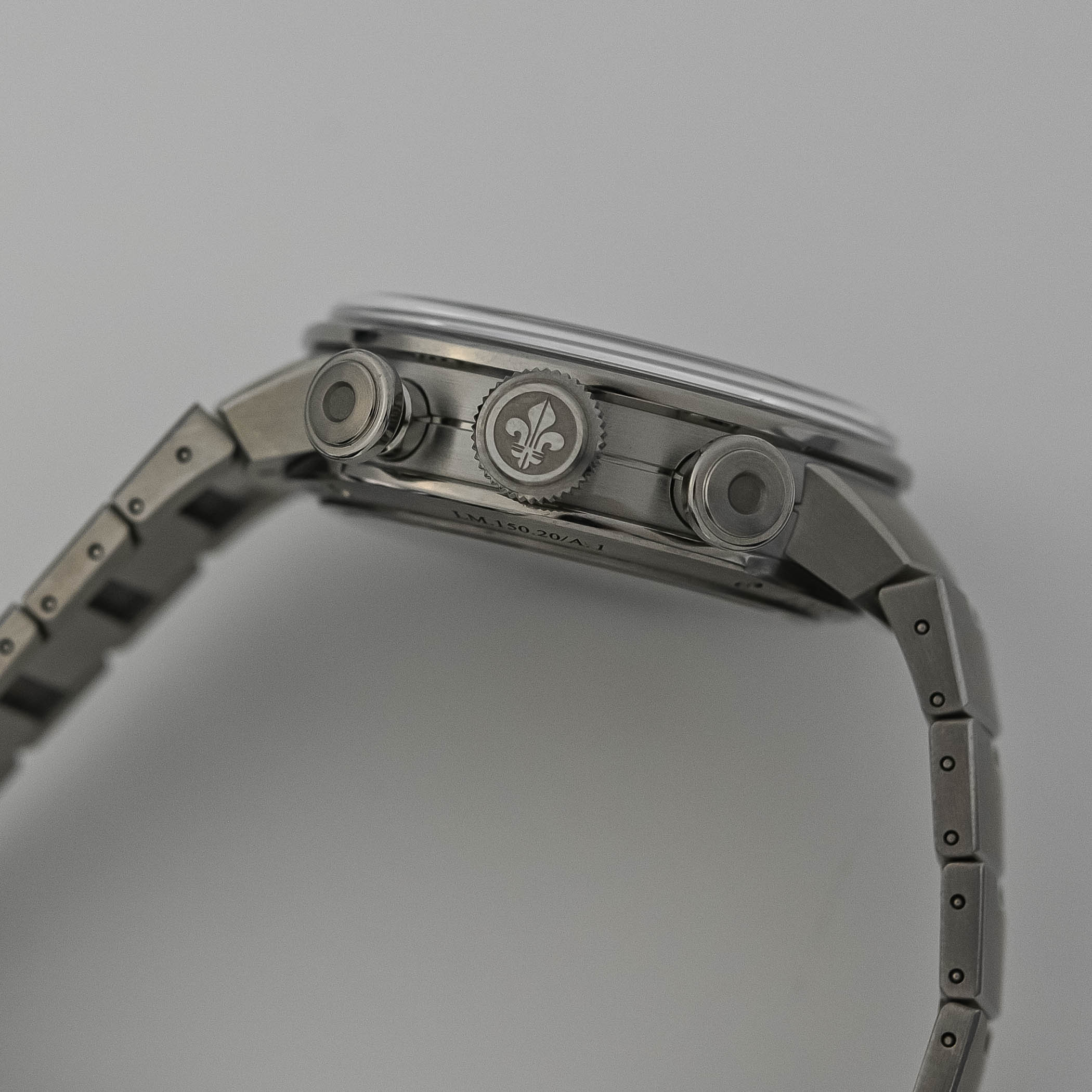 With its three registers and four blued screws, the rhodium-plated and microblasted dial is directly inspired by the Compteur de Tierces. At its periphery, the minutes track is graduated with numerals every six minutes, a reference to the indication of the 1/60th of the second of the Compteur de Tierces. Integrated into the case, the titanium bracelet features large single links and is elegantly arced to extend the curves of the case.