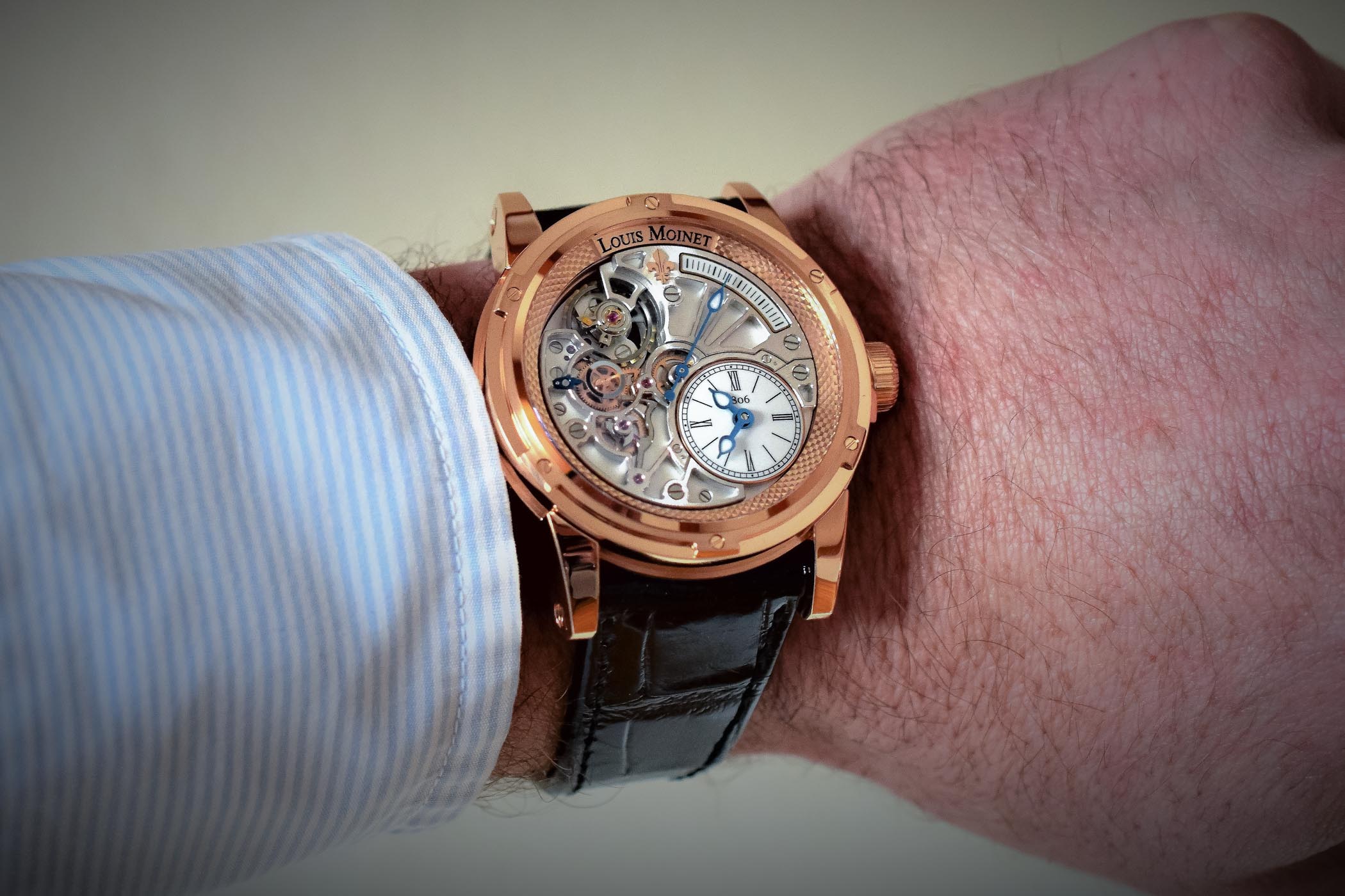 The 43.5mm case is crafted in pink gold and features a slightly domed sapphire crystal framed by the brand’s distinctive screwed-down bezel. The flange circling the movement is adorned with a “clous de Paris” motif and features a cartouche bearing the name of the brand. The fluted crown is adorned with a heraldic lily, a symbol of royalty and the logo of Louis Moinet and is framed with a plate secured with 4 screws. Turn the watch over and the exhibition case back allows a view of the nicely finished movement with circular Geneva stripes, diamond-cut sinks for jewels and circular satin-finished wheels. Its rotor is richly decorated and bears the brand’s lily logo.