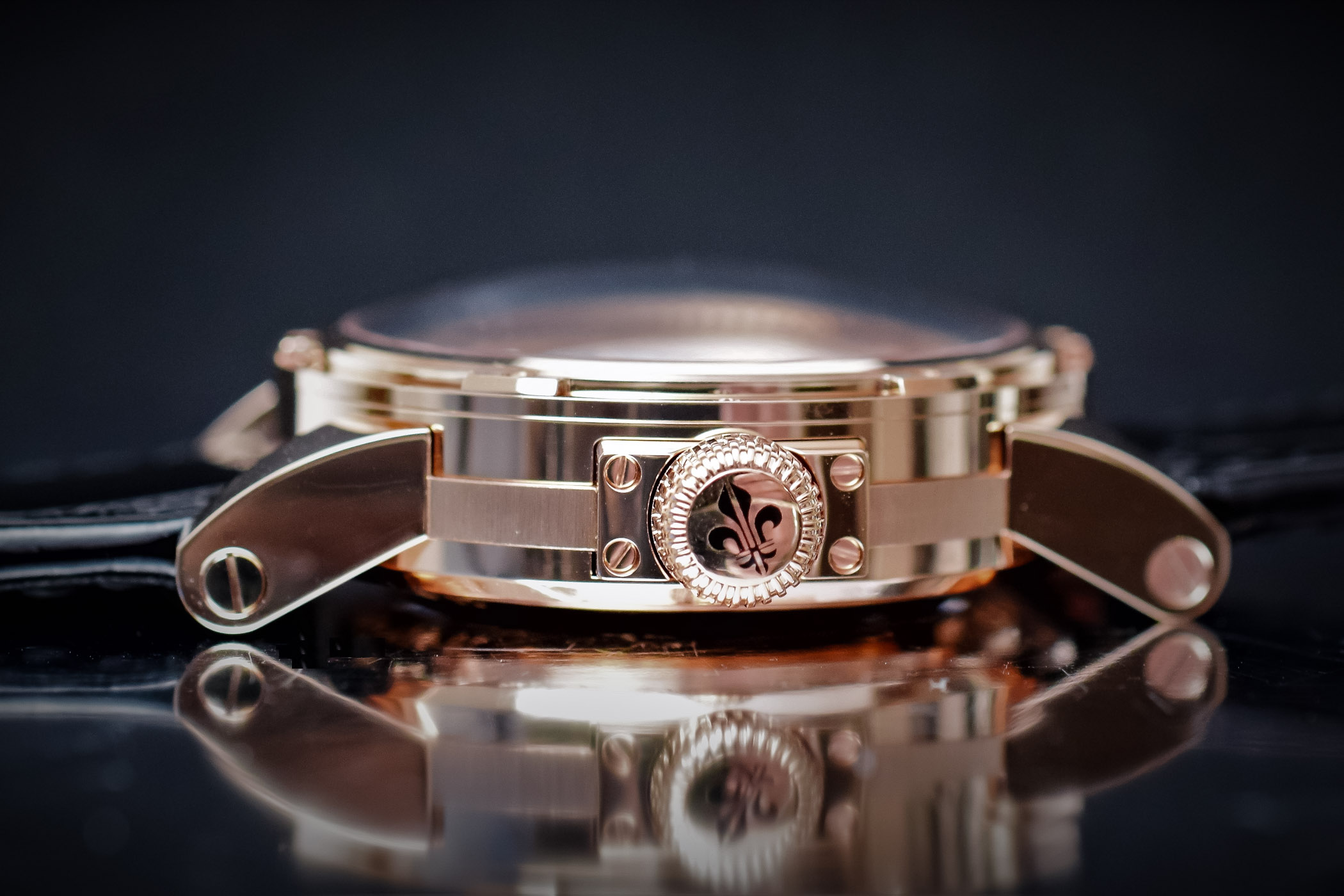 - Case: 43.5mm x 15.60mm– 18k pink gold – sapphire crystal on the front and on the case back – water-resistant to 50m