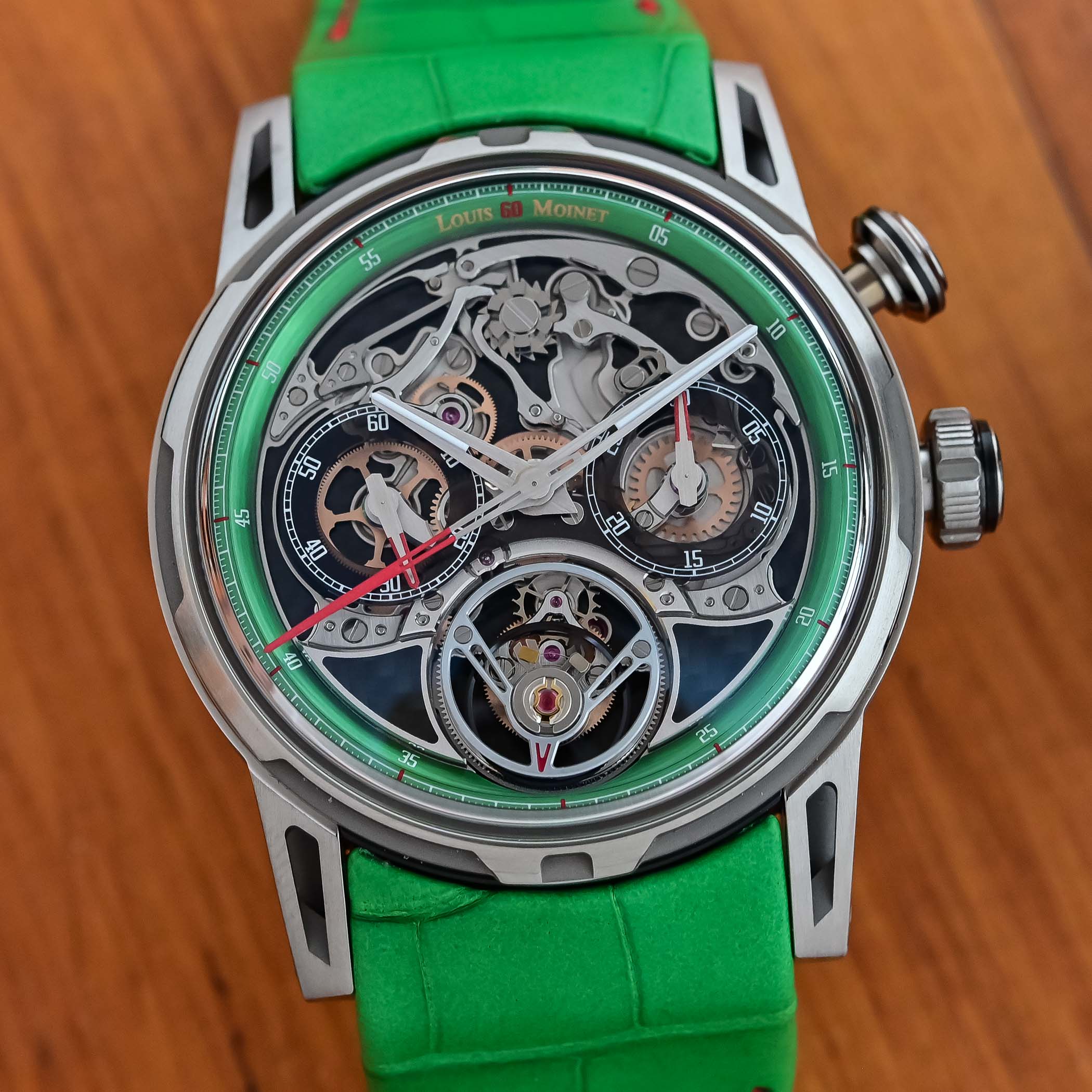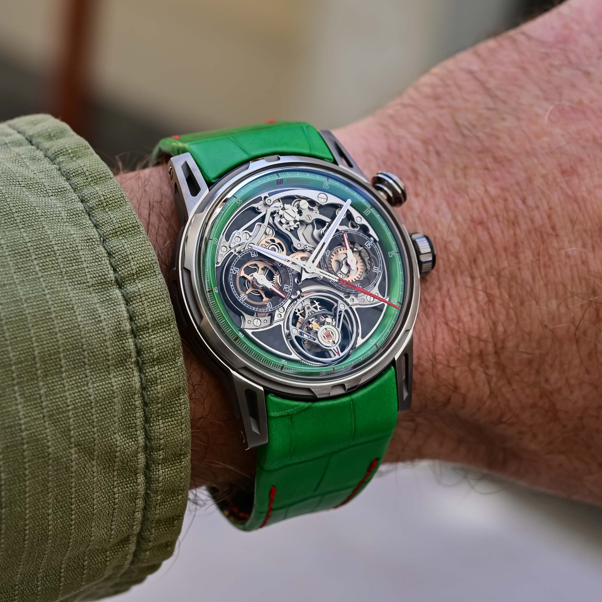 The Impulsion by Louis Moinet is already one of the more extroverted ways to pair a chronograph and a tourbillon. For Dubai Watch Week 2025, the brand dials up the theatre with a sharp new act: the Impulsion Titanium Green, a limited edition that blends carbon, smoked sapphire and green-and-red colourway with the same openworked movement that made the original Impulsion such a notable release.
