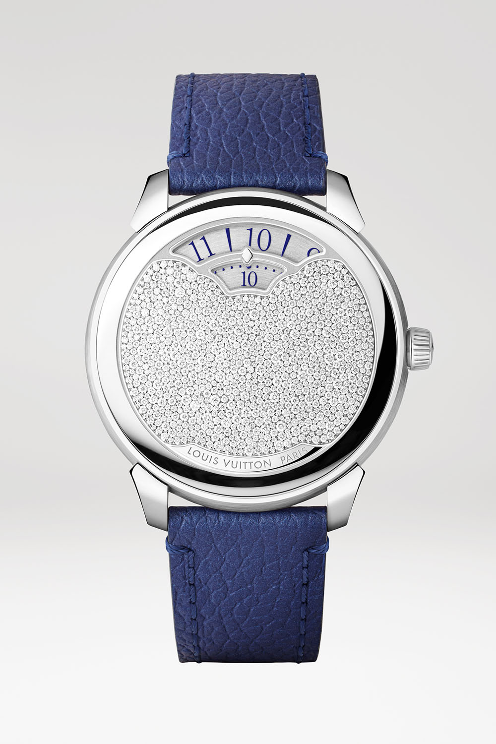 Two editions of the Tambour Convergence will be available. The first has a classic 18k pink gold case with matching hours and minutes discs, secured to the wrist by a typical LV strap in camel calf leather, with a beige calf leather lining and yellow stitching. The second edition is made of 950 platinum, and the top surface of the case is set with 795 snow-set diamonds. The Tambour Convergence in platinum utilises stones in a range of seven sizes and requires 32 hours of meticulous work to complete. This version uses rhodium-plated discs and is worn on a blue calf leather strap.