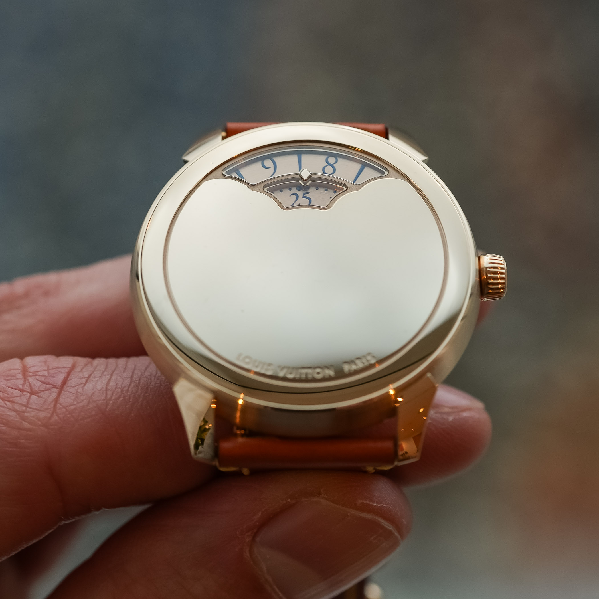 We are looking at a compact movement with a solid 18k gold central rotor, presented here in a time-only version to power the two discs on top. It features a high-end regulating organ with a free-sprung balance equipped with high-precision inertia blocks, beating at a modern 4Hz frequency. The power reserve is 45 hours. The decoration is in line with what’s been seen on the Tambour, including sandblasted bridges with micro-sandblasted edges, perlage on the main plate, polished bevels, an LV motif on the periphery of the rotor and colourless jewels instead of conventional magenta synthetic rubies.