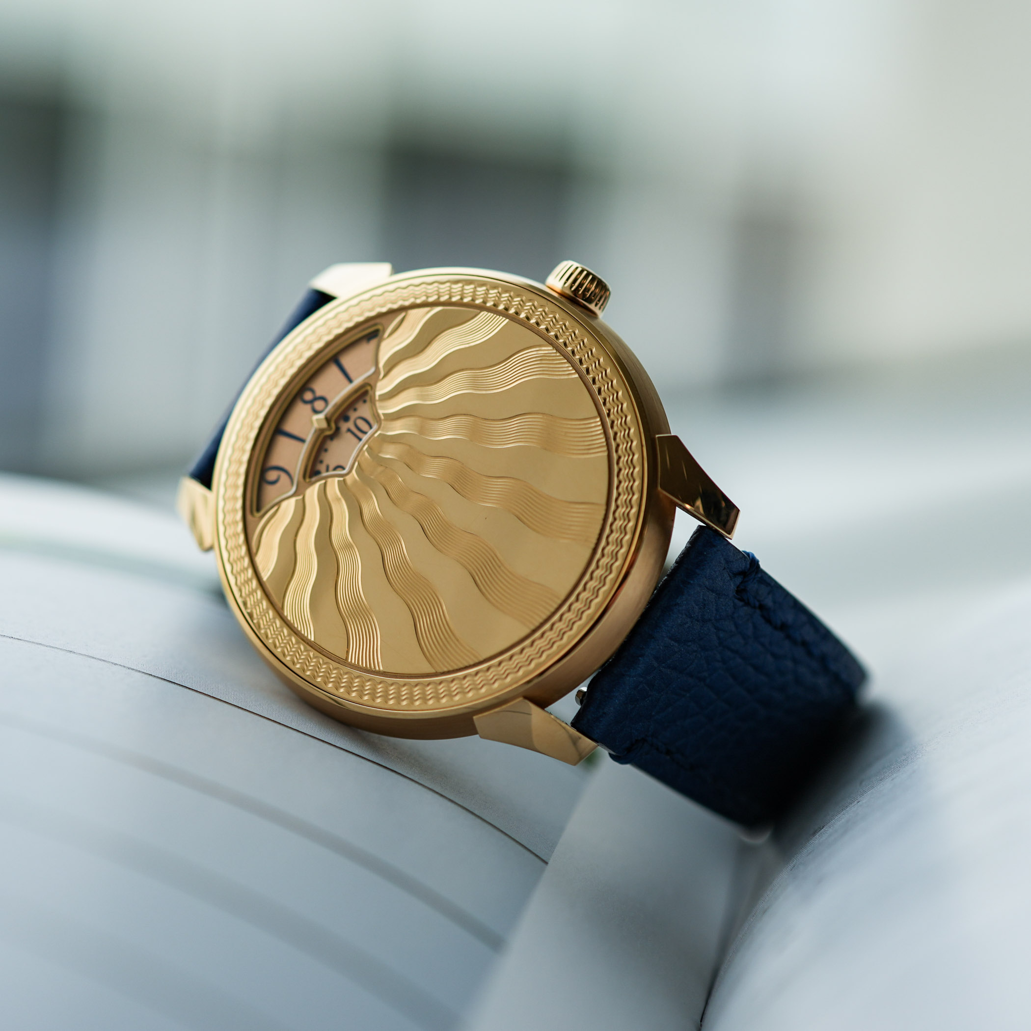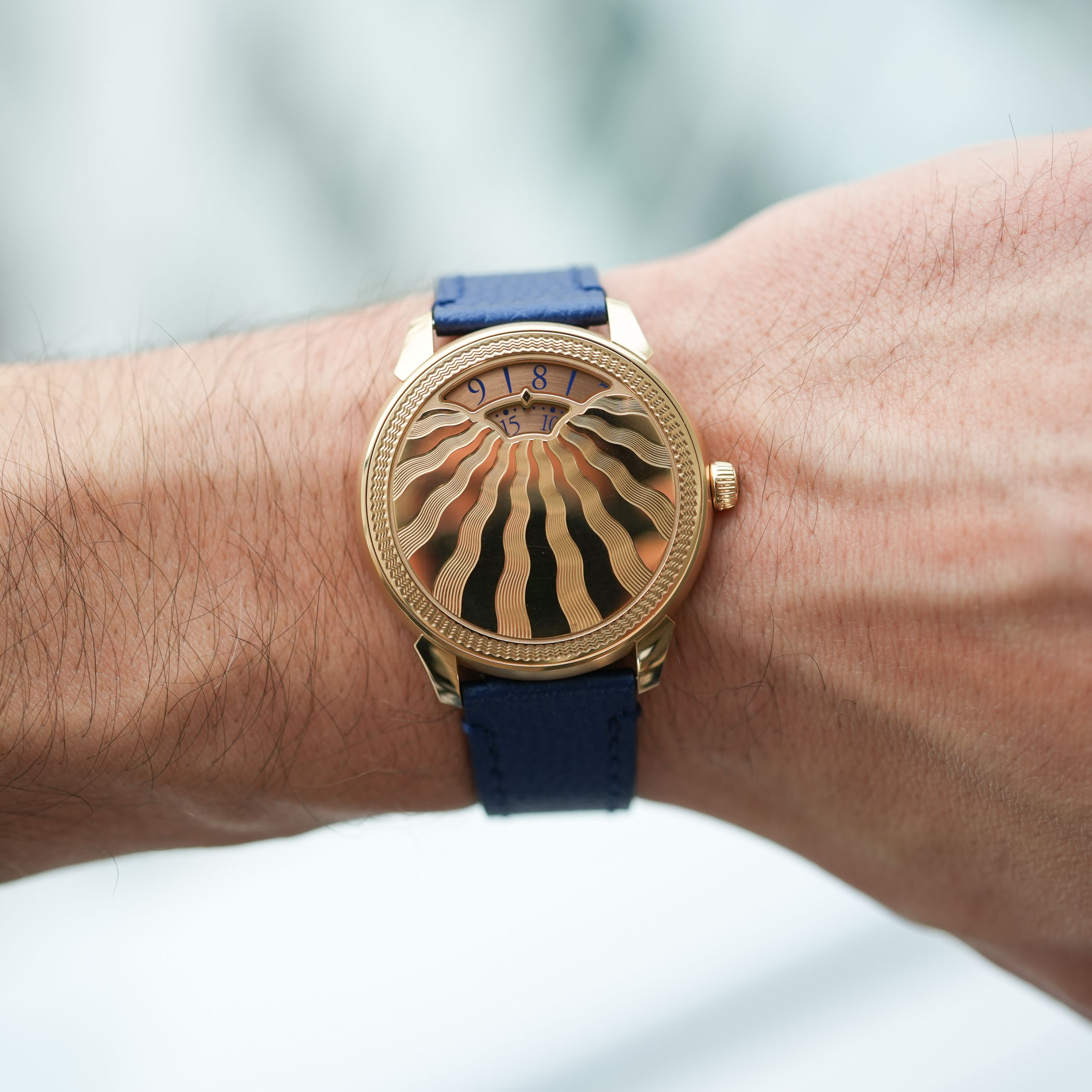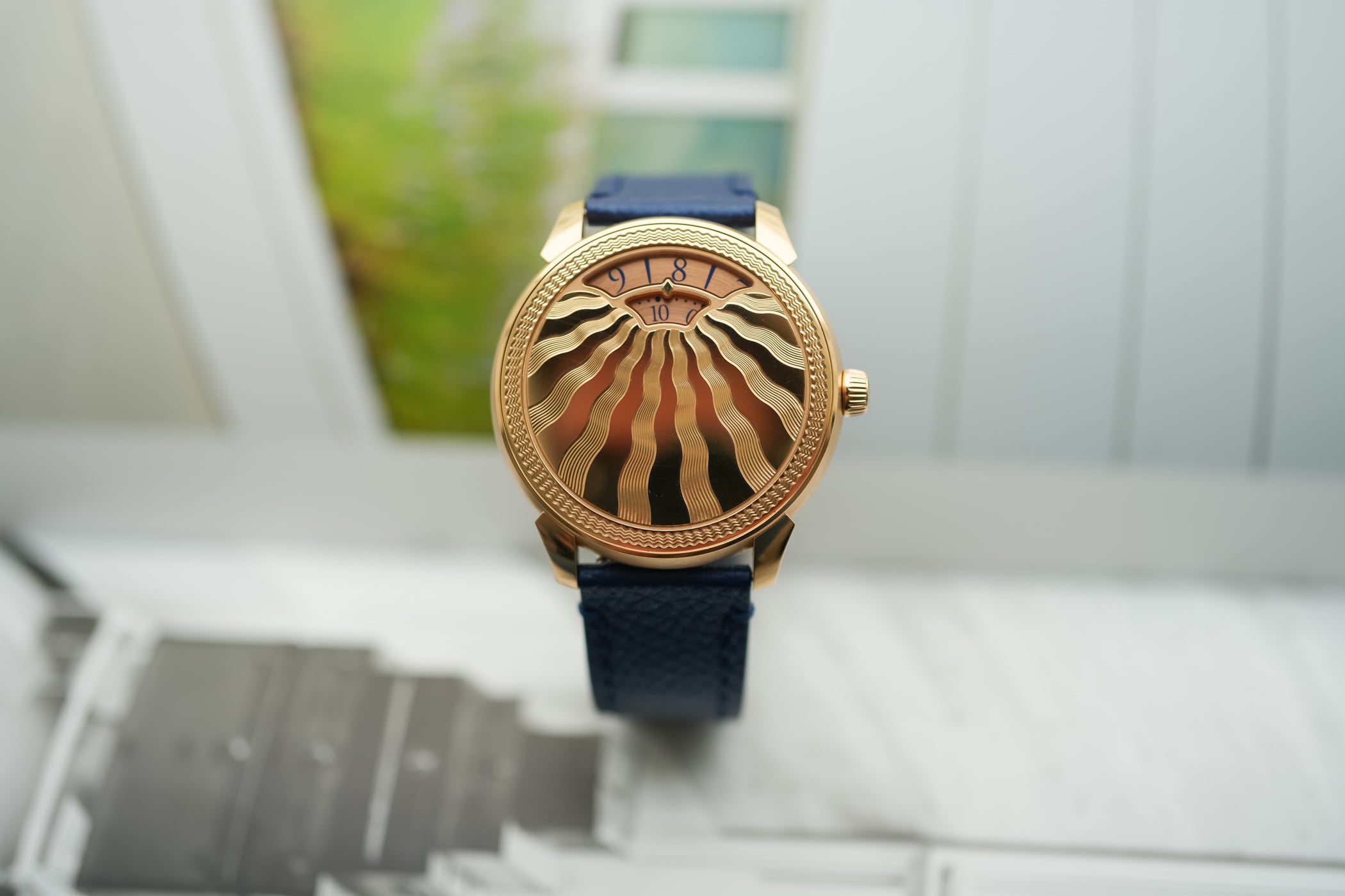 However, the true protagonist of the Tambour is the hand-guilloché decoration with a series of undulating rays radiating from the hour and minute apertures. Using restored machines, an experienced guillocheur engraves the domed surface of the rose gold plate with two distinct manually operated lathes: a rose engine from 1850 for the concentric waves along the perimeter and a straight-line engine from 1935 for the undulating rays. Each model requires approximately 16 hours of engraving.