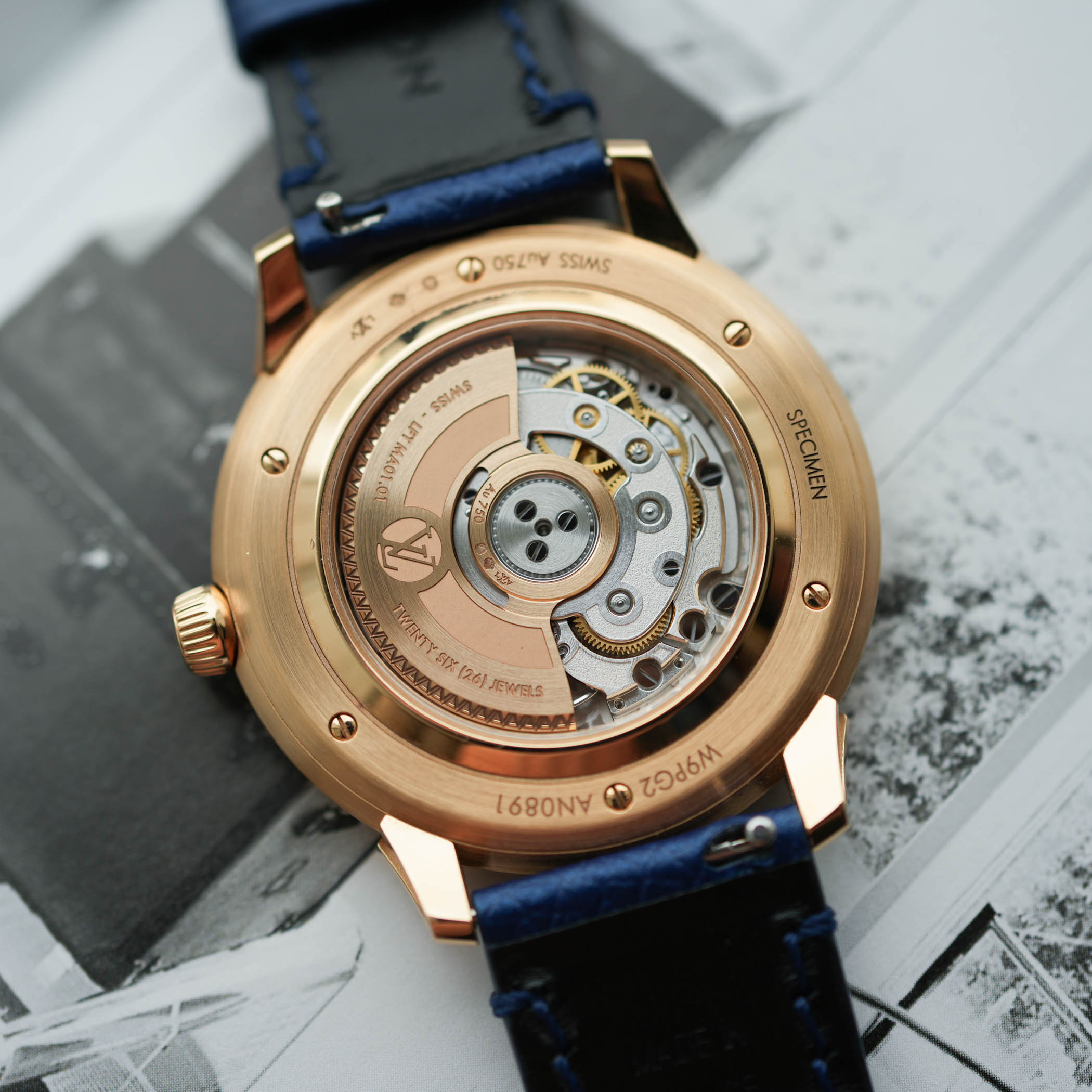 Powered by the calibre LFT MA01.01 produced in-house at La Fabrique du Temps, this automatic movement shares its architecture with the base calibre used in the new Spin Time collection. Equipped with a solid 18k rose gold central rotor, the movement delivers a 45-hour power reserve and beats at a contemporary frequency of 4Hz. Decorated with sandblasted bridges with micro-sandblasted edges, perlage on the mainplate, polished bevels, an LV motif on the periphery of the rotor and colourless jewels instead of conventional magenta synthetic rubies, the movement can be admired on the caseback.