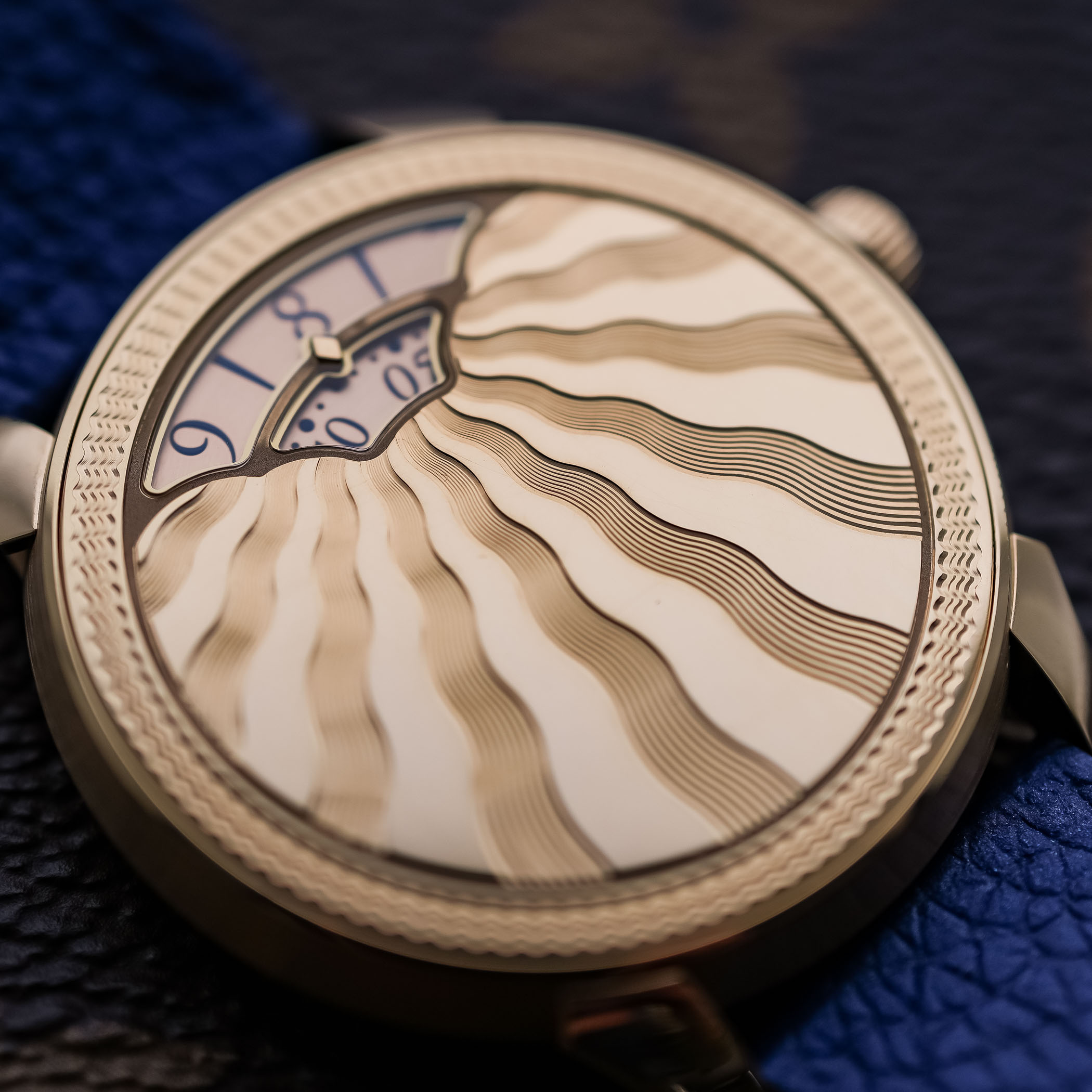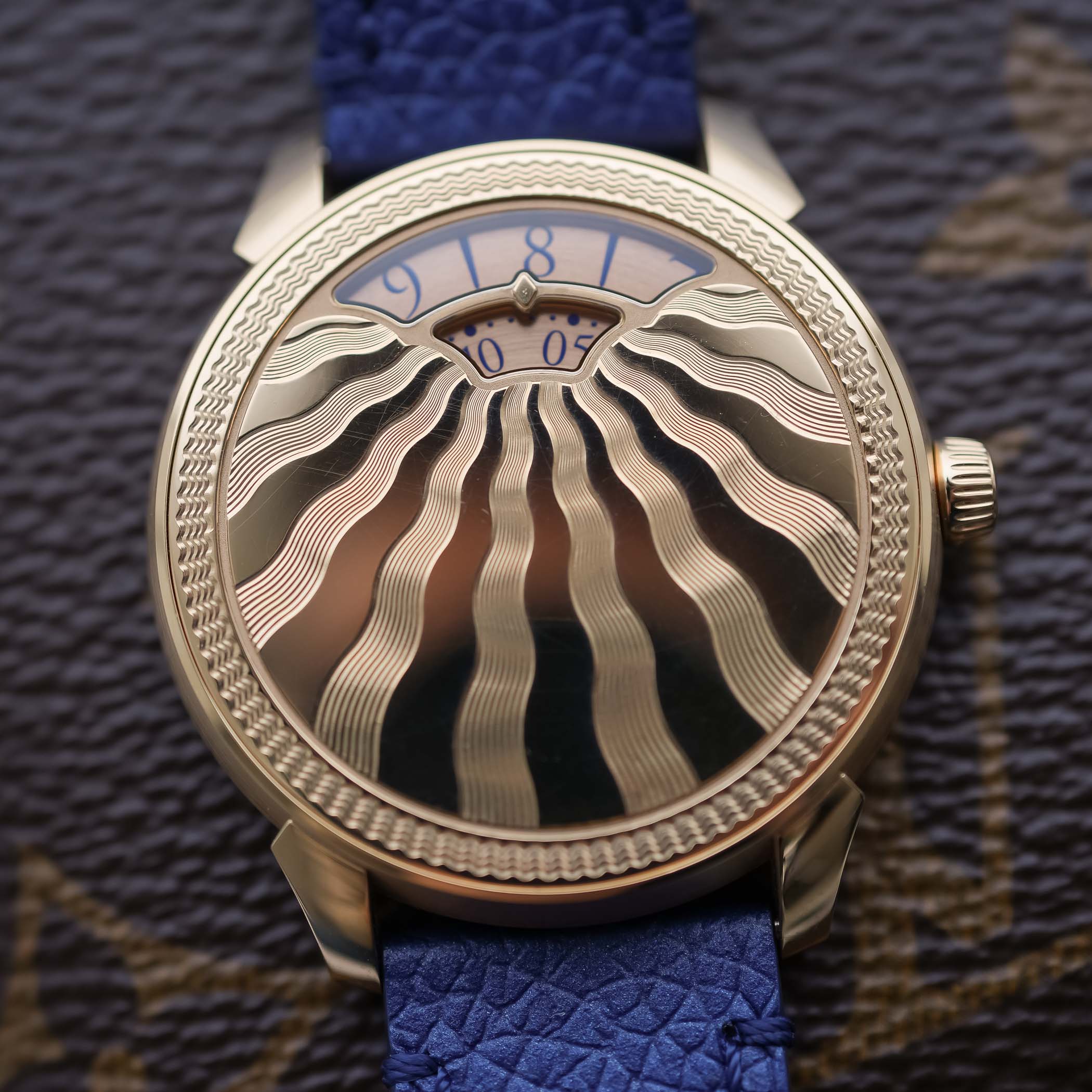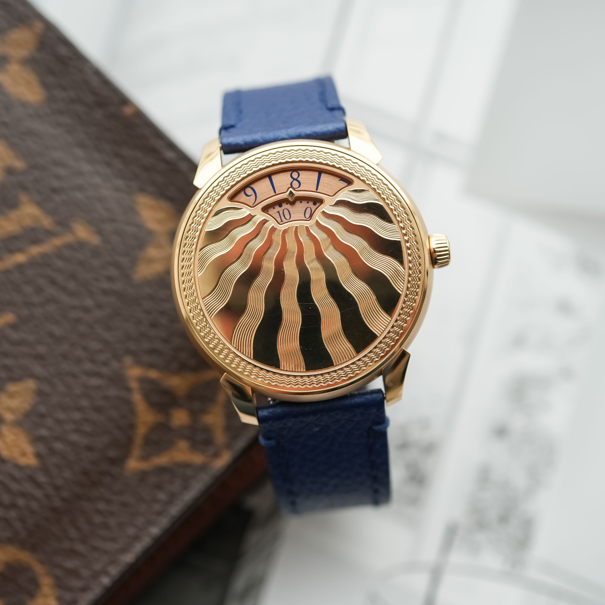 LV's compact montre à guichet, now with gorgeous hand-guilloché rays.