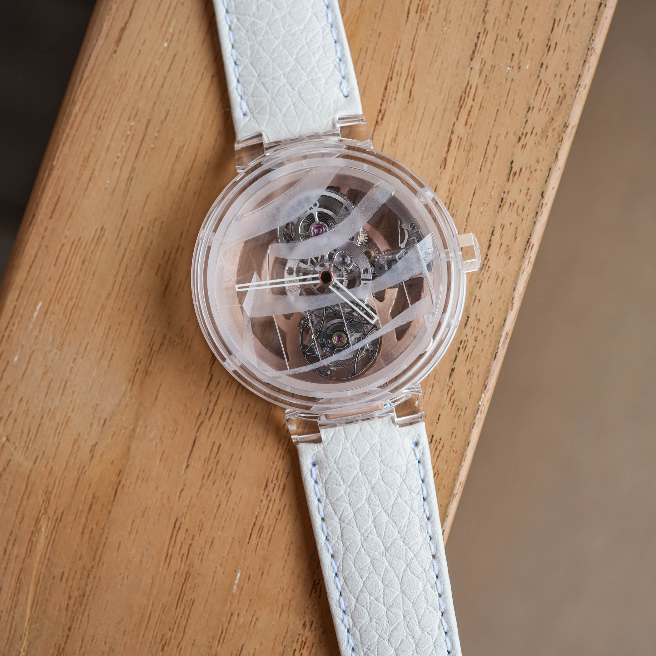 Frank Gehry’s diaphanous vessel, powered by a flying tourbillon, sails the high seas of contemporary architecture and watchmaking.