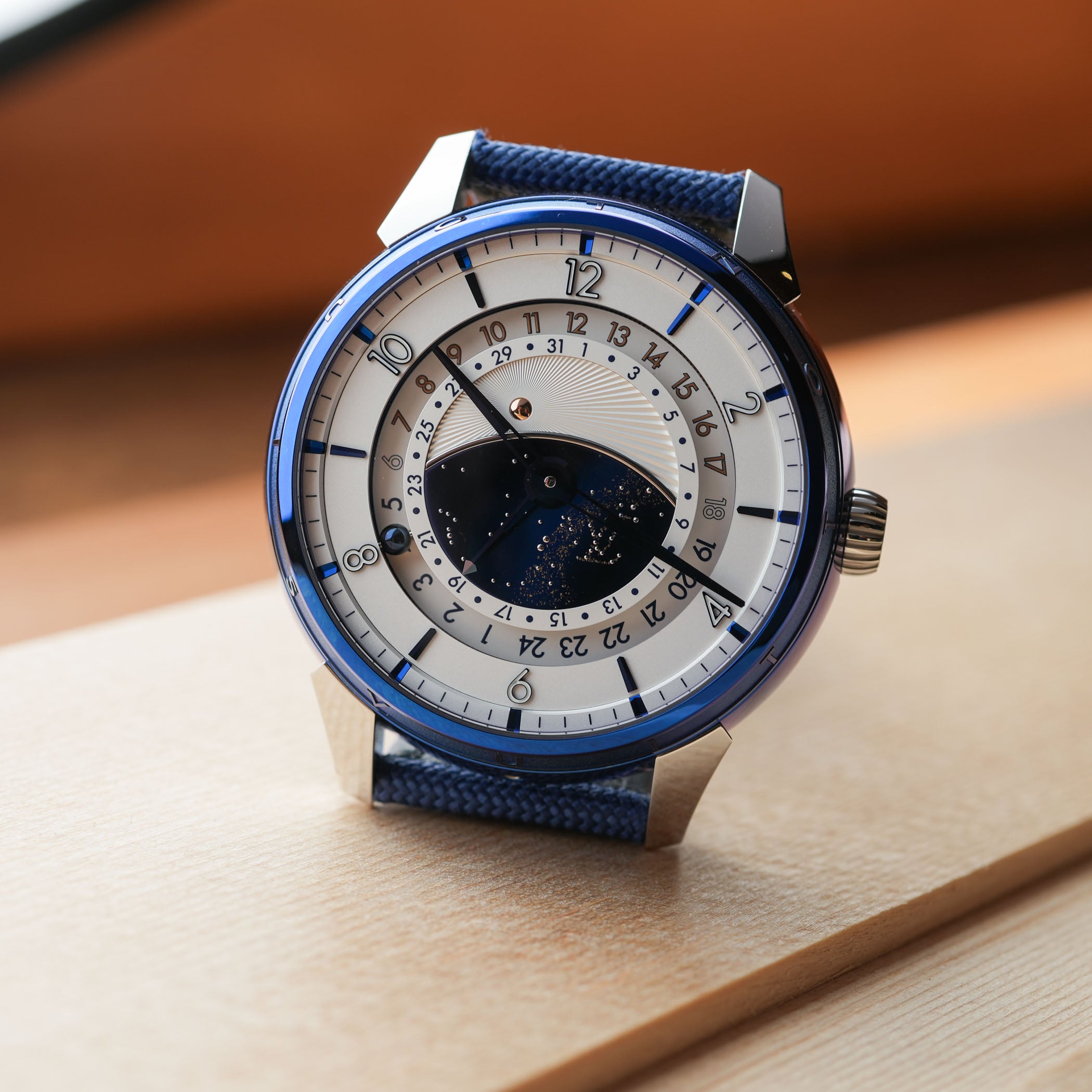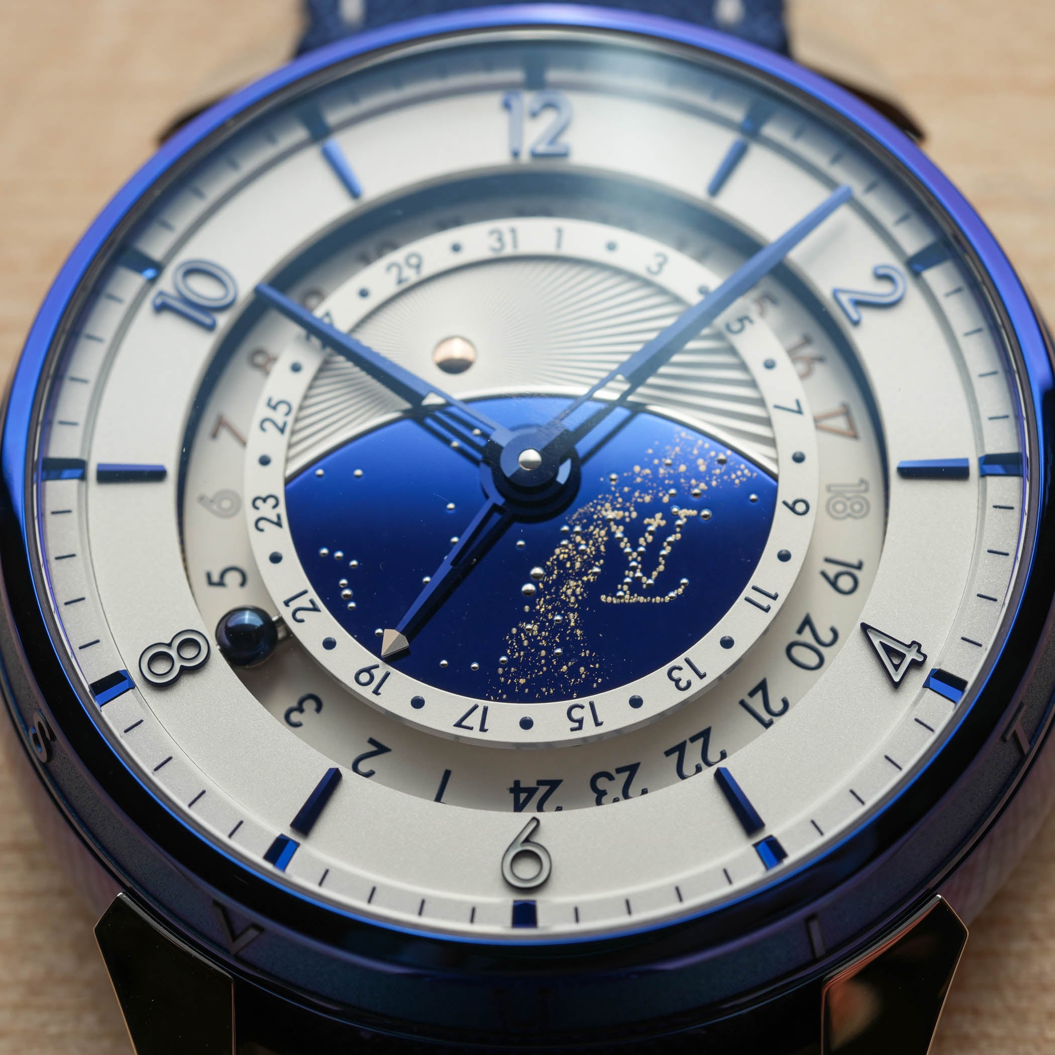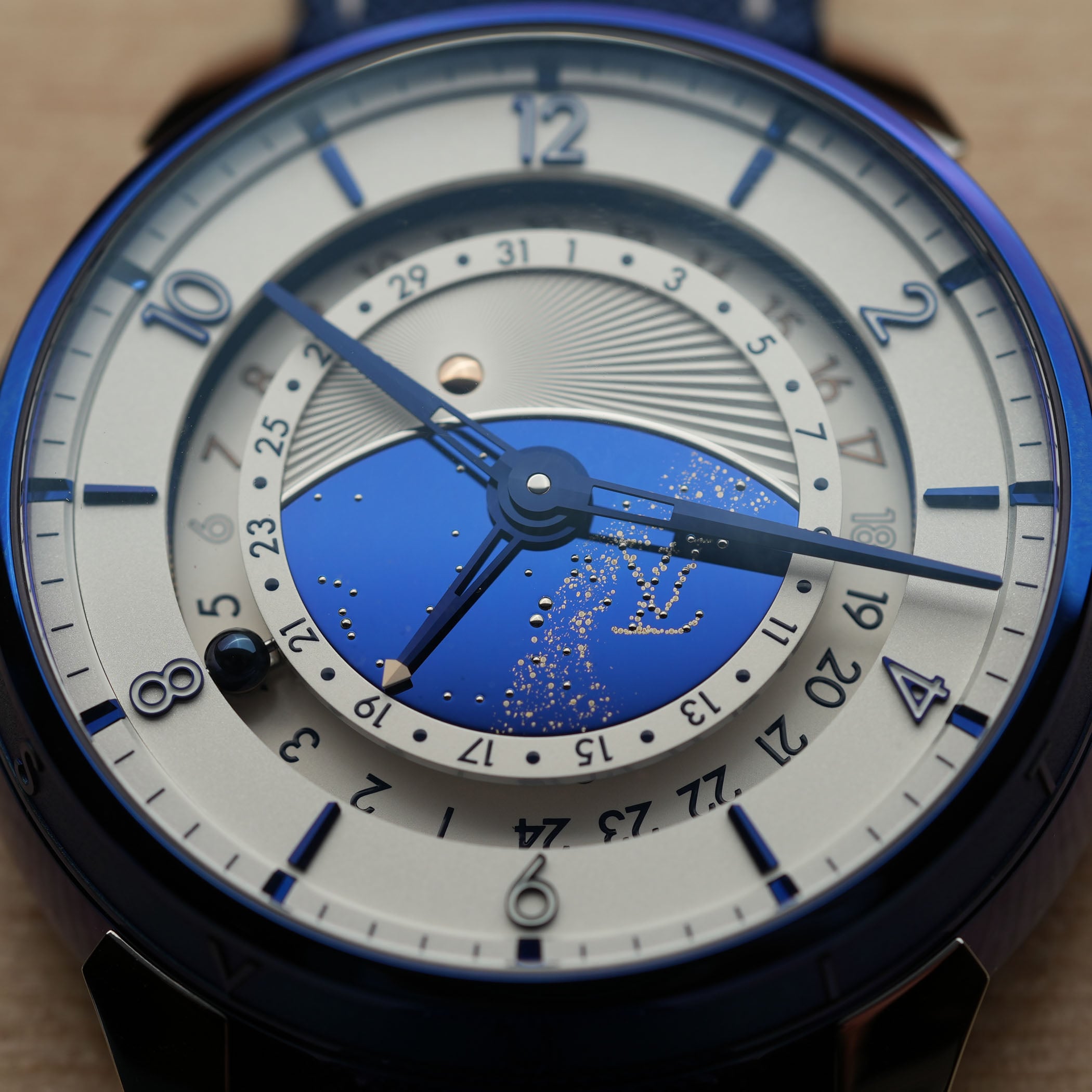 So what we’re looking at here is basically a mix-and-match between Louis Vuitton’s Tambour Taiko-shaped case and the movement and display of a DB25 GMT Starry Varius. Starting with the case, it measures 45mm in diameter and 14.05mm in thickness, but surprisingly wears much smaller on the wrist. Produced in titanium (with polished and sandblasted surfaces) by LV La Fabrique du Temps, it is then sent to De Bethune to be thermally blued, in a classic DB style. The result is the emblematic, deep, vibrant colour that Flageollet is known for, but here on a round drum-shaped case with the 12 letters of Louis Vuitton on the bezel. The case is finished with platinum lugs, polished and with laser bead-blasted interiors for contrast.
