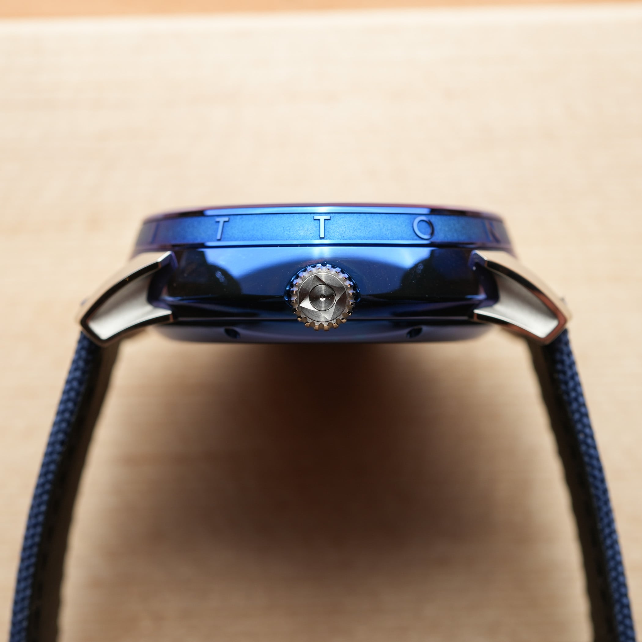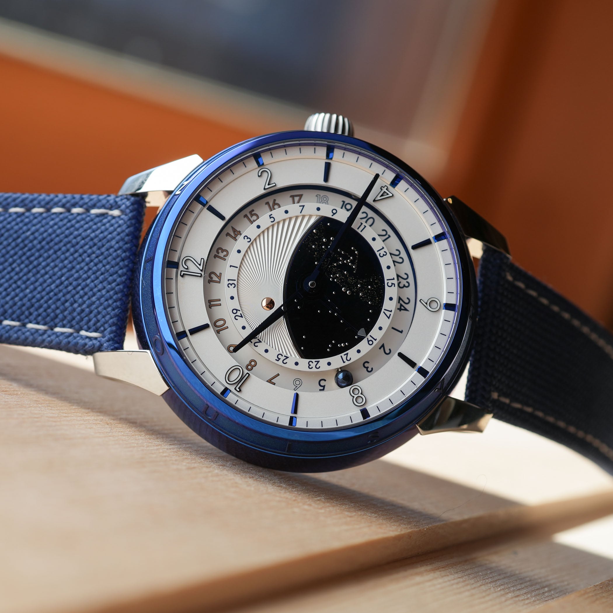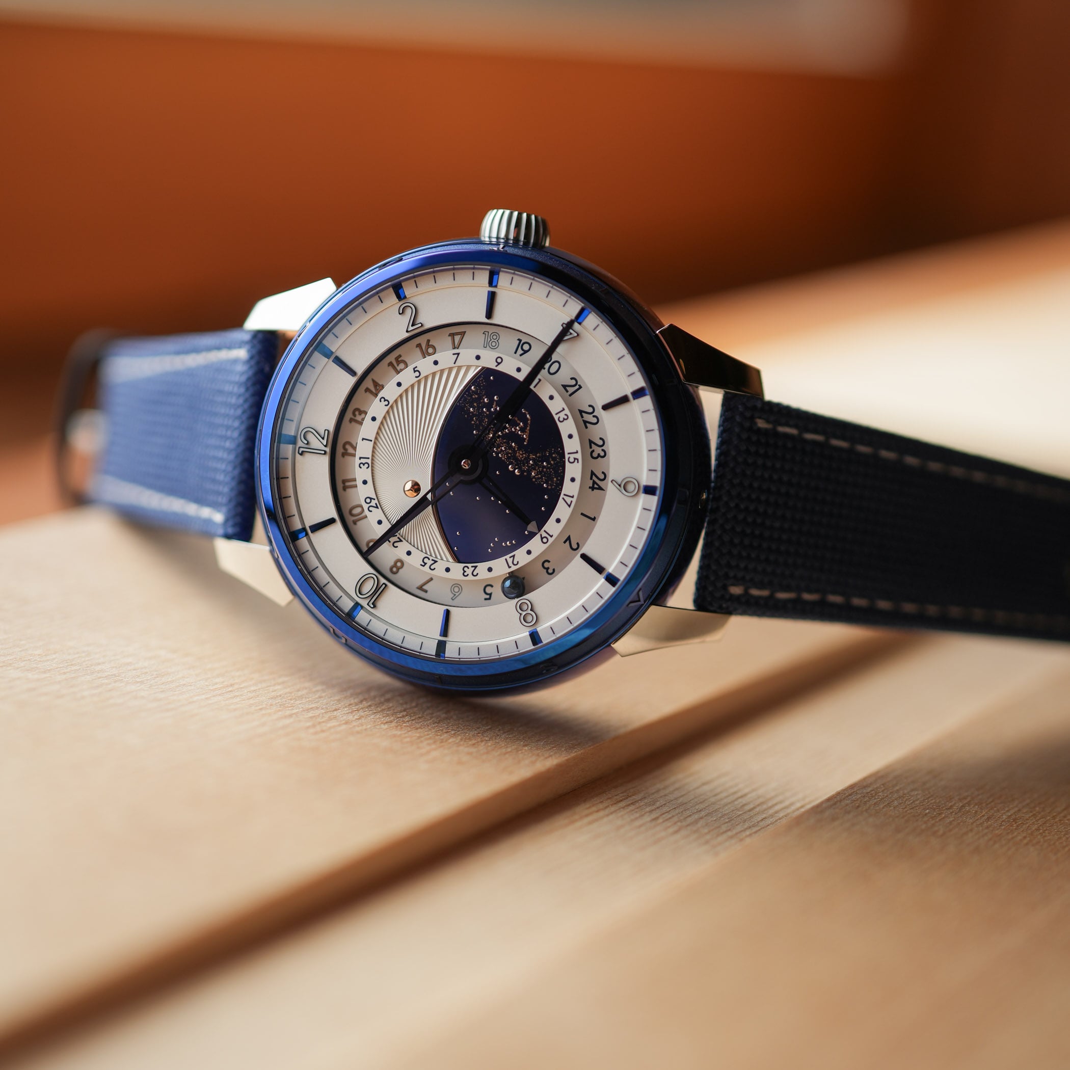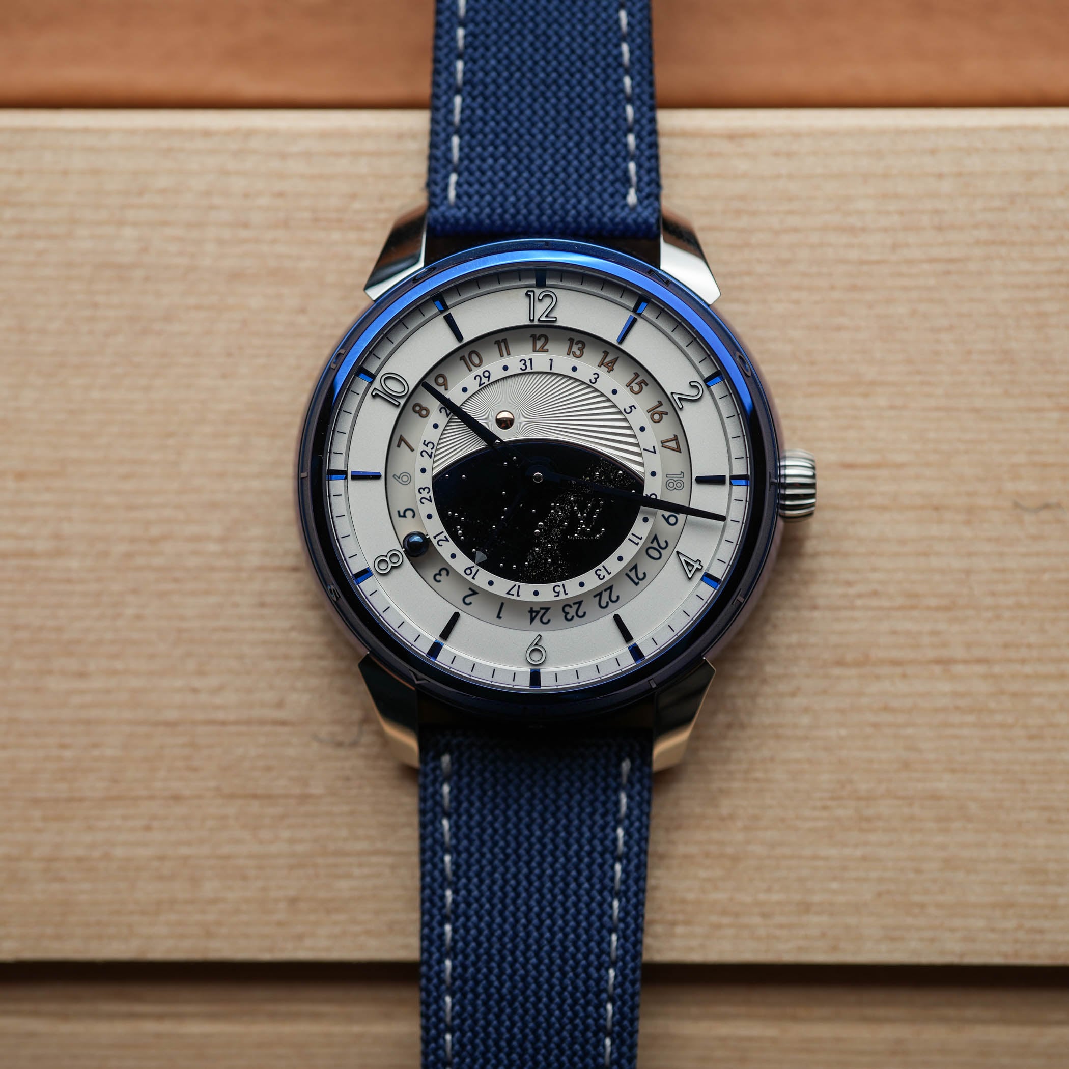 So what we’re looking at here is basically a mix-and-match between Louis Vuitton’s Tambour Taiko-shaped case and the movement and display of a DB25 GMT Starry Varius. Starting with the case, it measures 45mm in diameter and 14.05mm in thickness, but surprisingly wears much smaller on the wrist. Produced in titanium (with polished and sandblasted surfaces) by LV La Fabrique du Temps, it is then sent to De Bethune to be thermally blued, in a classic DB style. The result is the emblematic, deep, vibrant colour that Flageollet is known for, but here on a round drum-shaped case with the 12 letters of Louis Vuitton on the bezel. The case is finished with platinum lugs, polished and with laser bead-blasted interiors for contrast.