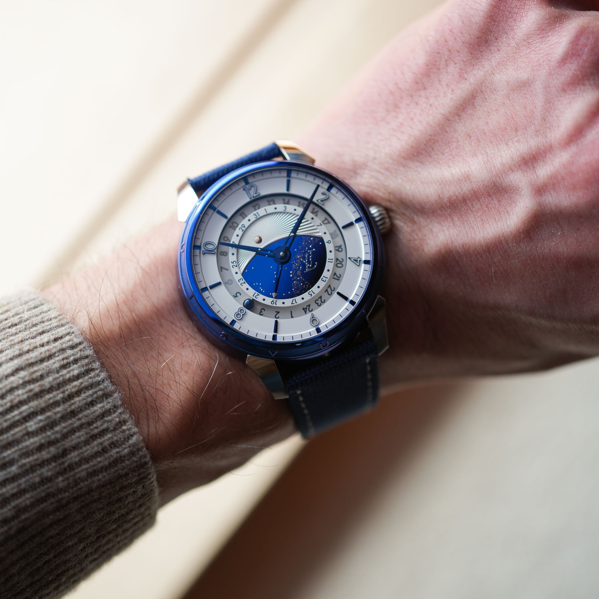 The hour chapter ring is, on the other hand, typical LV and utilises the style that defined the Tambour sports watch back in 2023. The blue polished indexes and Tambour-style numerals are set onto an opaline surface, while time is indicated by faceted, polished blued hands.