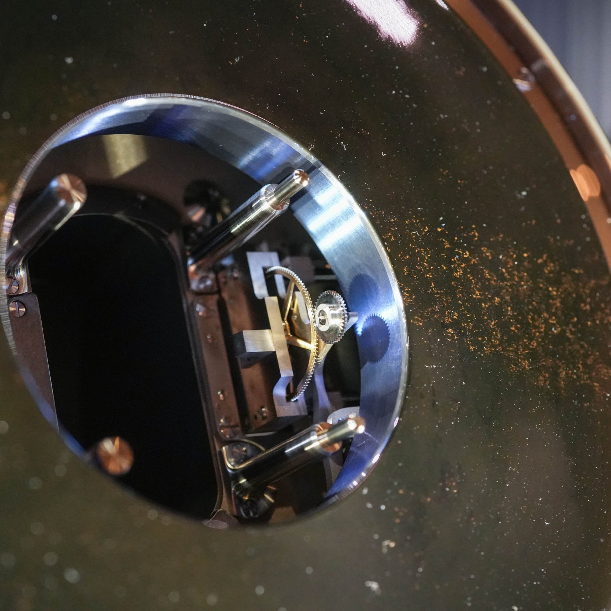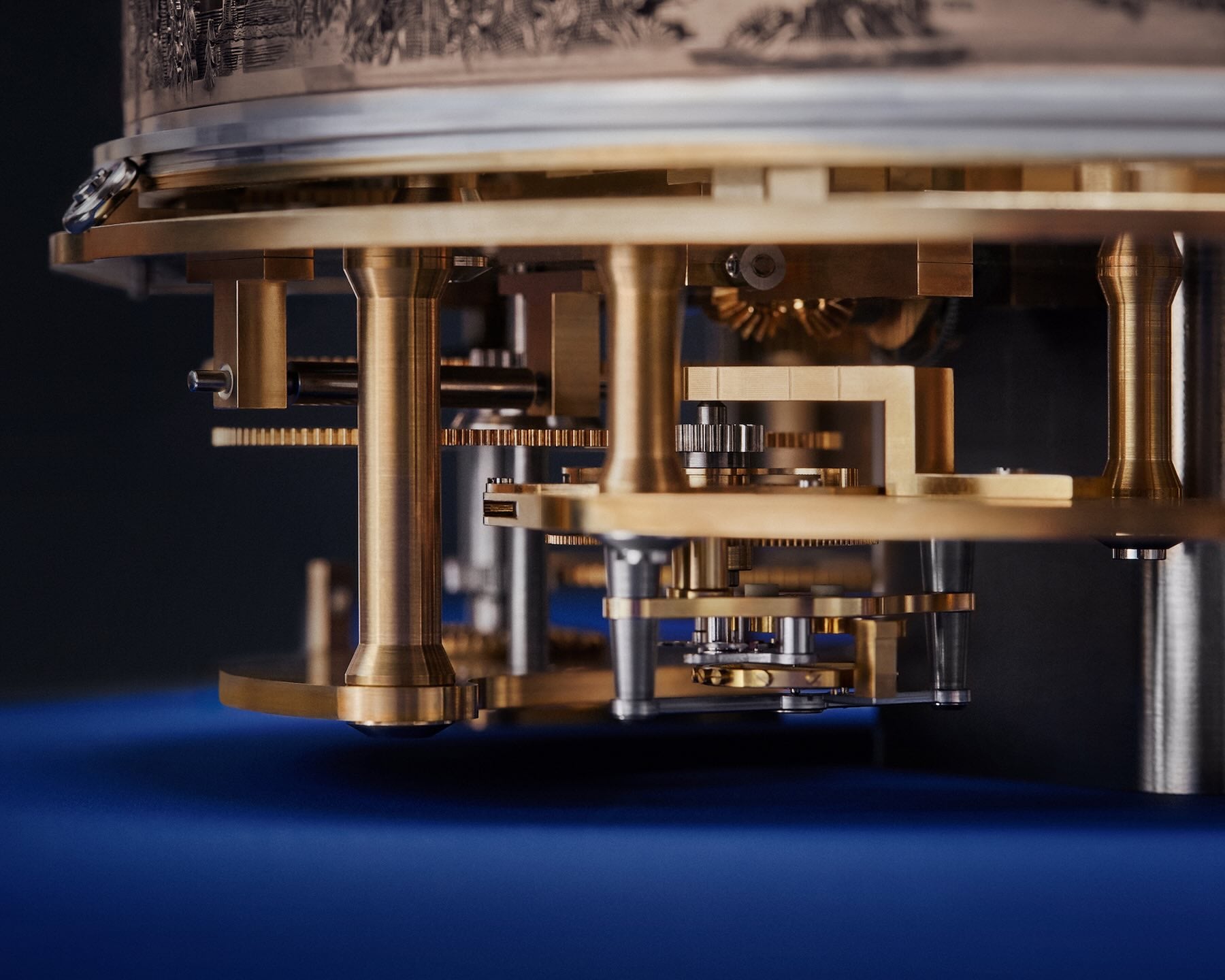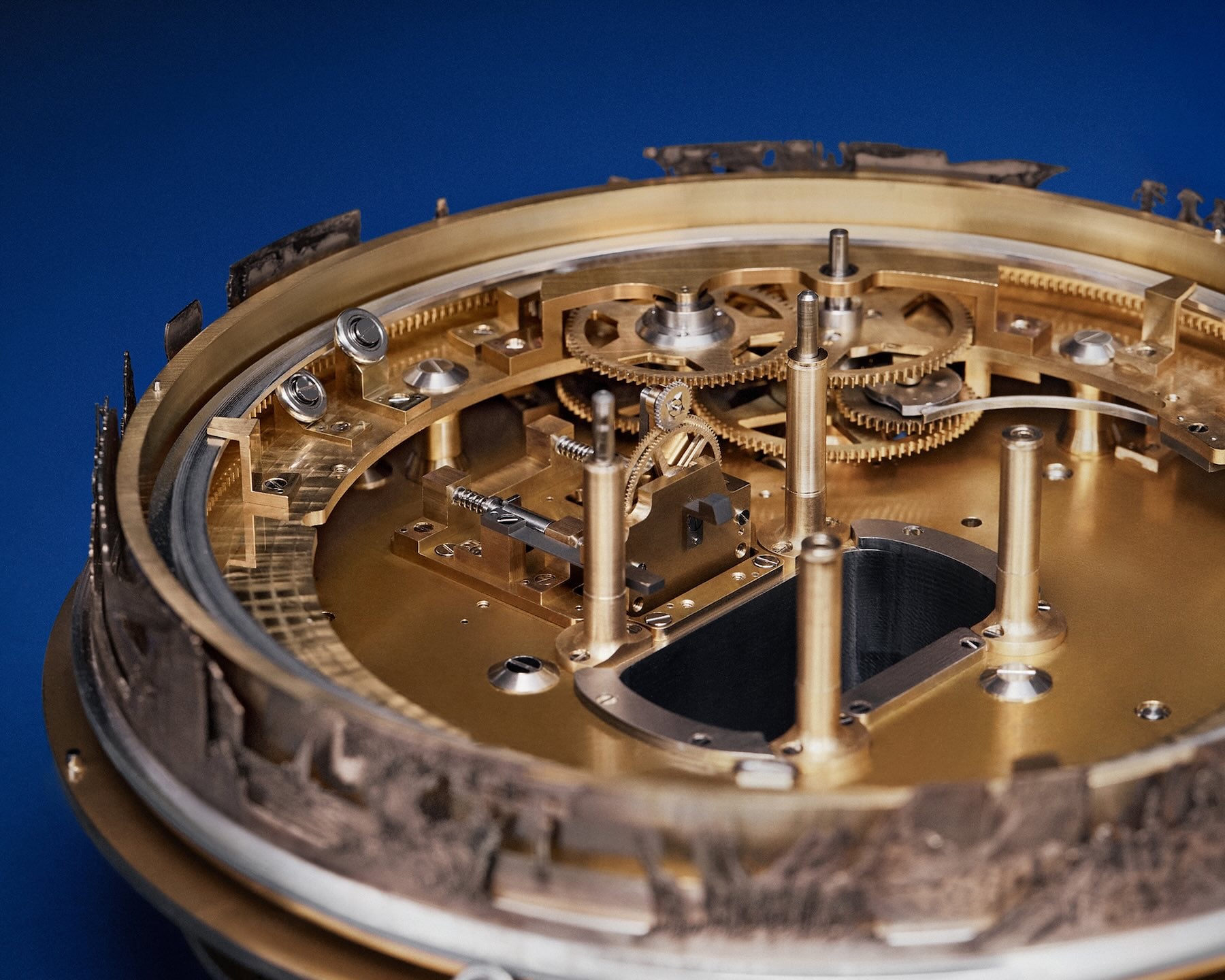 The clock itself is particularly impressive and designed as a marine chronometer on its base, with adjustable orientation. The clock is anchored to a titanium base that is decorated with a marquetry of blued meteorite, and when in its reference position, mirroring a marine chronometer, the clock measures 310 mm in width, 266 mm in depth, and 260 mm in height. For the decorative part of the clock, framing the central element, Denis Flageollet turned to Belgian illustrator François Schuiten, who created three landscapes featuring immersive scenes of exploration. These intricate illustrations are fashioned in 3 separate elements in 5N gold engraved by Michèle Rothen. The dial is made of blued titanium, adorned with a gold-made Miky Way and indicates hours and minutes with triangular hands.