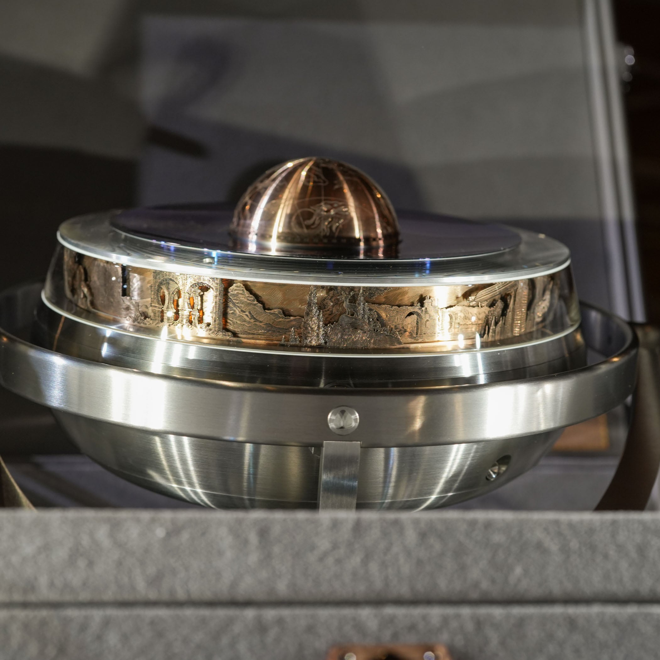 The docking interface – the key to the Sympathique function – is discreetly concealed beneath a domed, engraved cover on the upper tier of the clock. Crafted in rose gold, the dome is adorned with the constellation of Hercules.