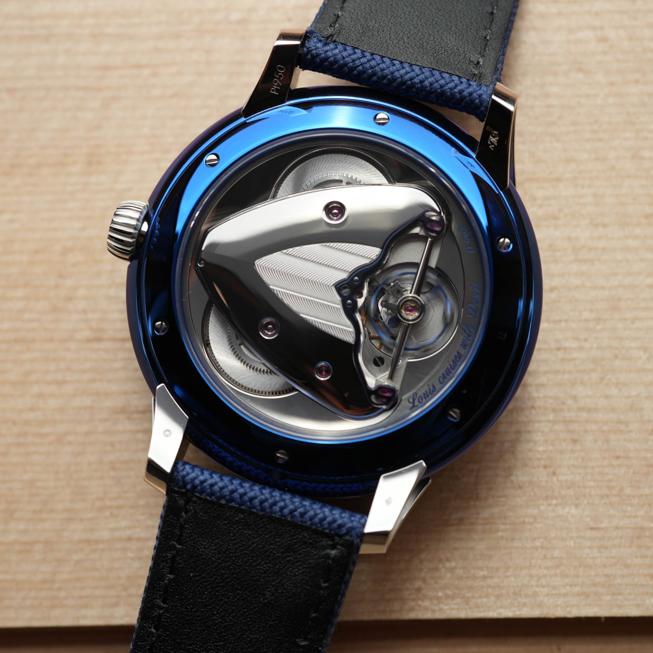 The watch comes equipped with two interchangeable straps, one in blue fabric lined in black leather and an extra-soft cognac alligator strap fully lined in alligator leather. Both straps are secured by a polished blued titanium pin buckle. The wristwatches are delivered in dedicated titanium High Watchmaking trunks, made of titanium with blued titanium corners. A custom leather travel pouch is also included, specifically designed for the LVDB-03 GMT Louis Varius.