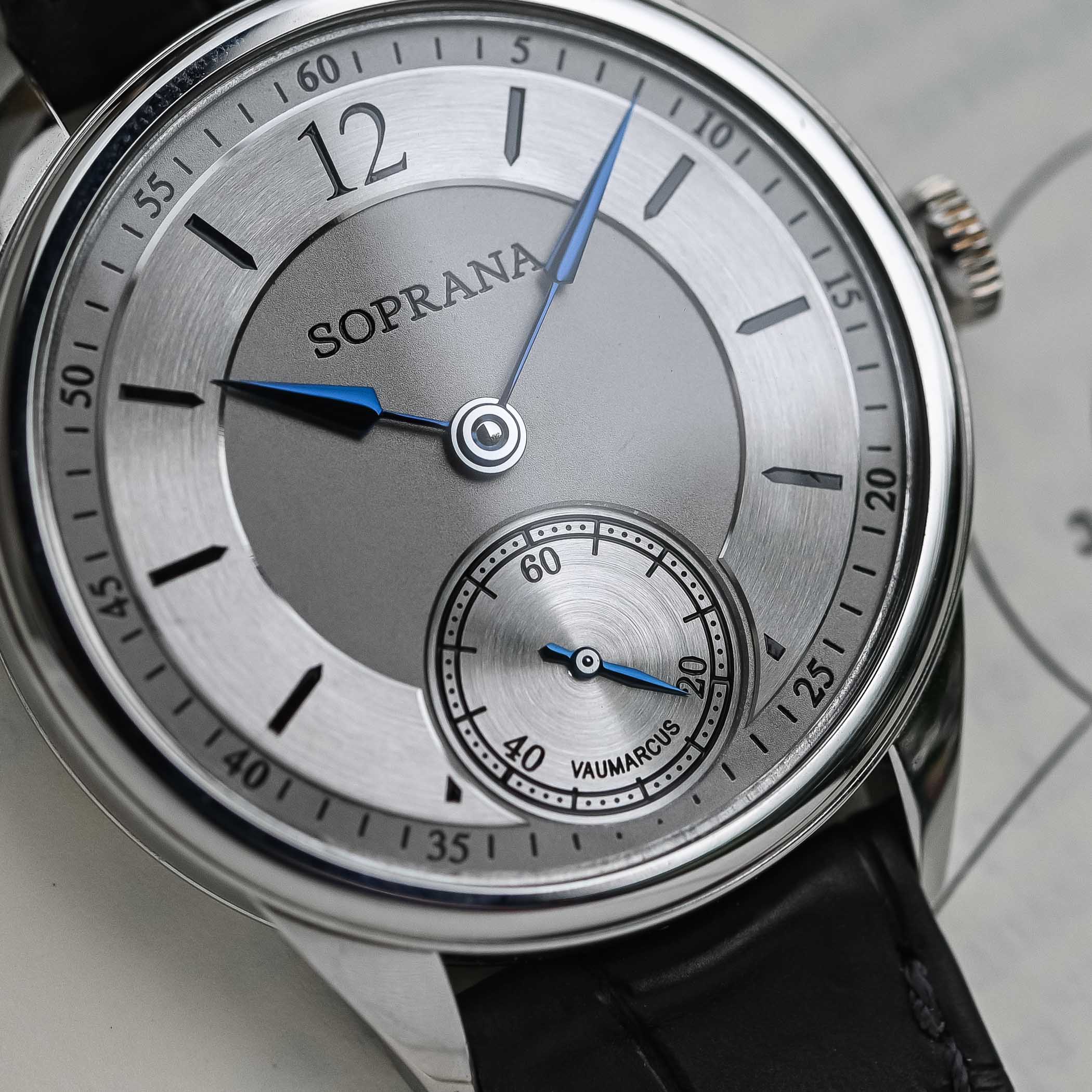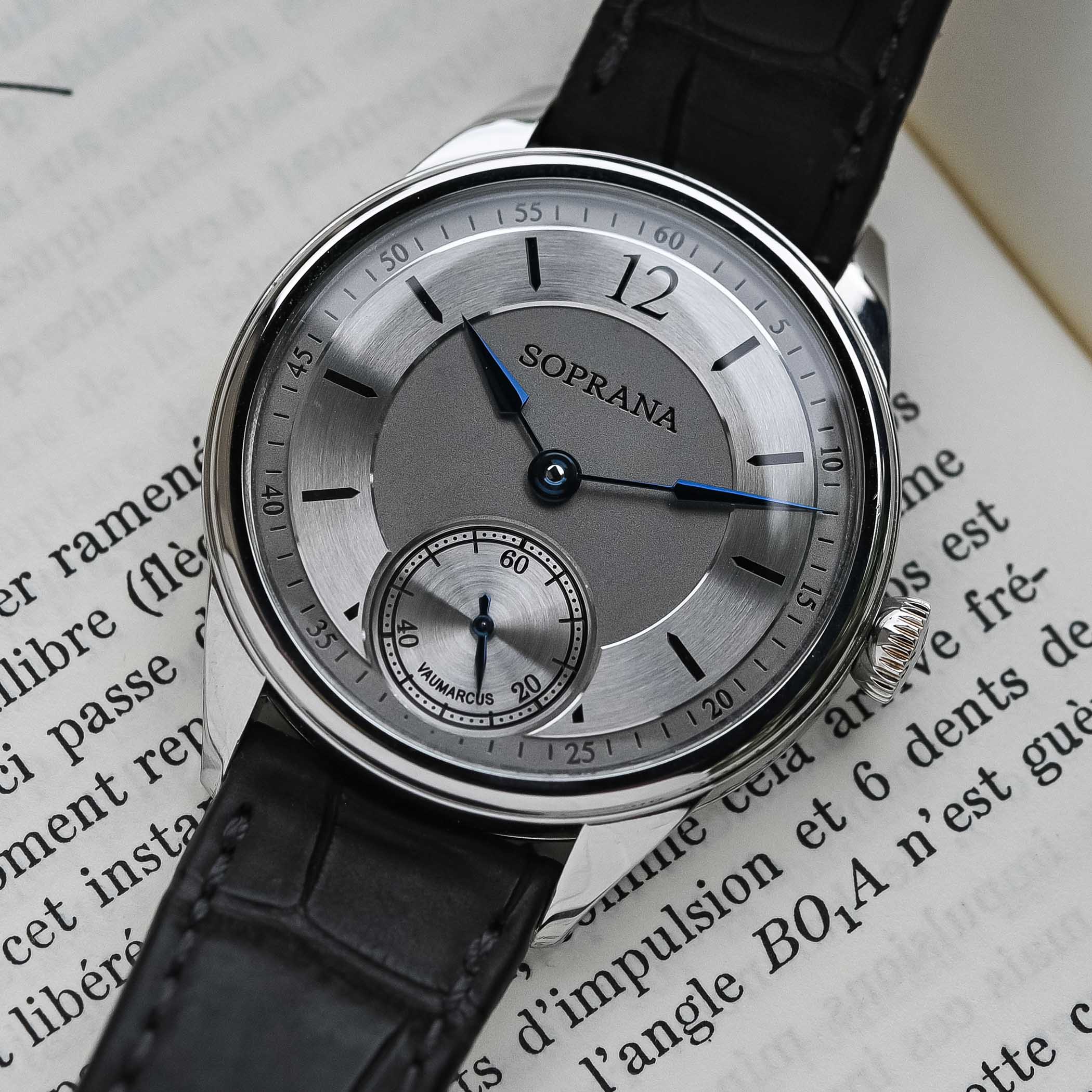 The Soprana Time Only is a pure and minimalist design, with symmetry and linearity as key words, extremely well made but anything but ostentatious. With its sober design, it feels almost Calvinist in its approach, which would almost come as a surprise given Soprana’s Italian origins… The watch comes in a 38.8mm steel case with polished, sloping lugs. The elegant two-tone sector dial is nicely balanced and proportioned with its small seconds at 6 o’clock. It combines ruthenium-plated, finely grained surfaces and circular brushed, metallic areas. Black engraved markings complete its restrained design. The lance-shaped steel hands are flamed blued, and just like the dial, are manufactured in-house.