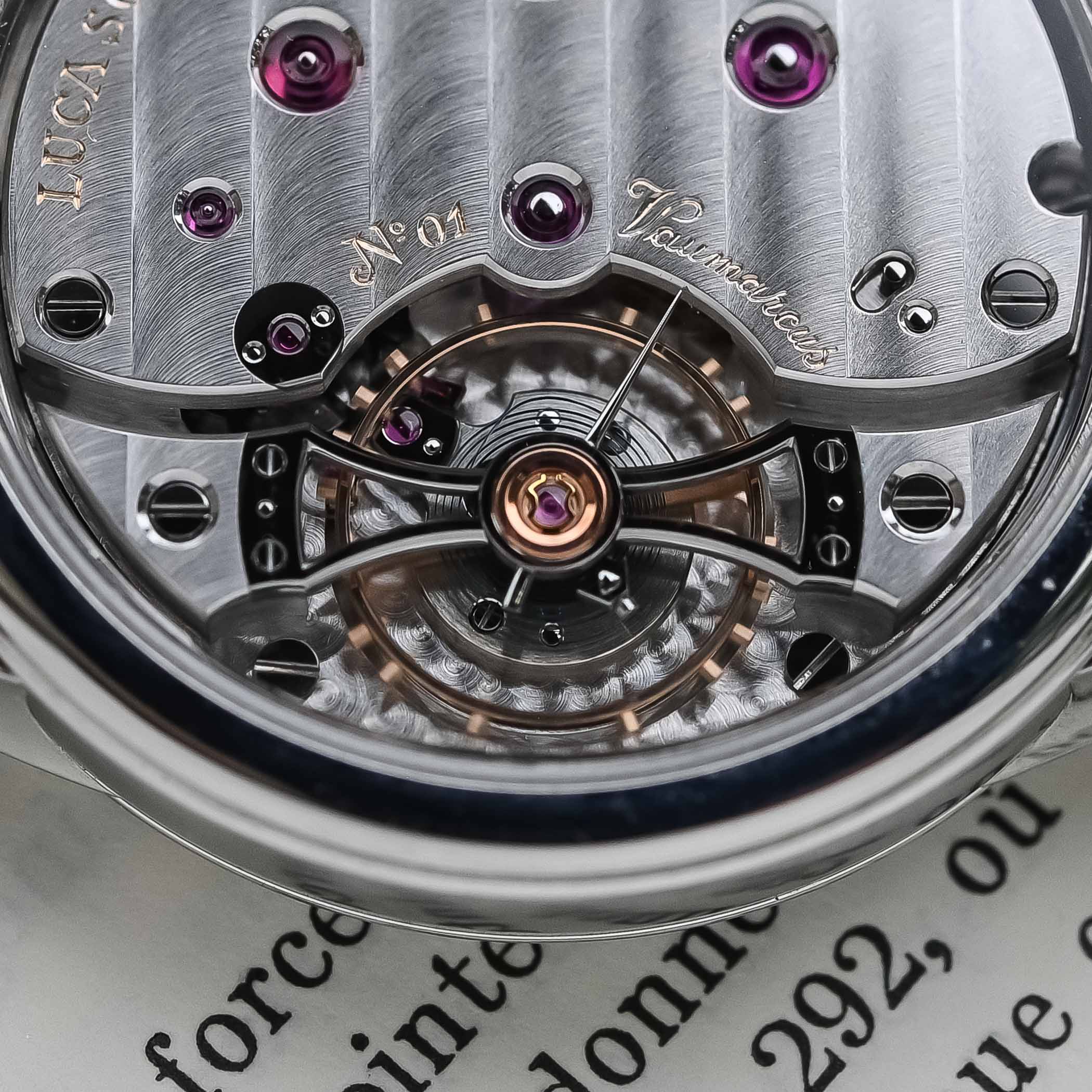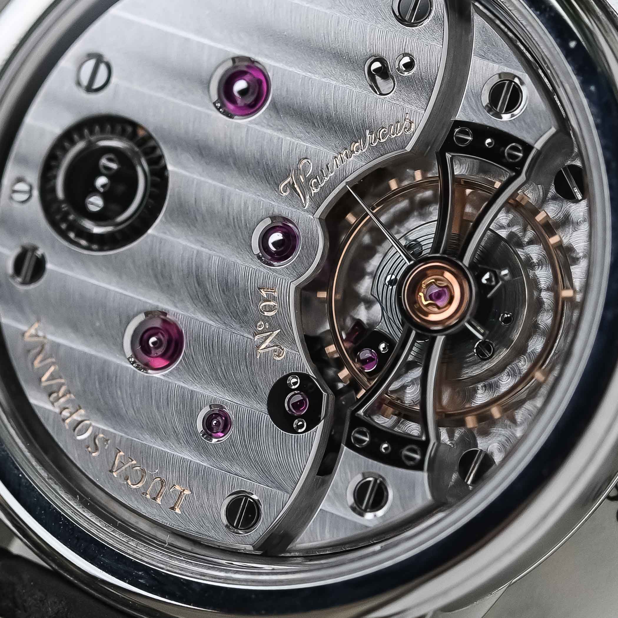 Performed the traditional way, the superb finishes include straight Geneva stripes, superb anglage and black-polished steel parts. The plate and the bridges are crafted from ARCAP (a non-ferrous, non-tarnishing, non-magnetic alloy typically made from copper, nickel, and zinc, and corrosion-resistant, non-magnetic and stable under temperature changes), with the exception of the steel transversal bridge holding in place the balance and perfectly extended by two ARCAP bridges. The integration of the escape wheel cap jewel into a steel setting is another beautiful detail. The captions, Luca Soprana, Vaumarcus and the individual number of the movement are directly engraved on the movement, without using any plates.