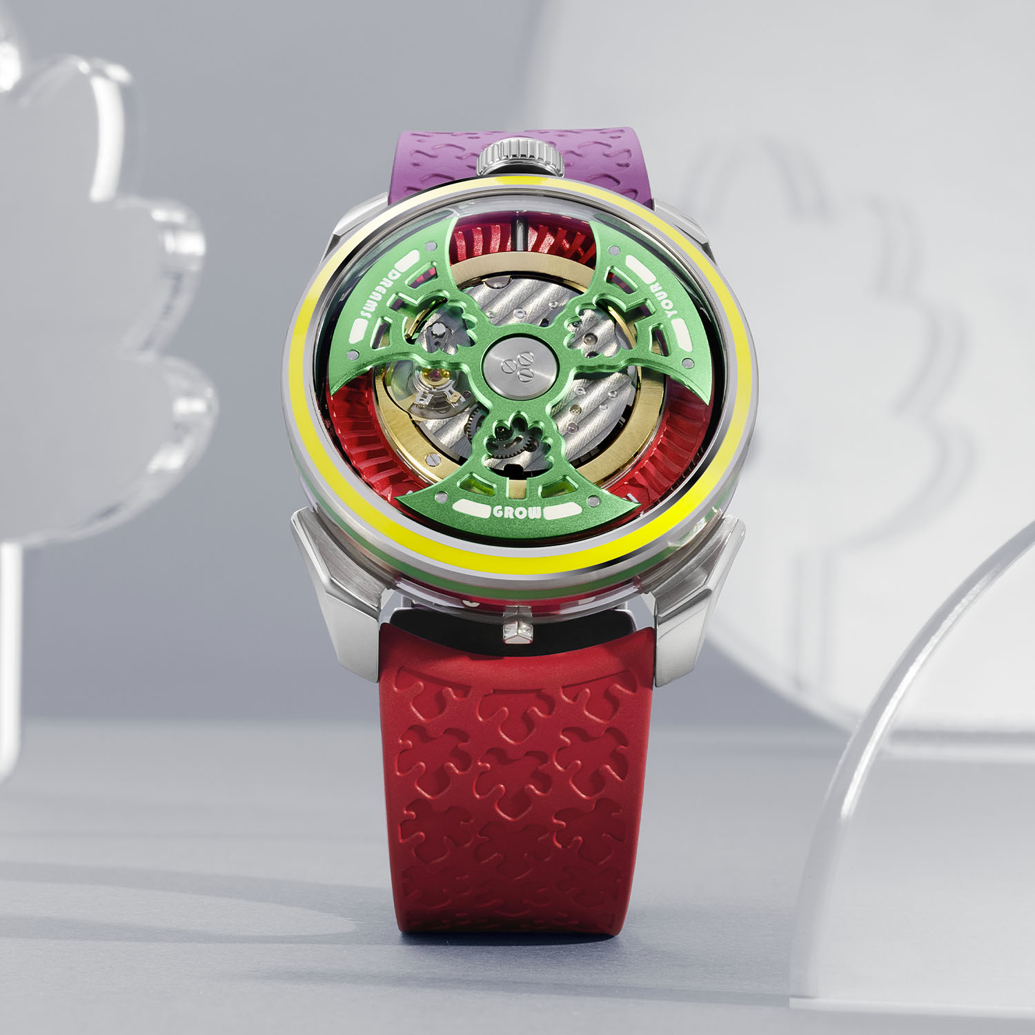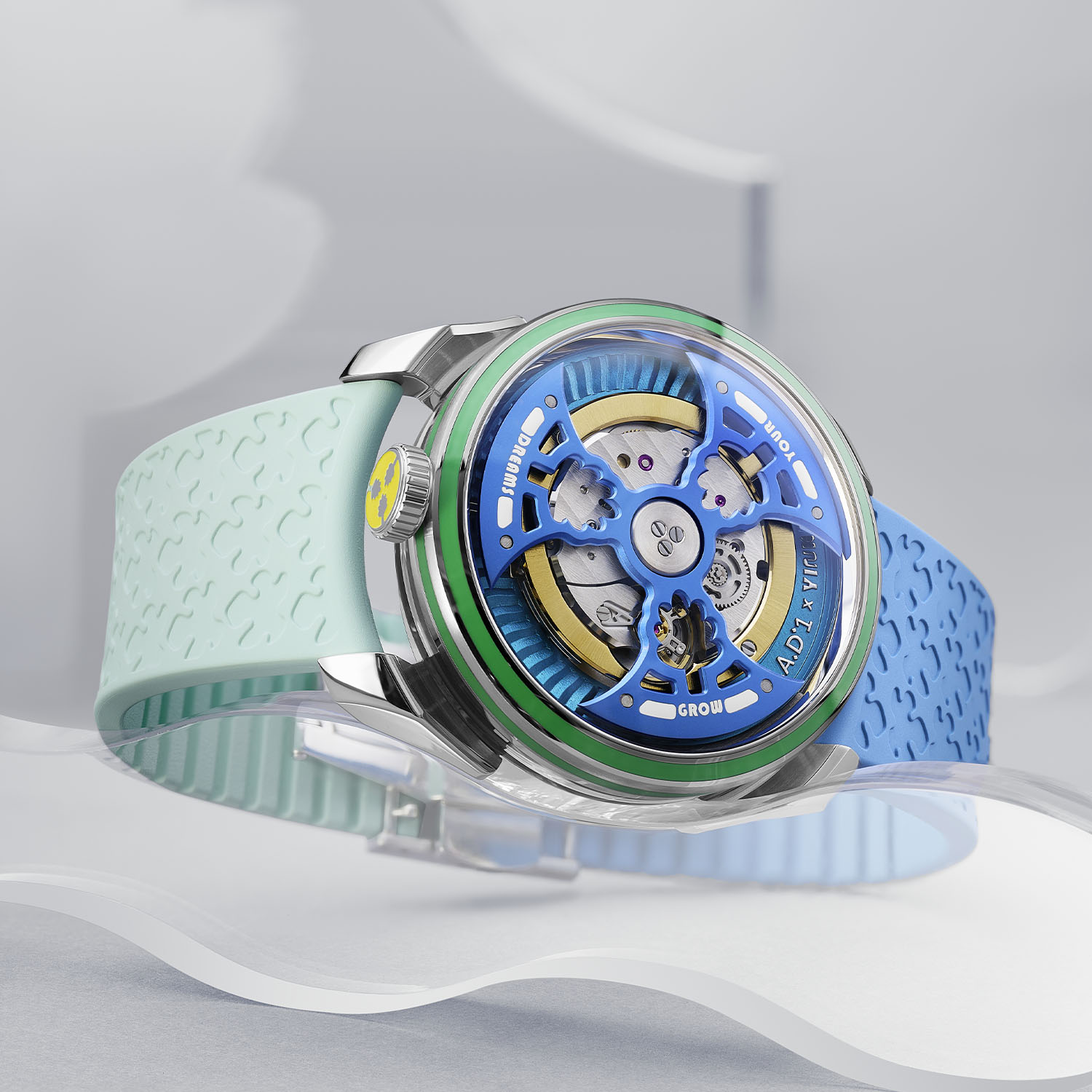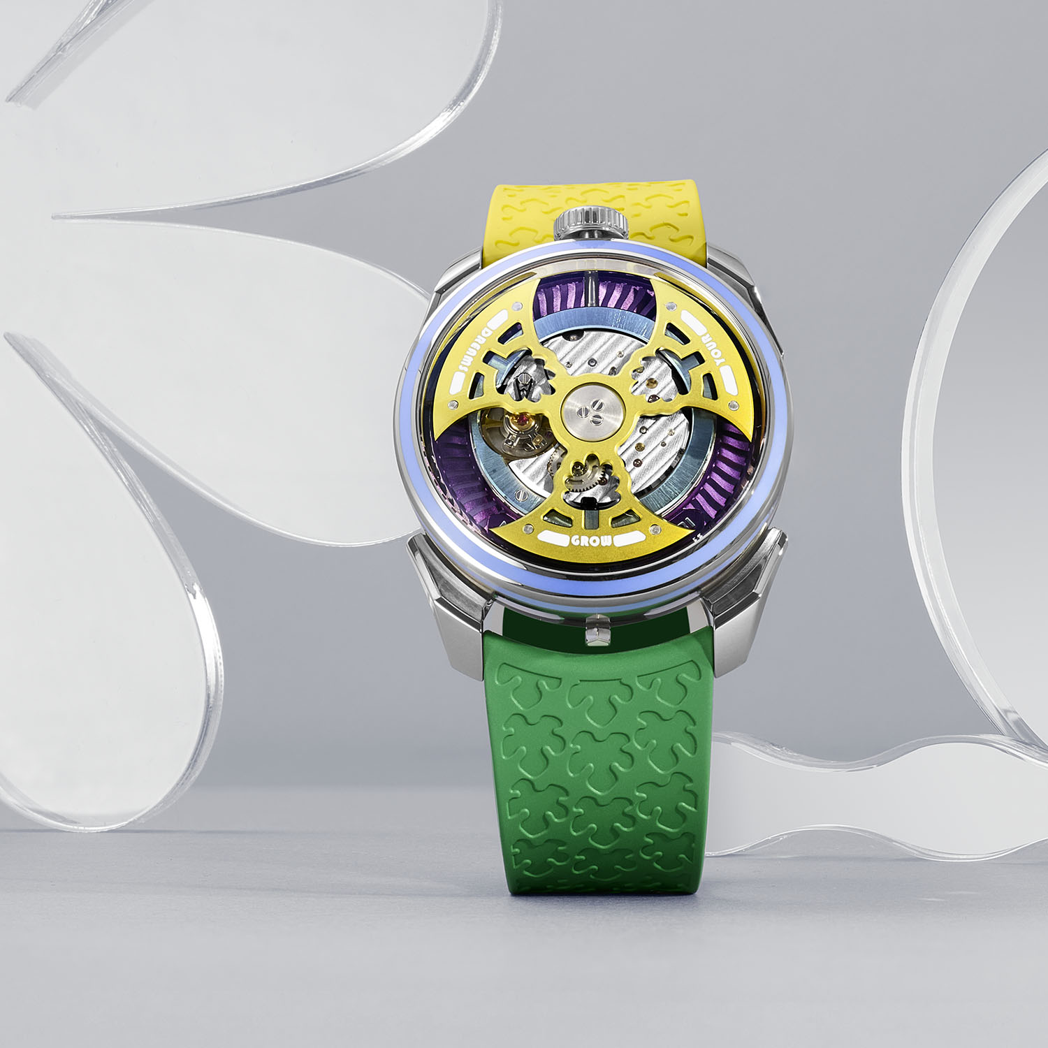 The base remains a barrel-shaped steel case of 42mm in diameter, with a 15mm thickness, a reduced profile that was made possible by switching to a single-sided barrel for the display of the time, instead of two in the inaugural M.A.D.1. The shape of the lugs and caseback, rather impressive considering the price range in which these watches are offered, remains unchanged. Now about the changes… And there are quite a few to report. The M.A.D.1S Grow Your Dreams’ main difference comes from the rotor, in plain sight on the front of the watch. Made of titanium, it undergoes anodization to transform its colour, allowing the creation of three vivid hues: yellow, green, and blue. The shape has also been reimagined, now slimmer and more intricate, without compromising its signature high-performance rotation. Each blade is precisely milled with a tree motif, a symbol of hope and growth.