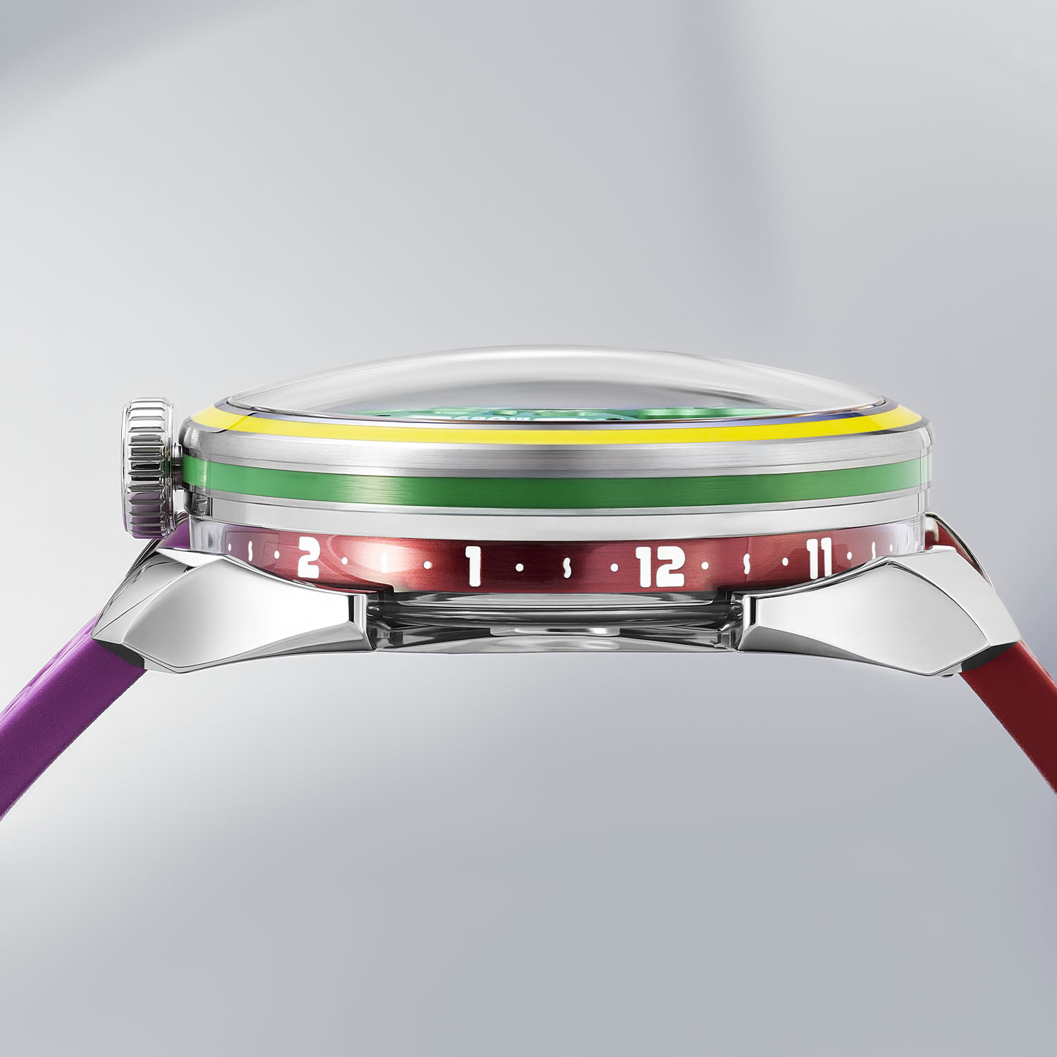 Framing the sapphire crystal on top is a bezel that now incorporates colours, but instead of relying on conventional PVD coatings, a precision-machined groove is filled with HyCeram, a high-tech liquid ceramic that hardens through heat and is then finished with hand-polishing. To complete the rainbow of colours, the aluminium baseplate features stamped textural waves that ripple under the movement with a 3D effect.