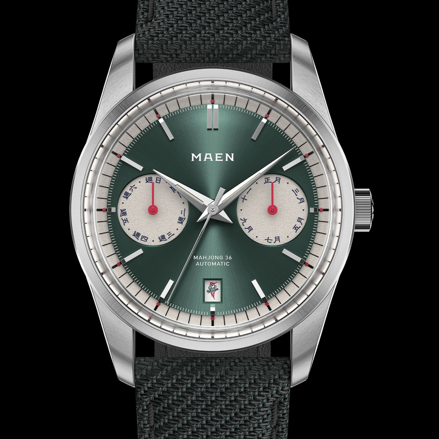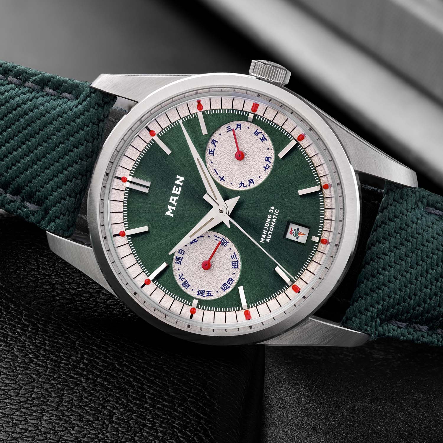 The dial is where most of the transformation takes place, utilising a colour palette that echoes the classic Mahjong colours (green, red, blue, and white) while maintaining the watch’s understated texture. The base of the dial is green-toned and features recessed silver-toned and grained sub-counters, as well as a pan-pie-like minute track. The calendar indications replace classic Arabic numerals and Occidental words with Traditional Chinese characters for the month and day of the week displays. Several Easter eggs can be found: the first lunar month (Zhengyue) is deliberately aligned with the Gregorian month of January, a nod to the Chinese New Year. The date wheel has also been customised, revealing the “1-Bamboo” (the Bird) on the 1st of the month, and the Green Dragon “Fat” symbolising wealth, on the 8th.