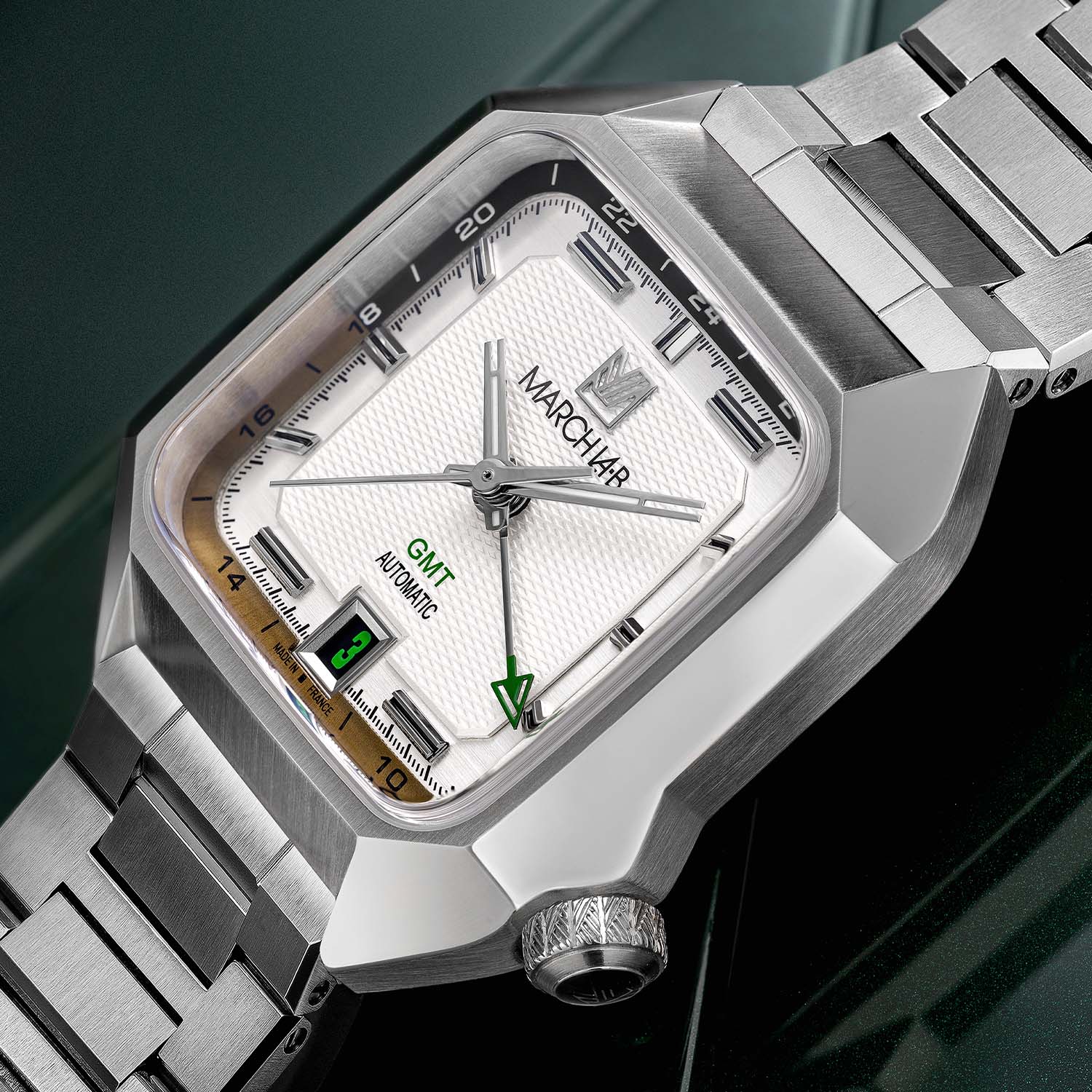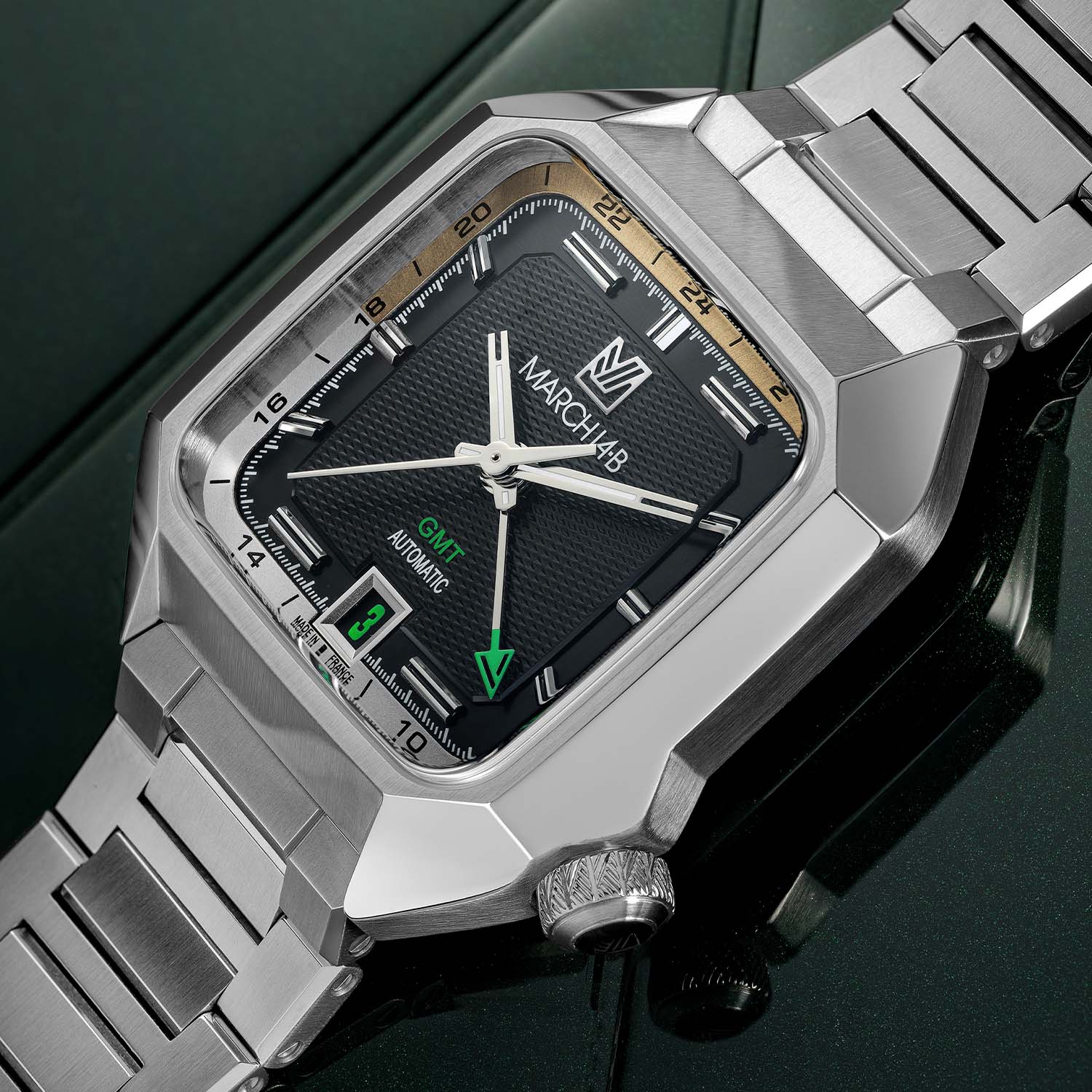 The LA.B component of the brand name does not allude to a laboratory but to the residences of the founders. Designer Jérôme Mage lives in Los Angeles, and CEO Alain Marhic and financial advisor Joseph Châtel in Biarritz; the name March responds to the month in which all three founders were born and appears in green on the date wheel once a month. With a nine-hour time difference between Los Angeles and Biarritz, the office GMT function makes sense in March LA.B’s universe.