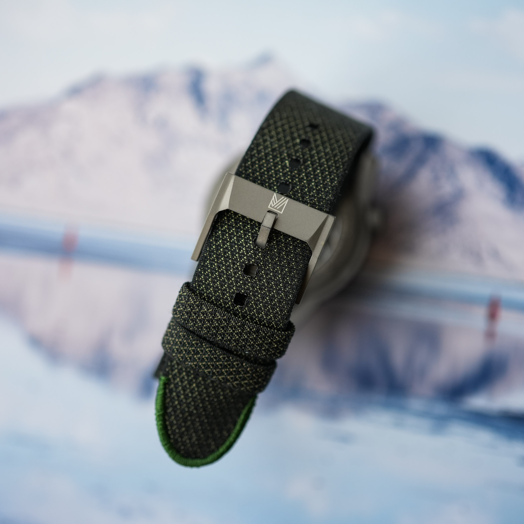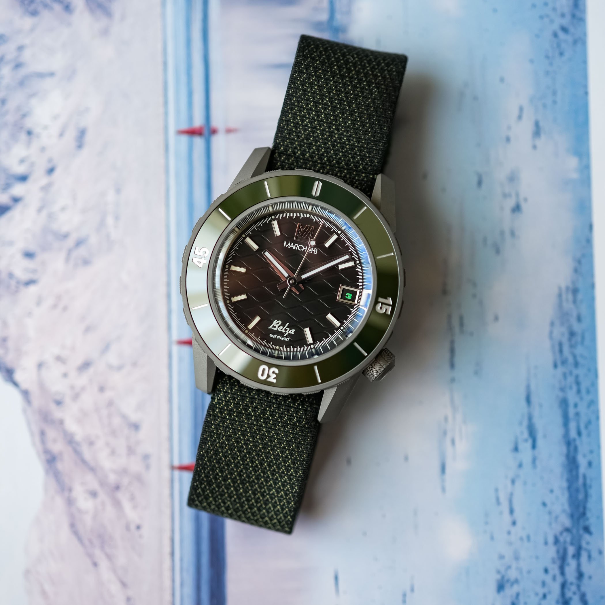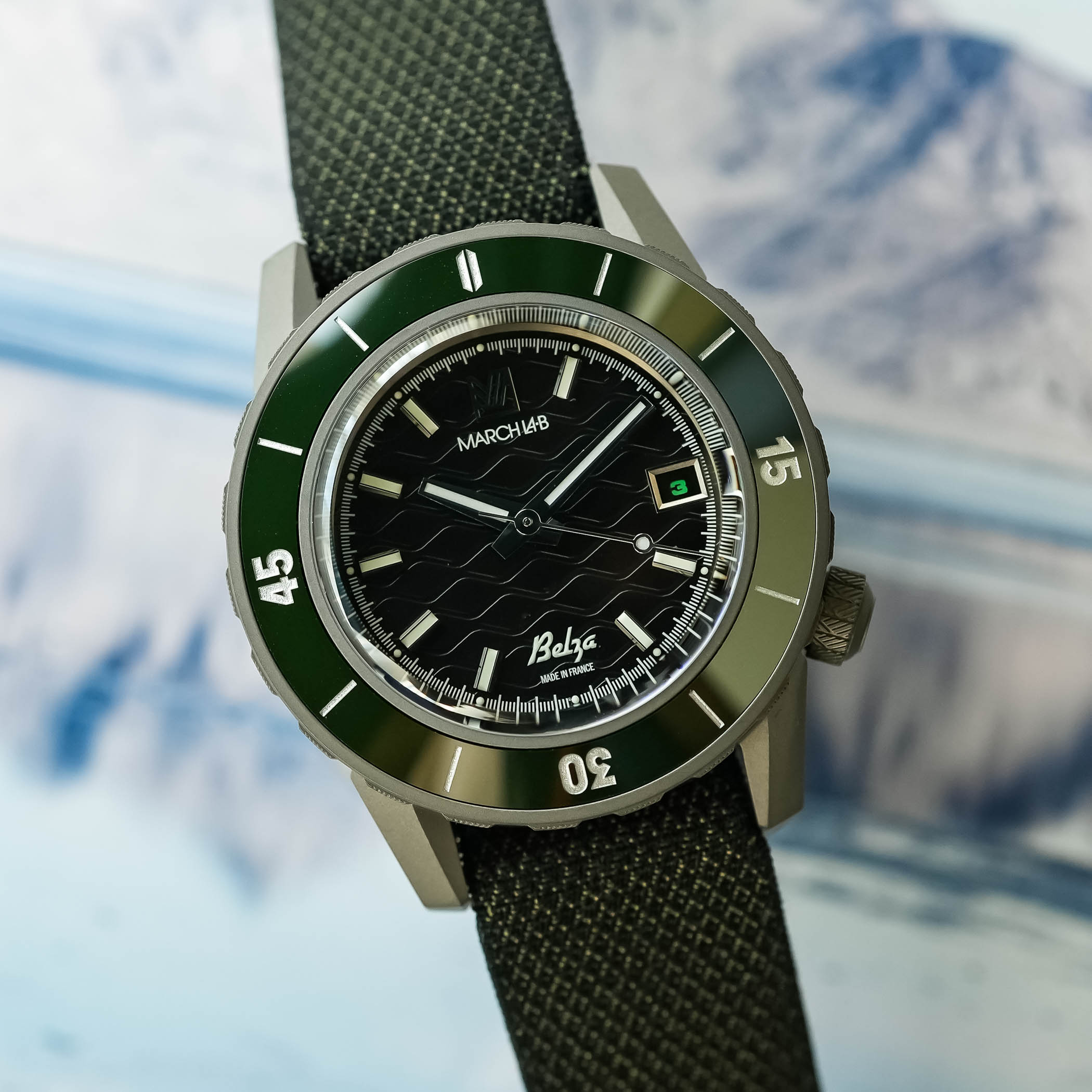 Proud of its French roots, the Belza is paired with a khaki-green jacquard strap woven in France by Manufacture Julien Faure and a titanium pin buckle. The watch is a limited edition of 99 pieces and retails for EUR 2,195. More information at march-lab.com.
