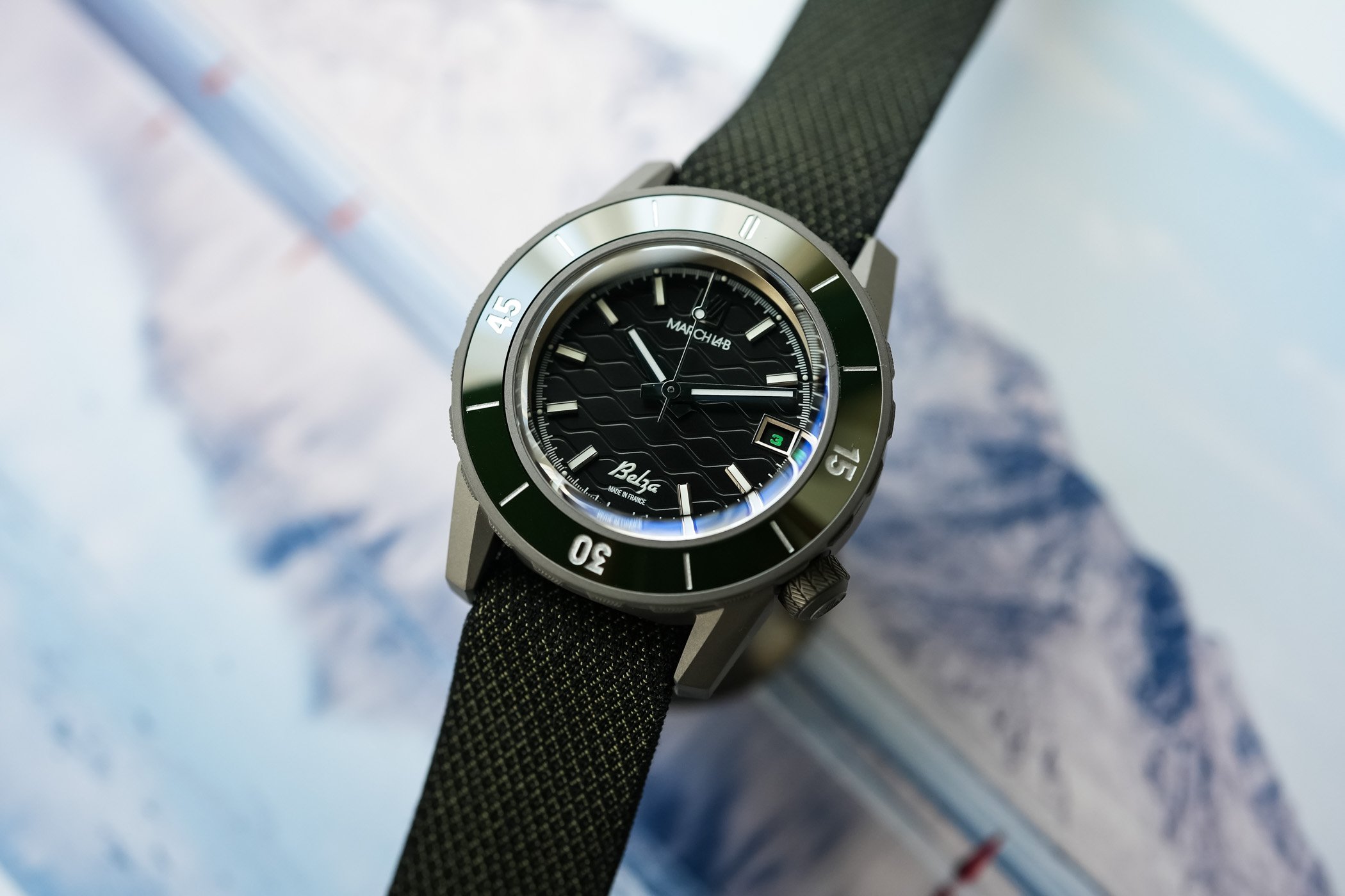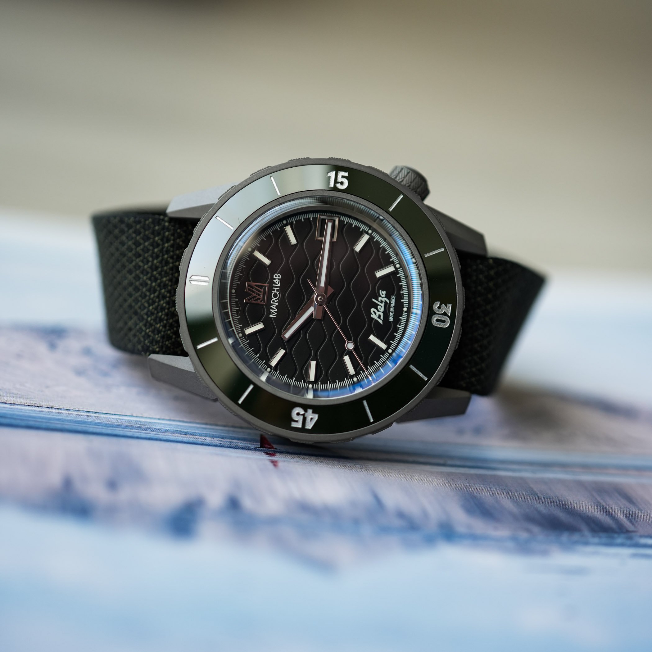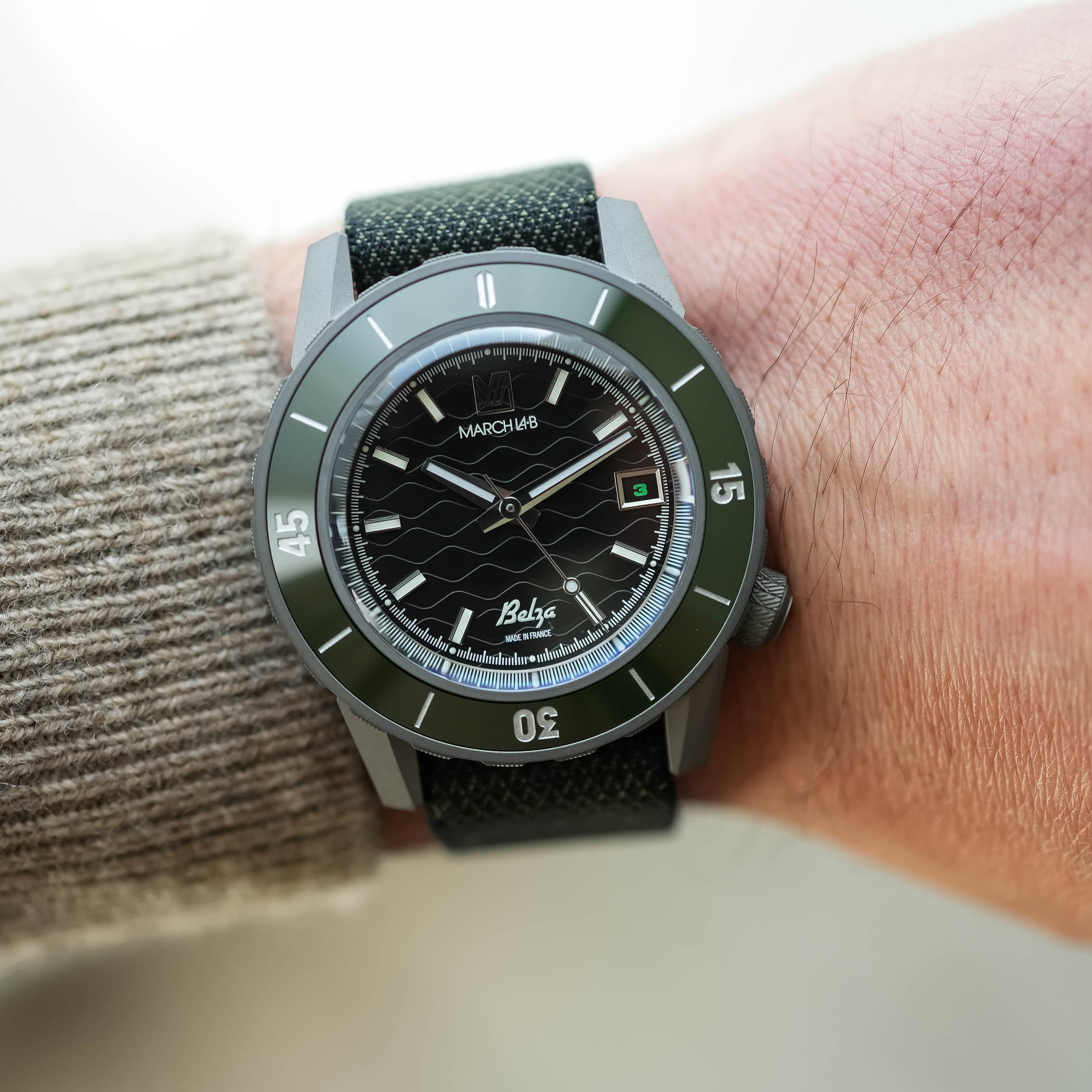 The sandblasted black dial is embossed with a series of horizontal waves with applied steel indices filled with white Super-LumiNova. The blunt-tipped hour and minute hands, as well as the circle on the lollipop central seconds hand, are also luminous. The brand’s M logo at noon and the watch name, followed by Made in France, are printed in white on the dial. Completing the functions, the framed date window at 3 o’clock has a matching black background and a bright green number “3”, a nod to the brand’s name, which is the third month of the year.