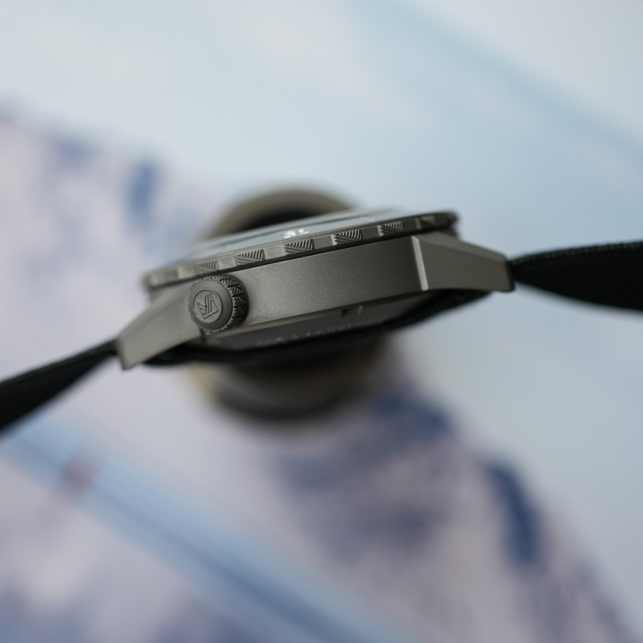Built for outdoor sports, the 40mm case has a chunky 14.5mm profile, all the better to withstand knocks and blows. Crafted in grade 2 titanium, the 200m water-resistant case is brushed for a sportier appeal and features an engraved screw-down crown at 4 o’clock with the interlaced lines of the brand’s M-shaped logo. Moreover, the notched grip on the bezel also features this crisscrossing pattern.