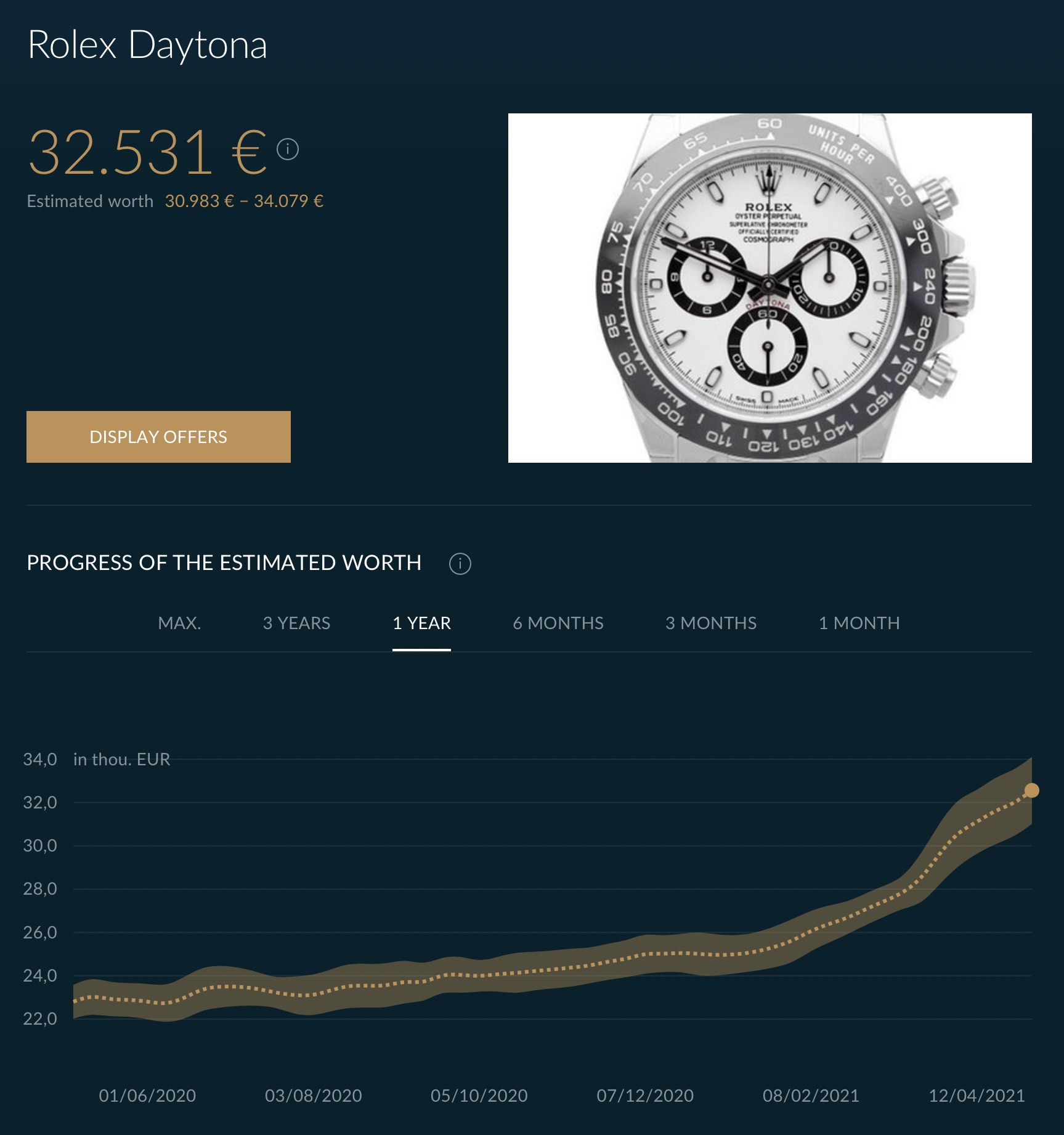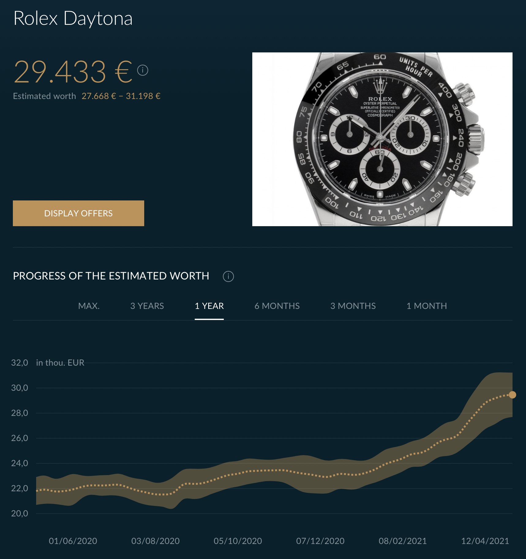 Looking closely, here’s what you’ll get when using the tools offered by Chrono24 – which, I must say, are very practical. Let’s start first with the most coveted of the two steel Daytonas, the white dial edition (prices in EUR and USD)