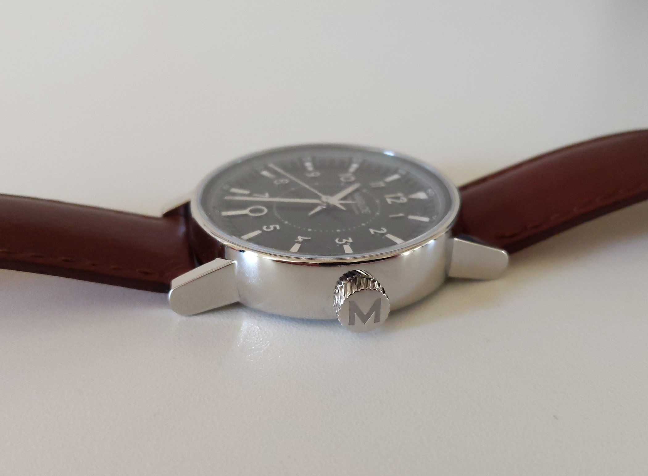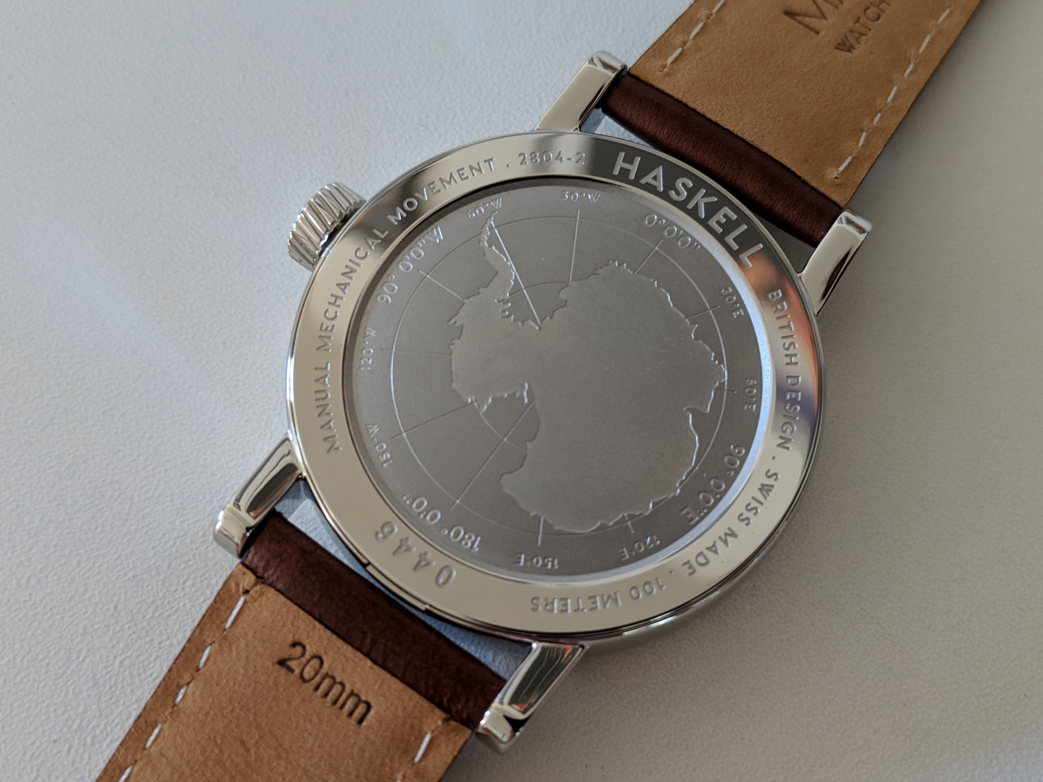 It’s a one-piece case that should prove to be very durable and is water-resistant to 100m. The back of the case has an image of Antarctica engraved in the central portion, which has been machined down to form a slight recess. I usually prefer exhibition casebacks, especially with hand-wound ETA movements, but this homage paid to a celebrated explorer is well executed. The crown doesn’t screw down (although the 100m water-resistance is respectable) and has a large M engraved on the end. It seems a bit larger than the norm, but makes winding a joy and doesn’t look out of place. Overall, the case is simple and elegant, and I really dig the barrel profile.