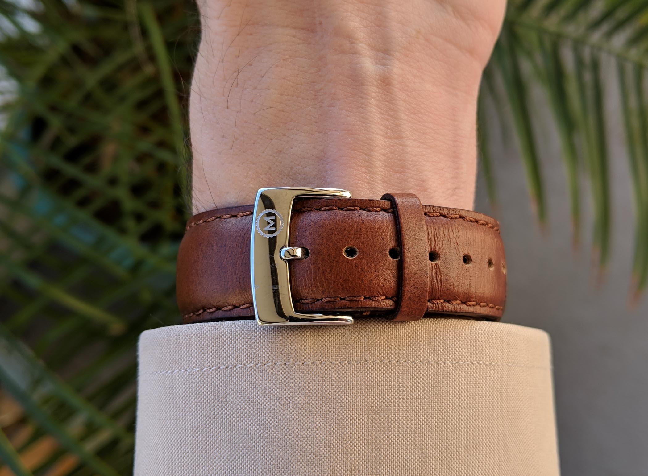 The green Haskell comes with a 20mm brown Barenia leather strap with a stainless steel buckle. Three other options are available, including a darker brown, black or tan Barenia leather. It’s padded, but not overly so and feels comfortable out of the box. No break-in period required. Marloe’s logo is stamped on the right side of the buckle, which is another nice attention to detail. The strap isn’t equipped with quick-release levers, which I wish was a standard feature on all straps, but I have no desire to swap this one out.