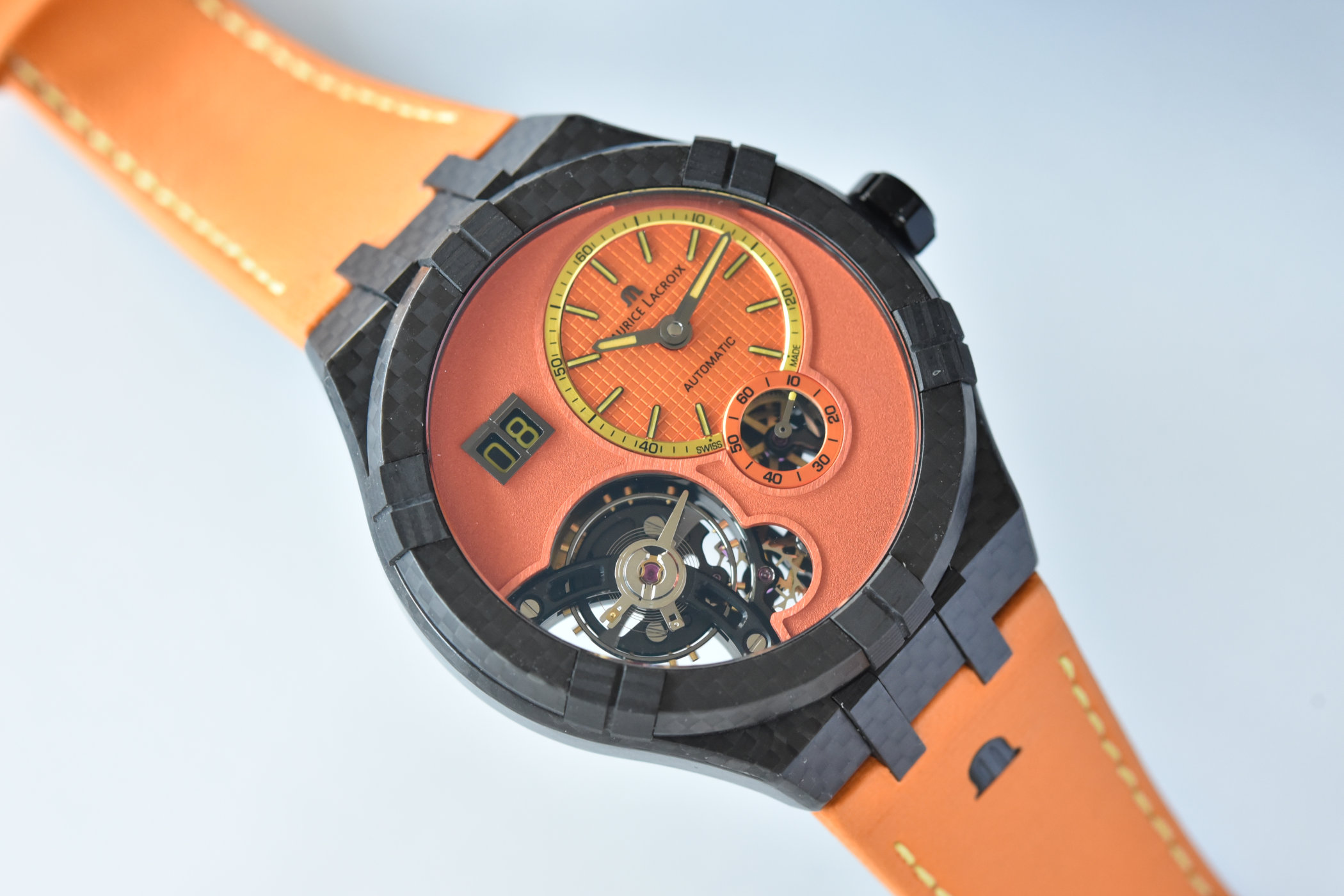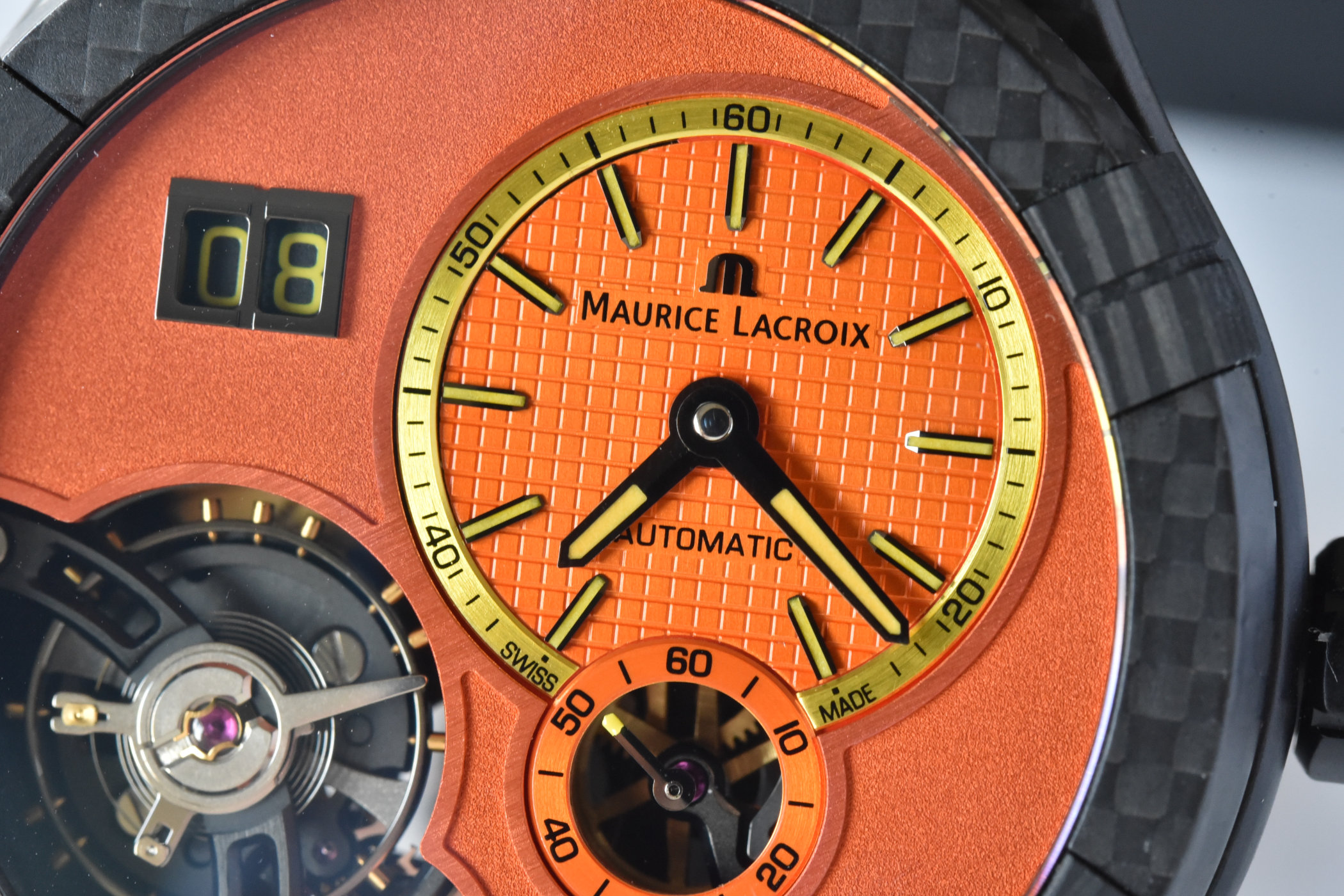 The main features of the watch are the reversed escapement, visible between 6 and 9 o’clock, and the big date display set above that. To tie everything in with the carbon fibre and orange theme, parts of the escapement are finished in black, and the big date display uses black discs with contrasting yellow numbers.