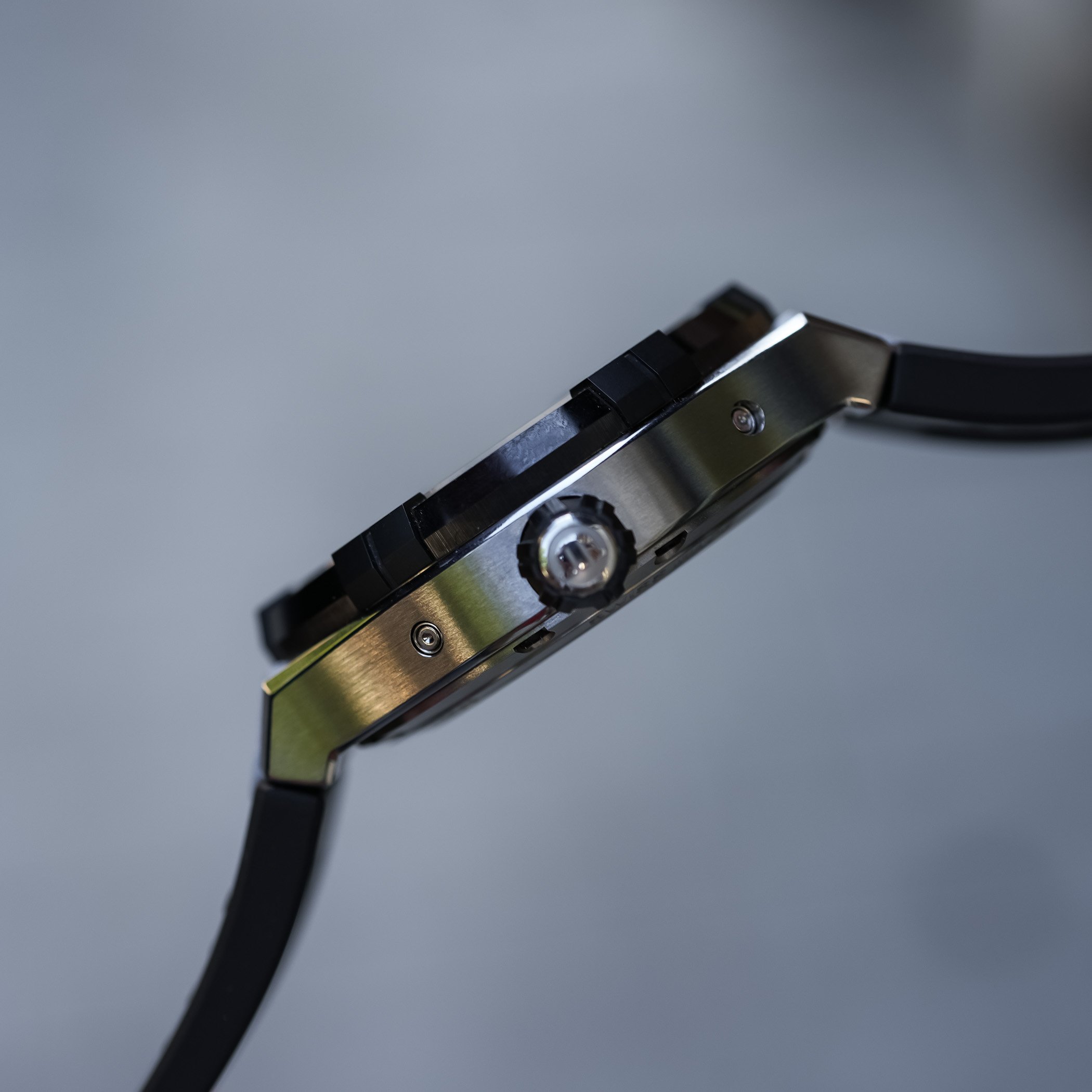 Given the copious amount of information and action on the dial, the layout is reasonably legible, though the openworked areas introduce a degree of distraction. The three hour markers, applied at 8, 9 (barely) and 10 o’clock and the central hour and minute hands are treated with Super-LumiNova. A nice design detail, the blunt-tipped hands and indices echo the bezel’s claws.