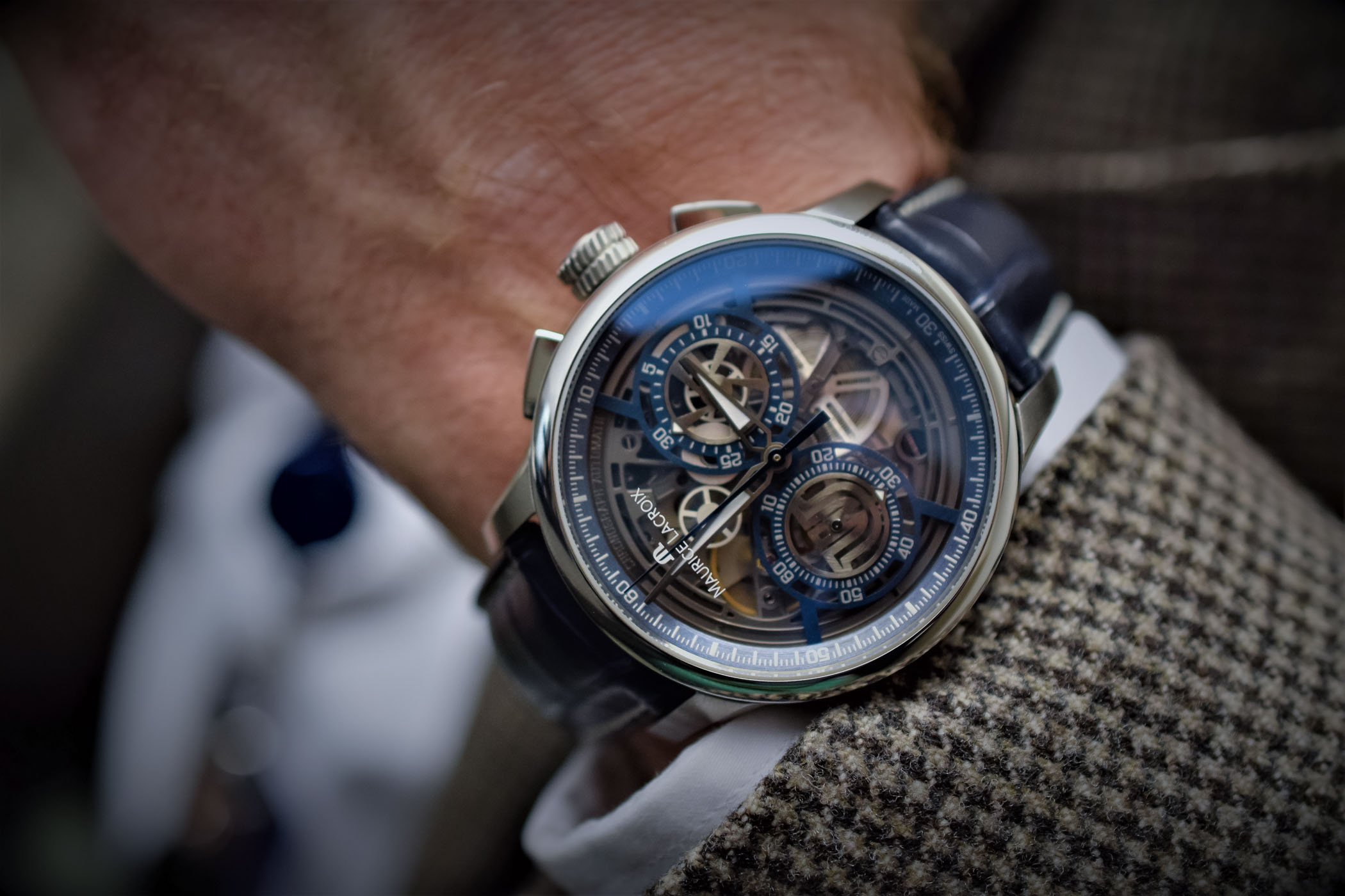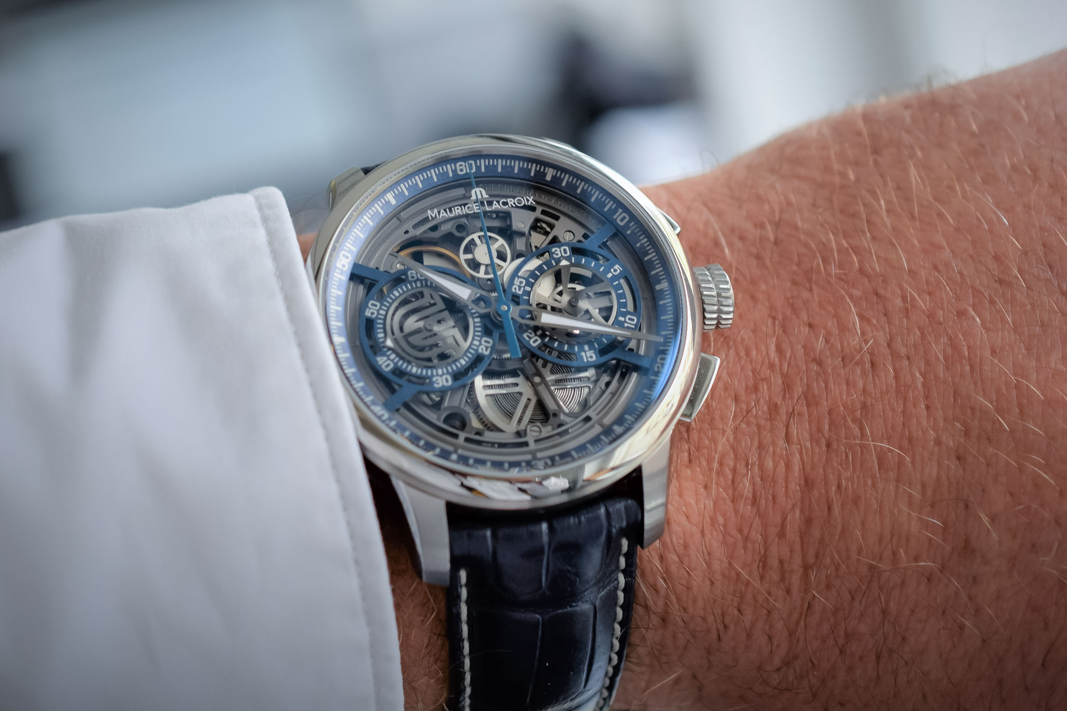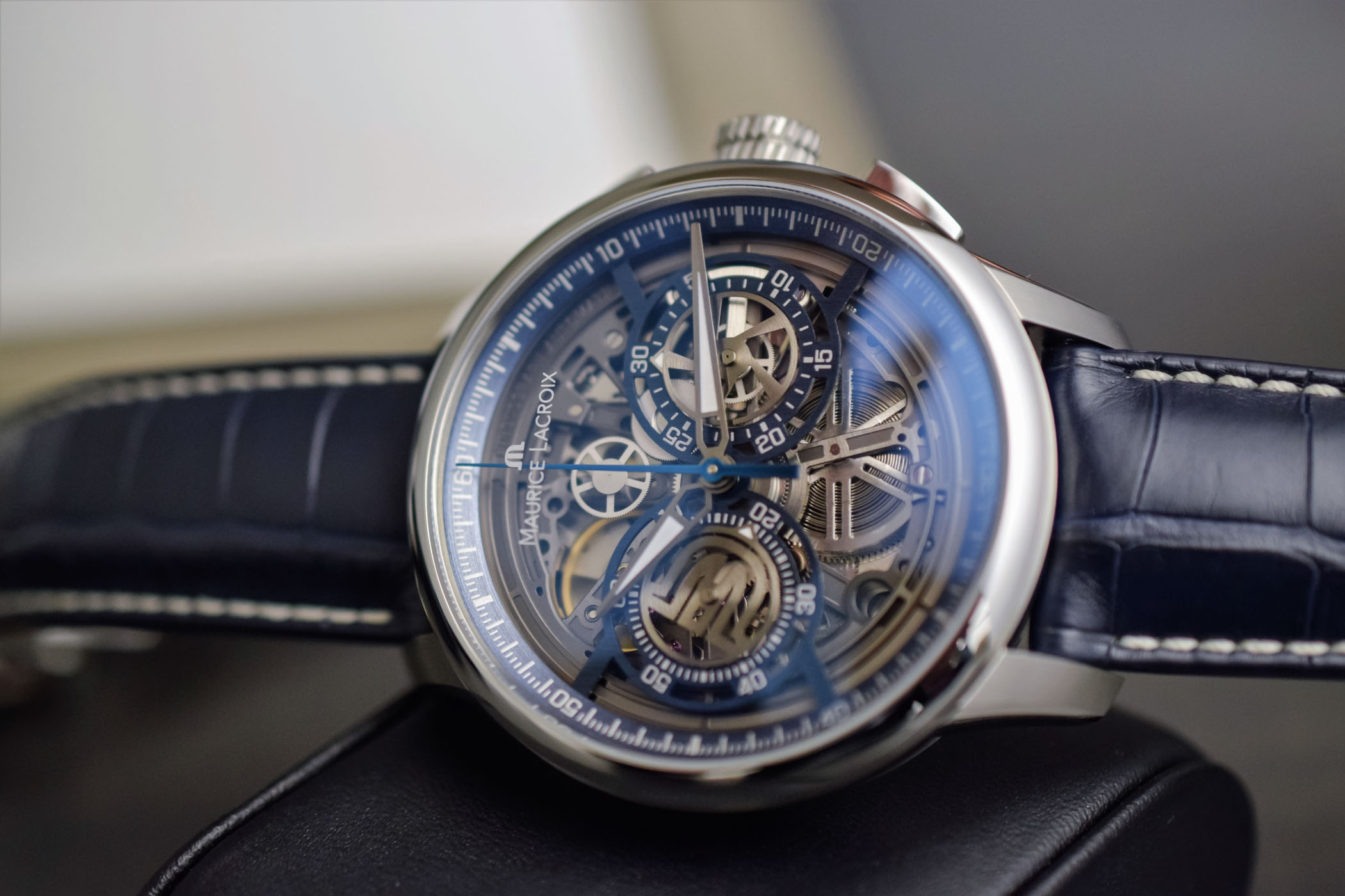 The Maurice Lacroix Masterpiece chronograph is paired with a blue alligator strap and fitted with a security steel folding buckle for the steel version and pin buckle for the PVD-steel limited edition.