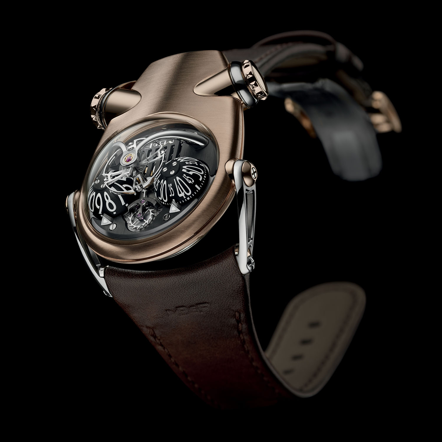 The main technical feature of the watch is the eye-catching suspended balance, which first appeared on the Legacy Machine No1 and found its way into most of the LM watches, as well as the HM9 – yet in a less obvious way. Underneath the central sapphire crystal dome is the oversized (14mm) flying balance wheel beating at the traditional cadence of 2.5Hz, the escapement being relegated to the movement’s mainplate, yet fully exposed between the time displays.