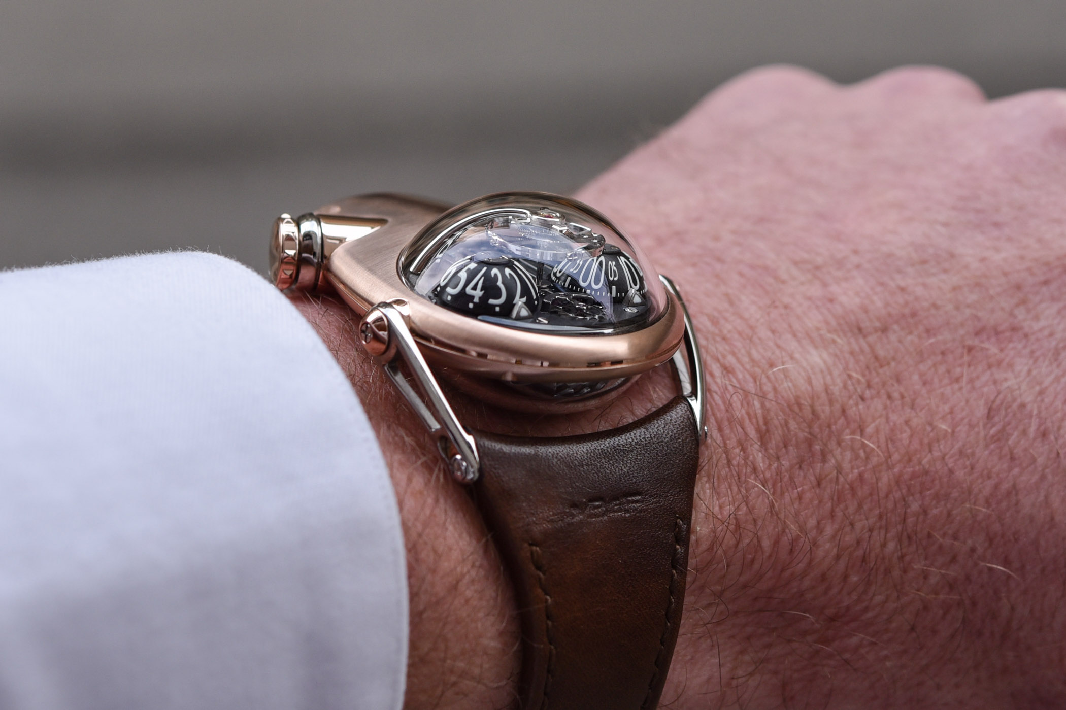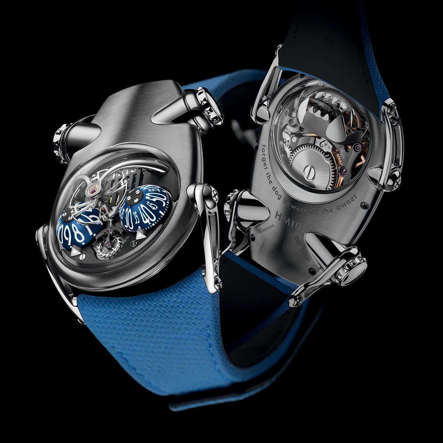 The case is asymmetrical and designed to be seen by its wearer only. This means that the display is positioned right in front, protected by two highly domed sapphire crystals. Underneath are signature domed time displays, one for the hours, one for the minutes, which are a clear tribute to the HM3 Frog. These paper-thin aluminium eyes are topped by yet another classic element of MB&F watches, the floating oversized balance wheel held in place by an arched bridge, rounded and polished. Its presence is more surprising in this HM context, as it is usually the apanage of the LM collection. But knowing the more organic feel of this HM10 Bulldog, it makes sense here – and we won’t complain because it looks fabulous anyway.